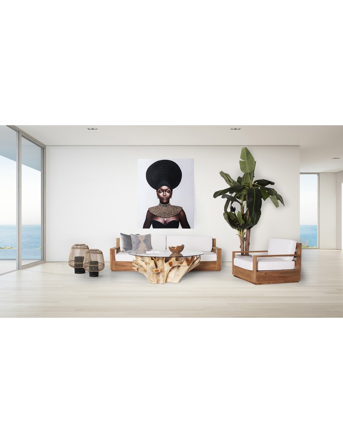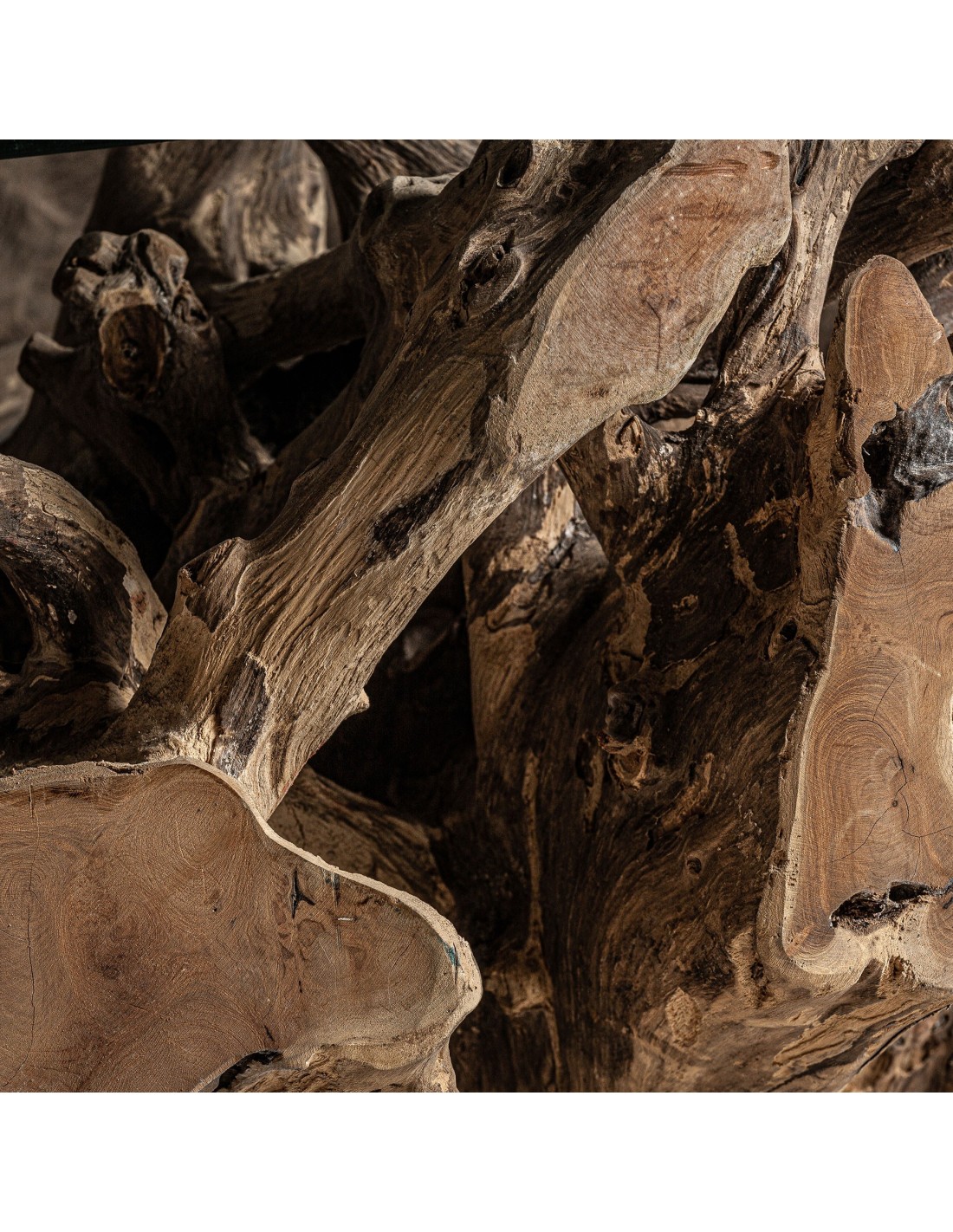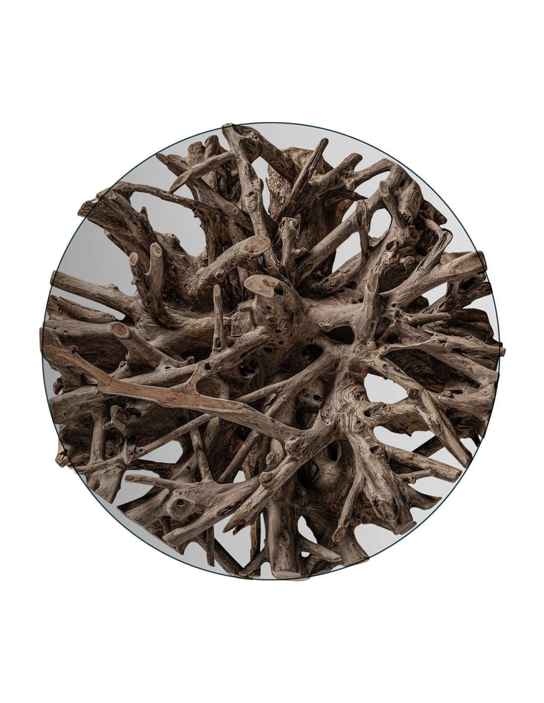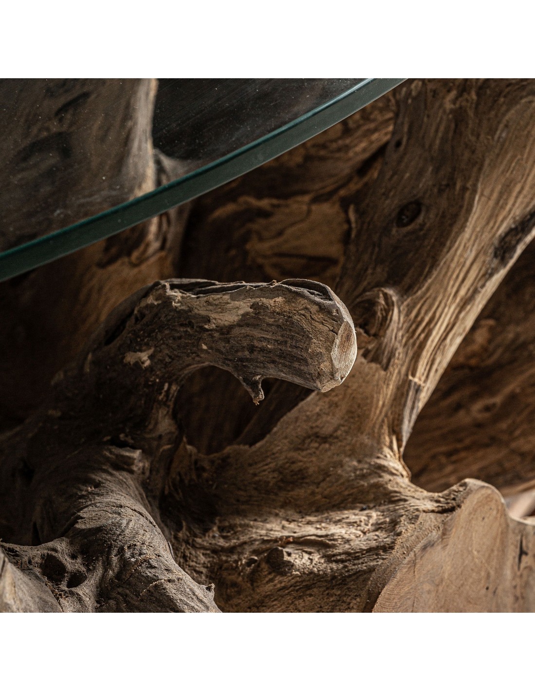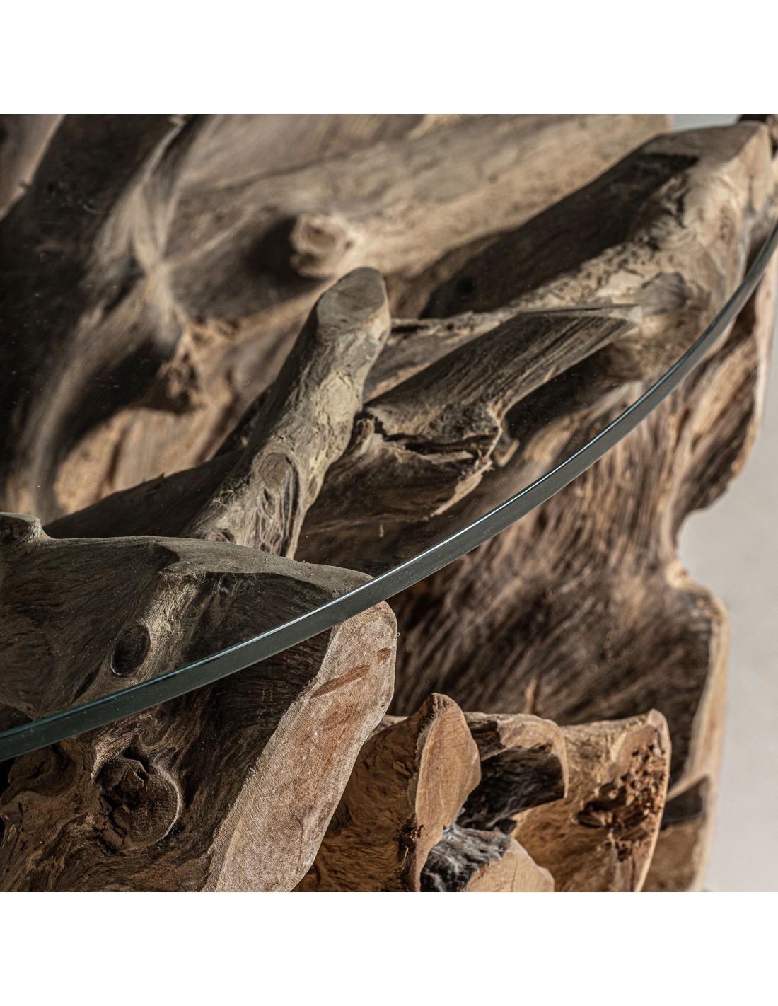 MESA DE CENTRO REDONDA GUELMA, EN COLOR MARRÓN, DE ESTILO ÉTNICO. FABRICADO EN MADERA DE TEKA, COMBINADO CON CRISTAL.