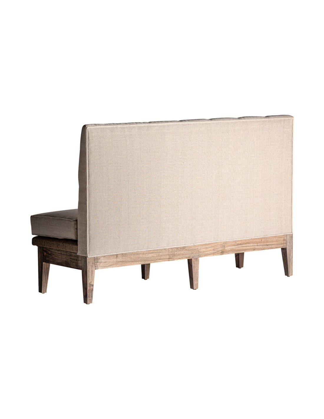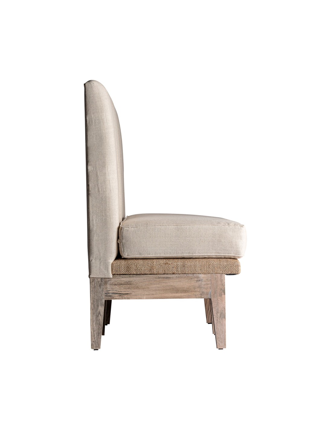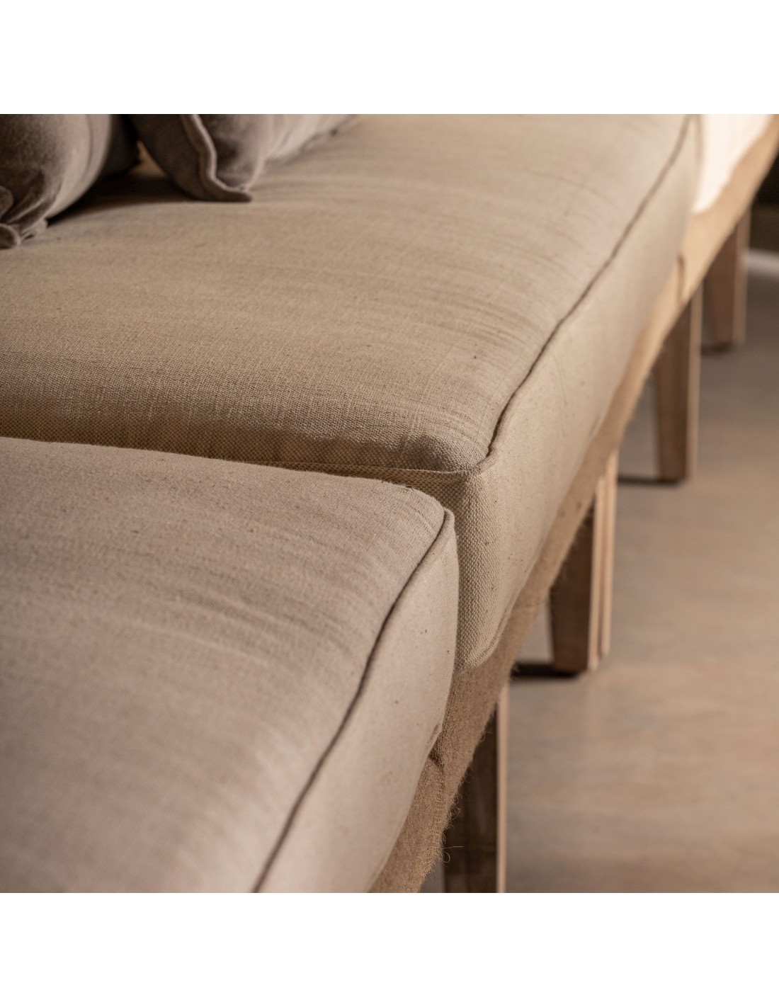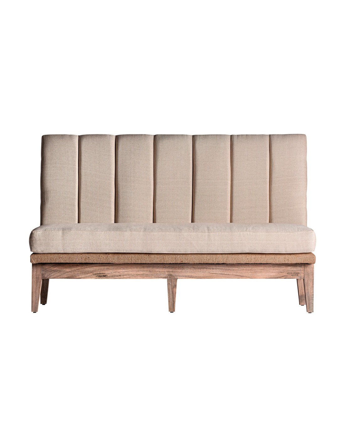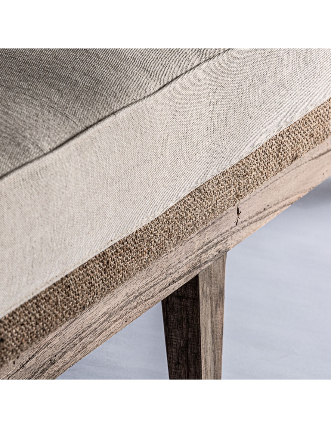 SOFÁ BAR RETZ, DE ESTILO PROVENZAL. FABRICADO EN MADERA DE TEKA, EN COLOR BLANCO ROTO, COMBINADO CON LINO.