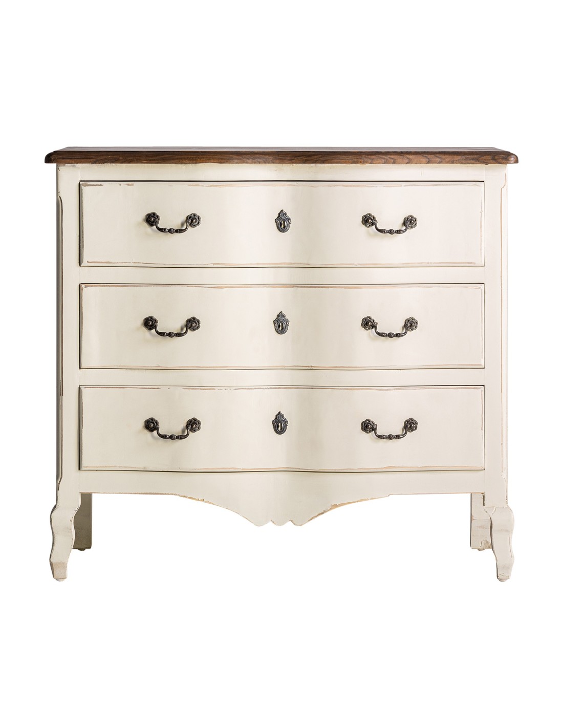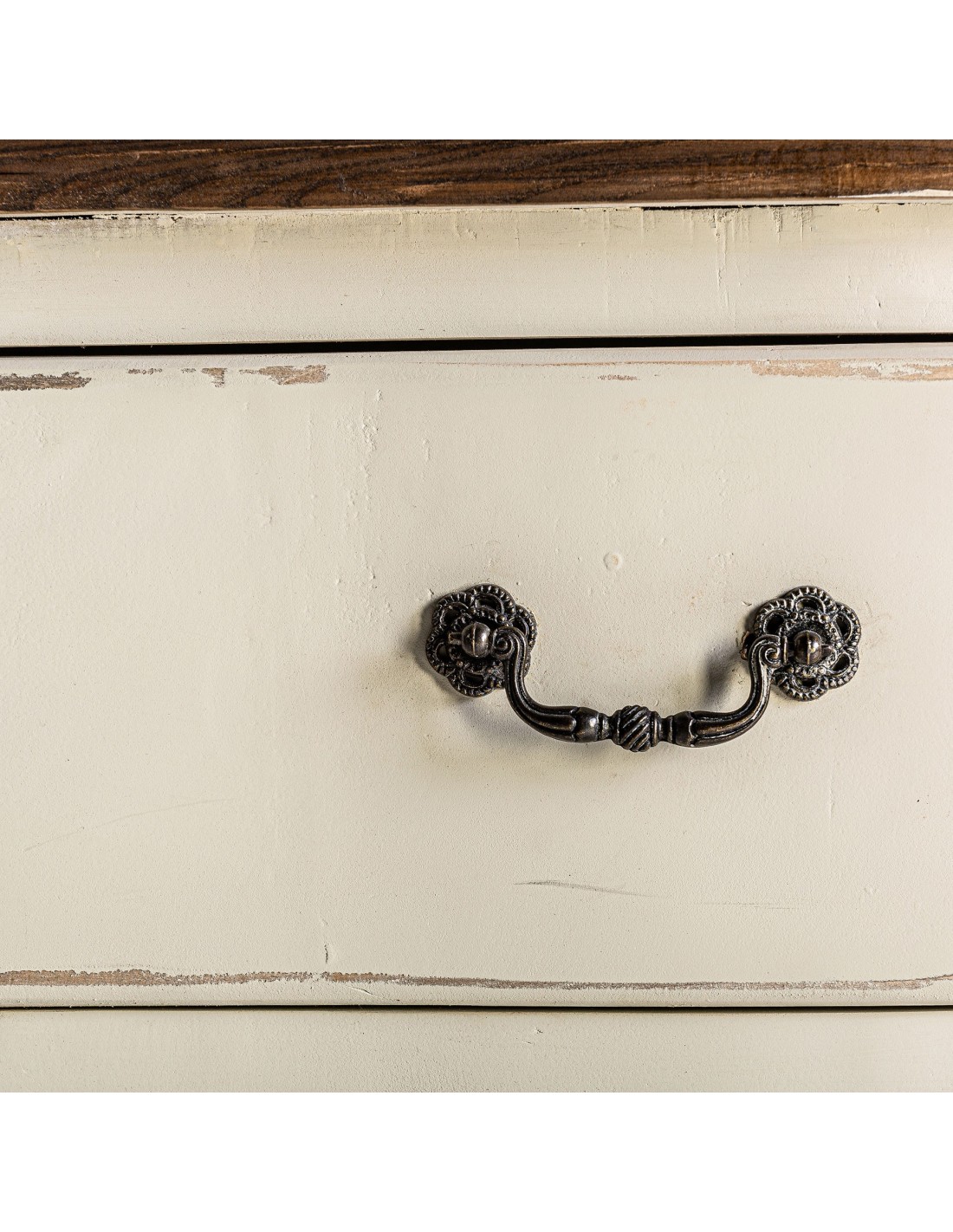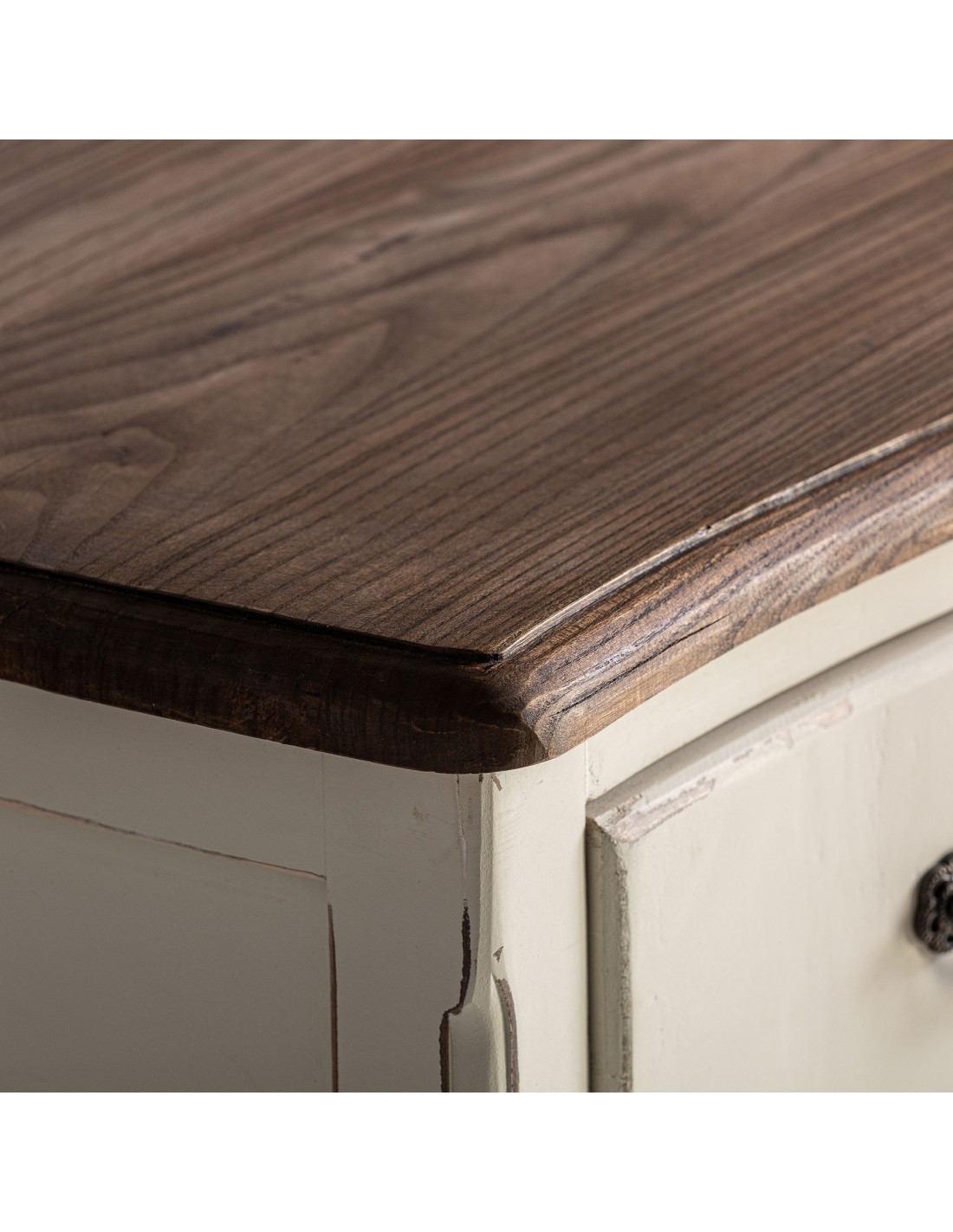 CÓMODA PIVKA, DE ESTILO PROVENZAL. FABRICADO EN MADERA DE OLMO, EN COLOR BLANCO ROTO ENVEJECIDO.