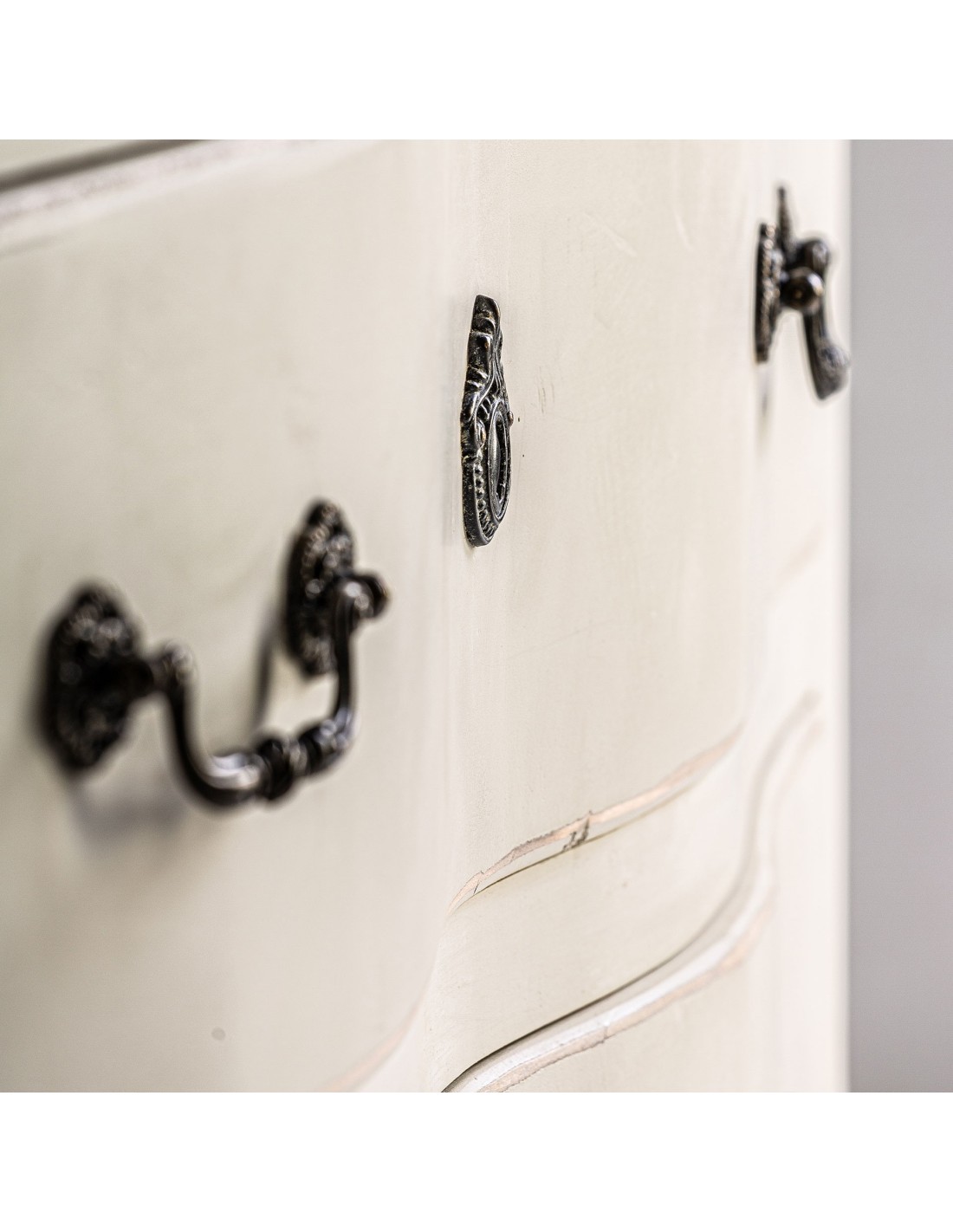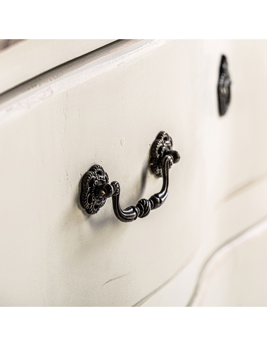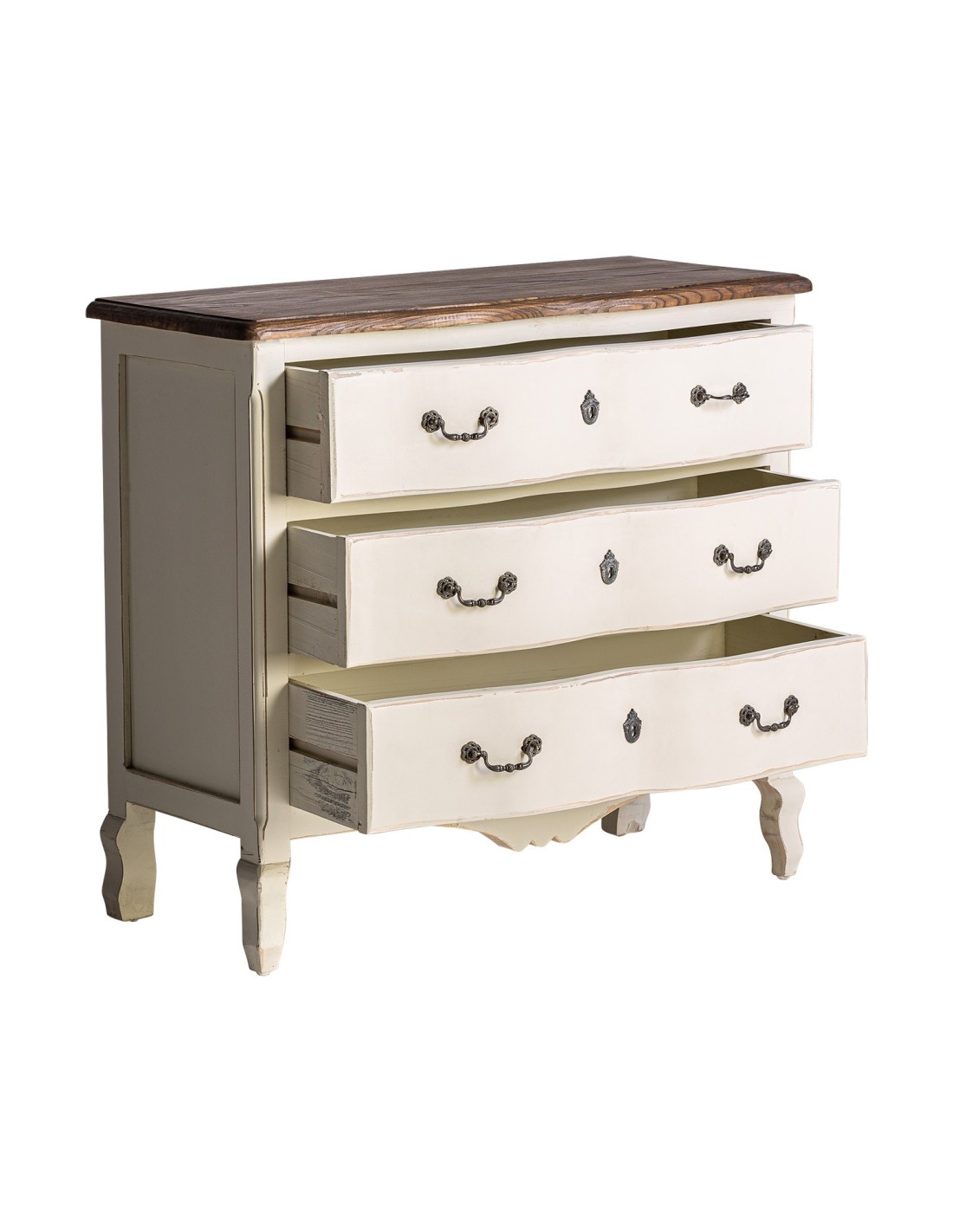 CÓMODA PIVKA, DE ESTILO PROVENZAL. FABRICADO EN MADERA DE OLMO, EN COLOR BLANCO ROTO ENVEJECIDO.
