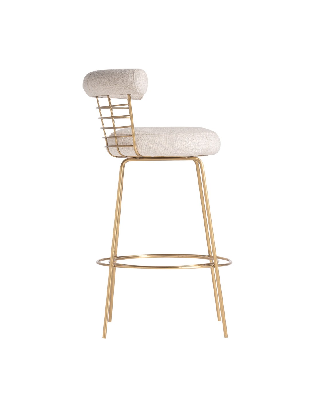 TABURETE TRESIVIO, DE ESTILO ART DECO. FABRICADO EN LATÓN, EN COLOR BLANCO ROTO, COMBINADO CON LINO Y ALGODÓN.