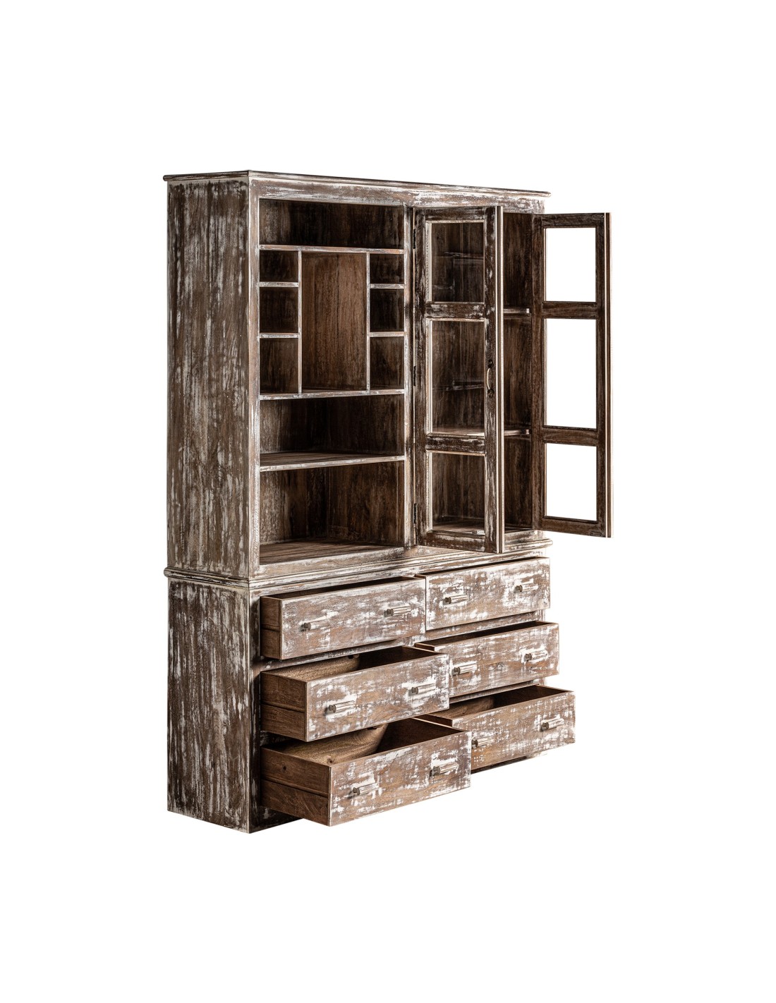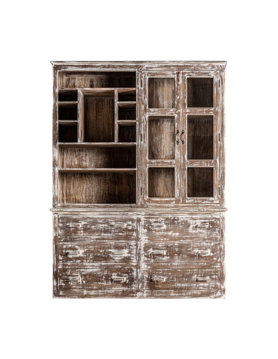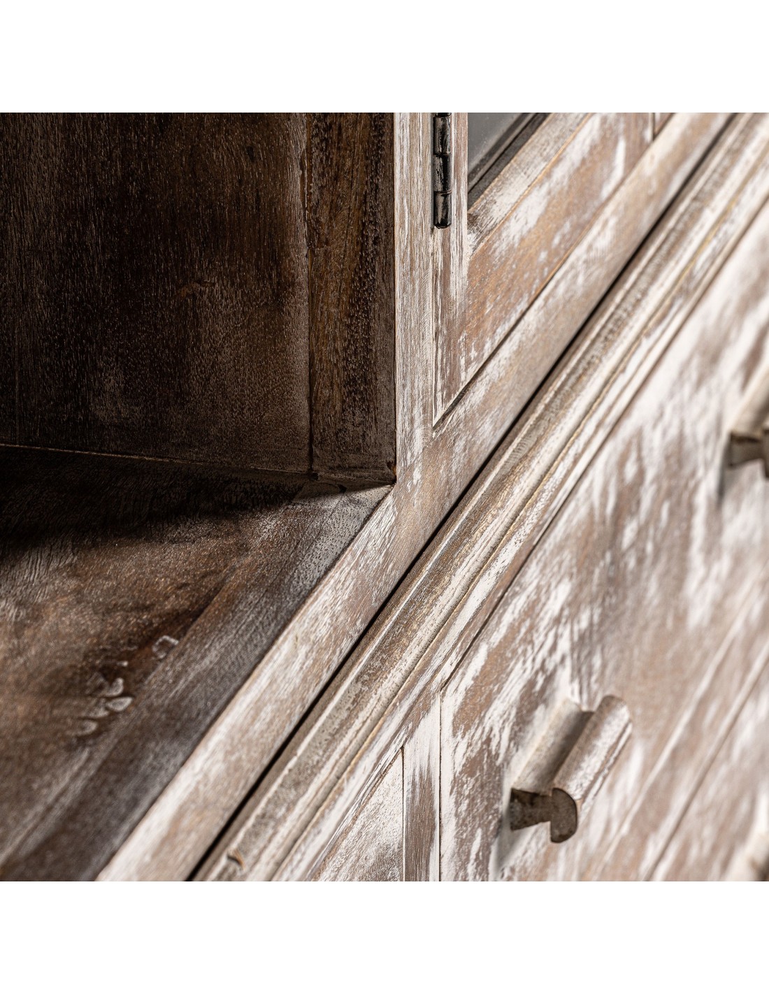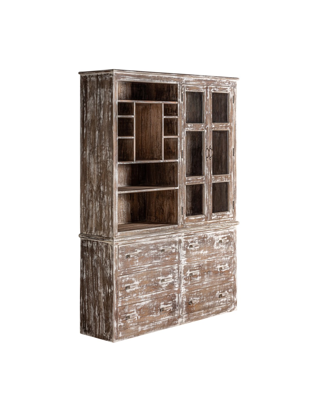VITRINA MALUNG, EN COLOR BLANCO/MARRÓN ENVEJECIDO, DE ESTILO RÚSTICO. FABRICADO EN MADERA DE MANGO, COMBINADO CON CRISTAL. PRODUCTO APILABLE.