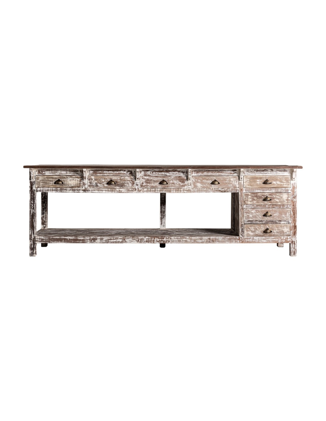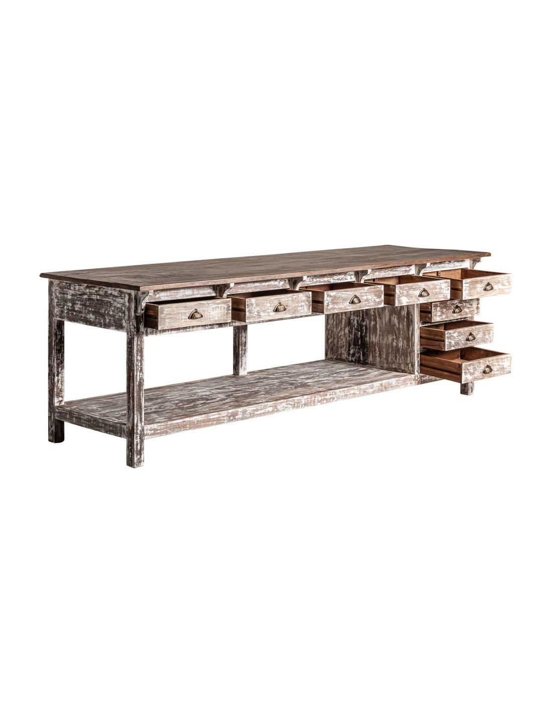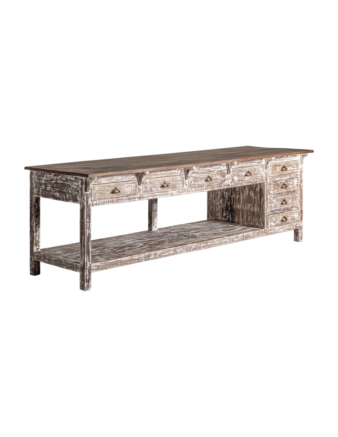 ESCRITORIO MALUNG, DE ESTILO RÚSTICO. FABRICADO EN MADERA TROPICAL, EN COLOR BLANCO ENVEJECIDO, EN COLOR MARRÓN.