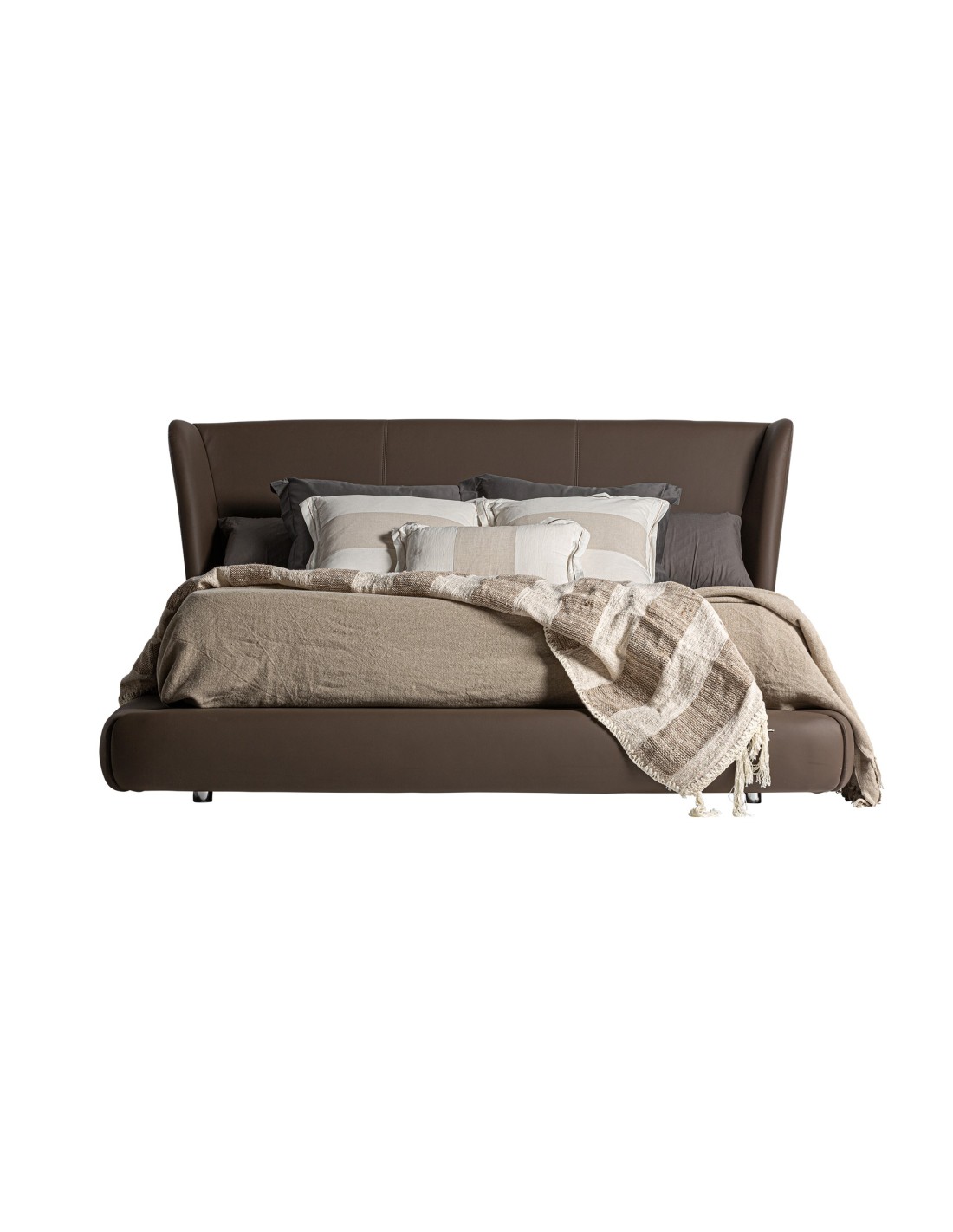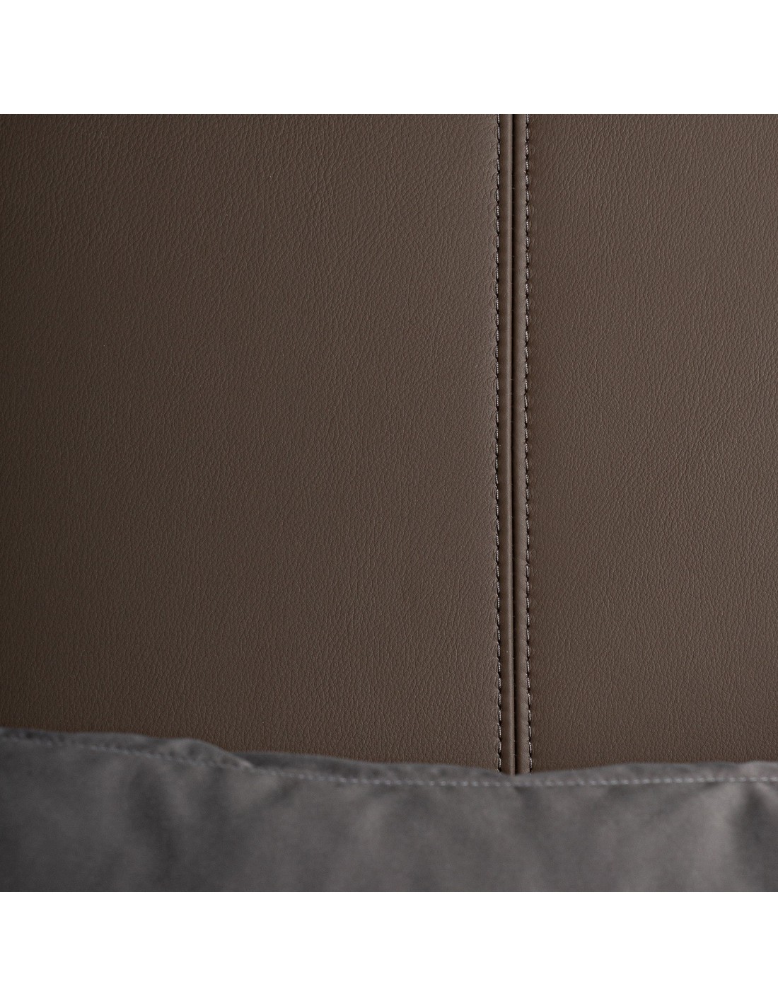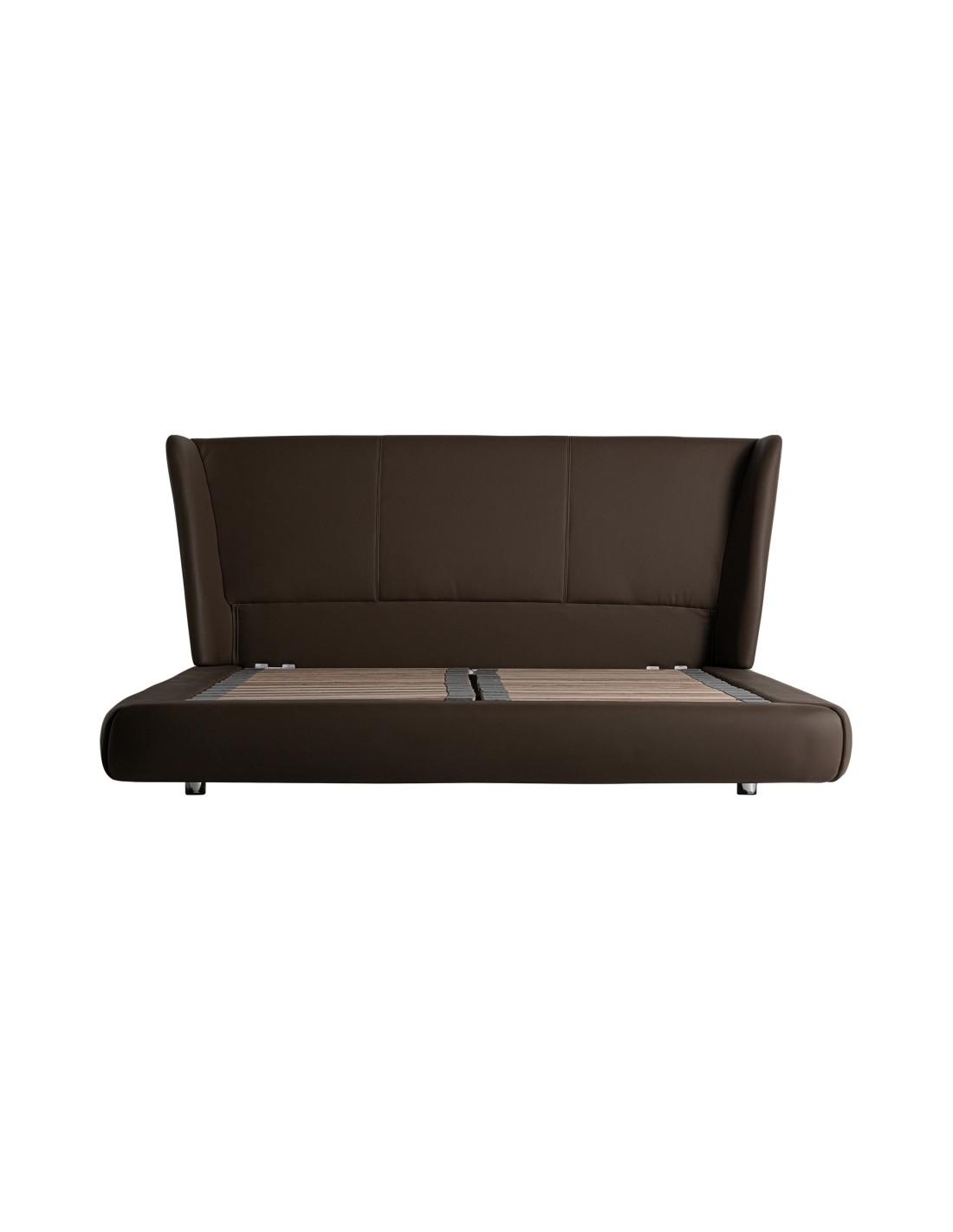 CAMA WAYNE, DE ESTILO CONTEMPORÁNEO. FABRICADO EN PIEL, EN COLOR MARRÓN, COMBINADO CON MADERA DE PINO Y ESPUMA. PRODUCTO DESMONTABLE.