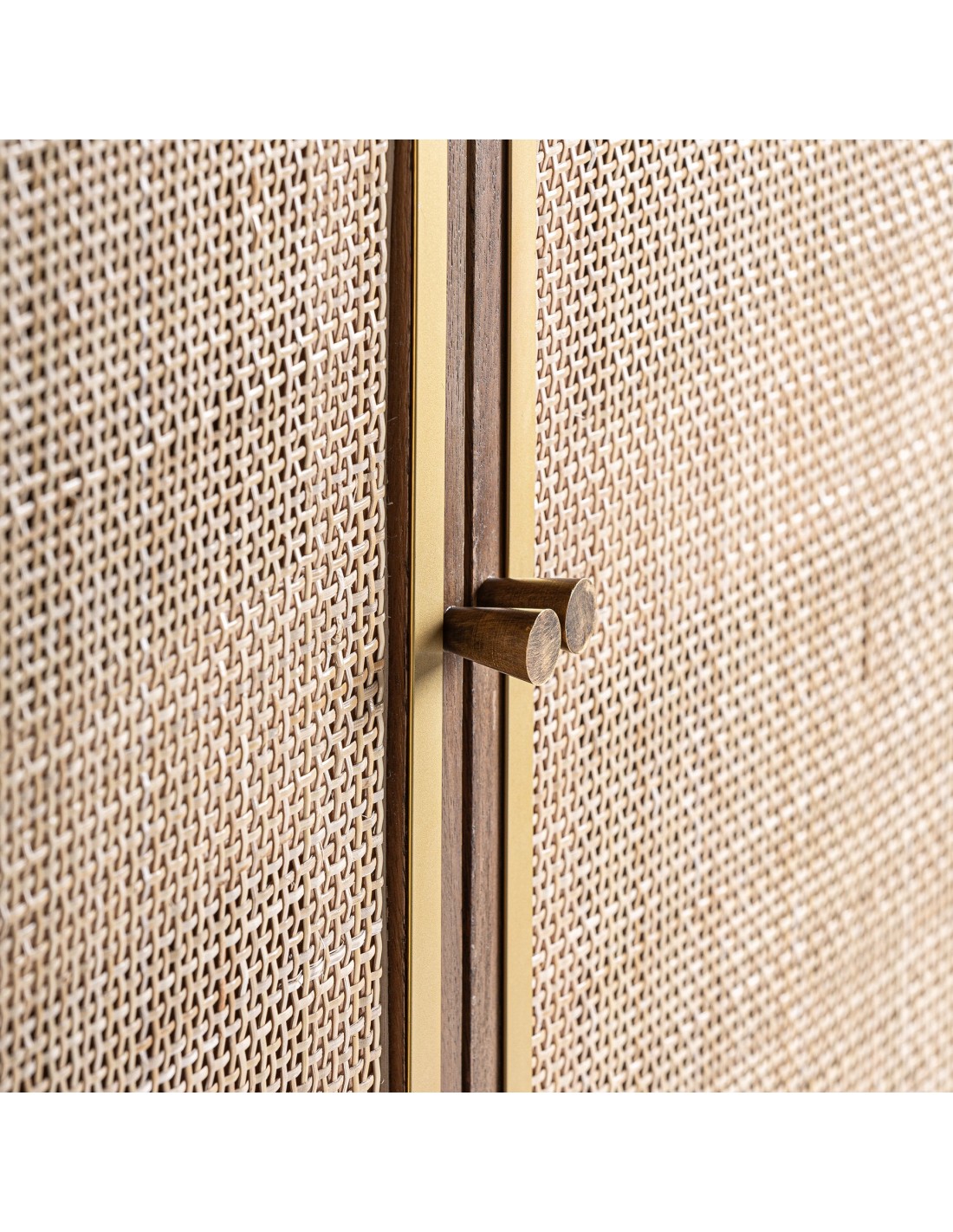 El Armario Gondorf combina madera de mango maciza, frentes en ratán natural trenzado y elegantes detalles en latón dorado, creando una pieza de almacenaje con fuerte carácter decorativo. Su diseño de inspiración nórdica aporta serenidad, textura y calidez, ideal para dormitorios, recibidores o salones sofisticados que buscan funcionalidad sin renunciar al estilo.