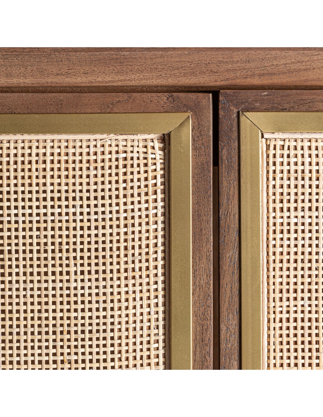 Los frentes en ratán natural introducen textura y ligereza visual, un recurso muy utilizado en interiorismo contemporáneo para suavizar volúmenes y aportar frescura. Este contraste entre madera sólida y fibra vegetal crea un equilibrio perfecto entre robustez y delicadeza.