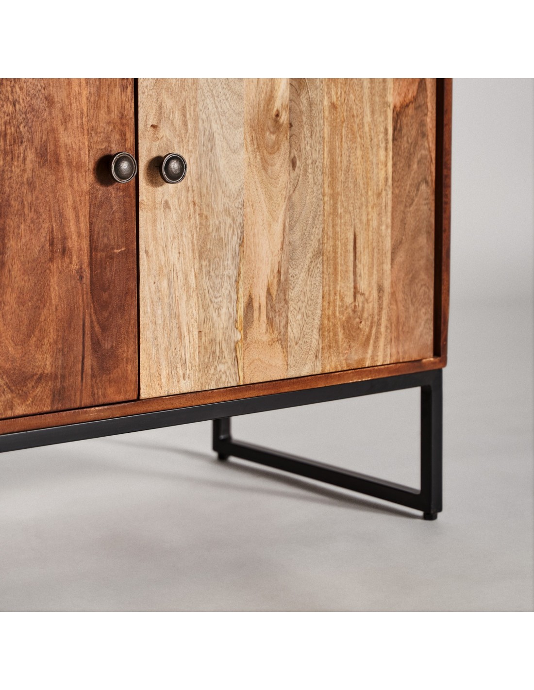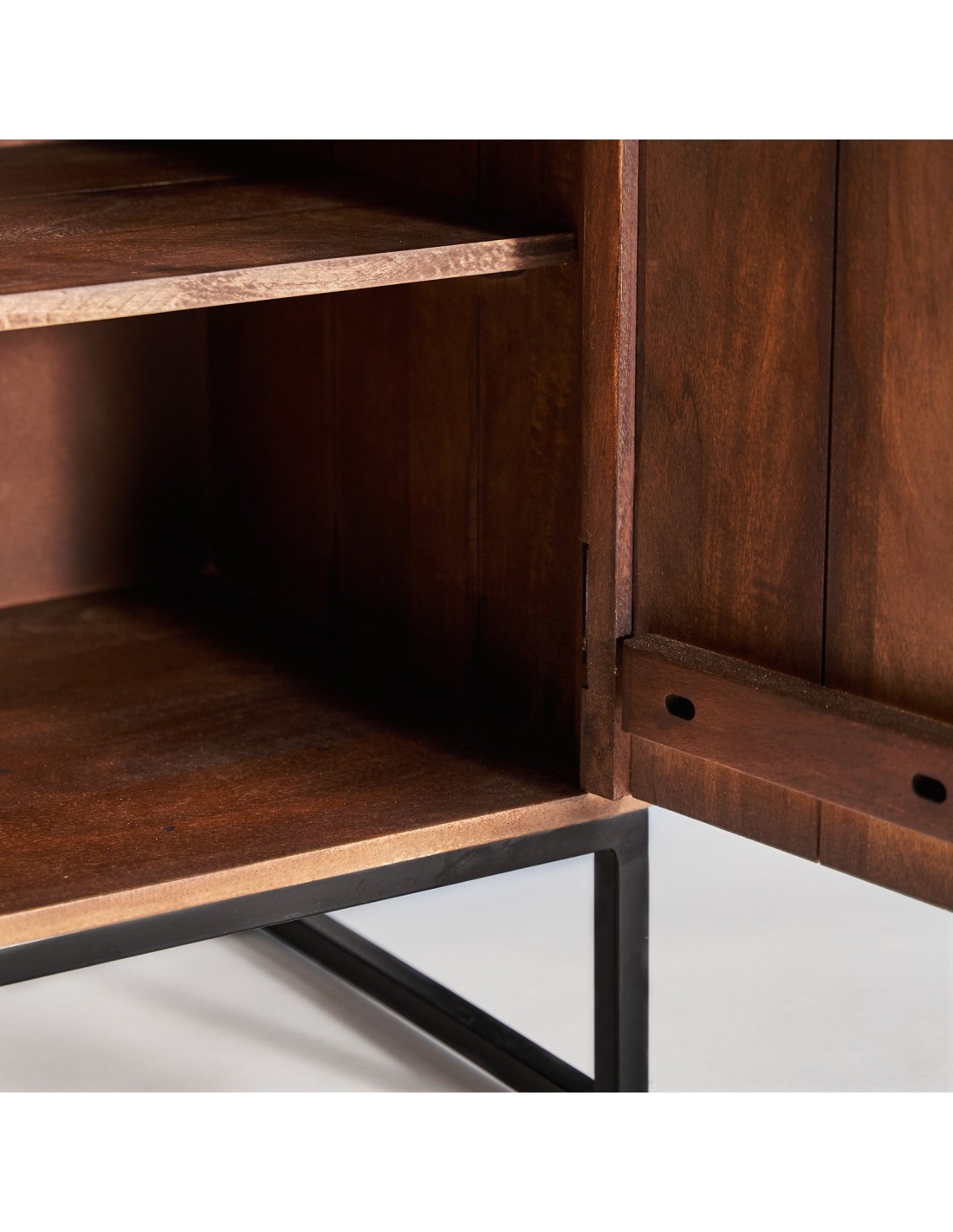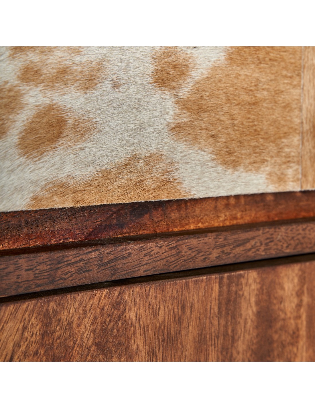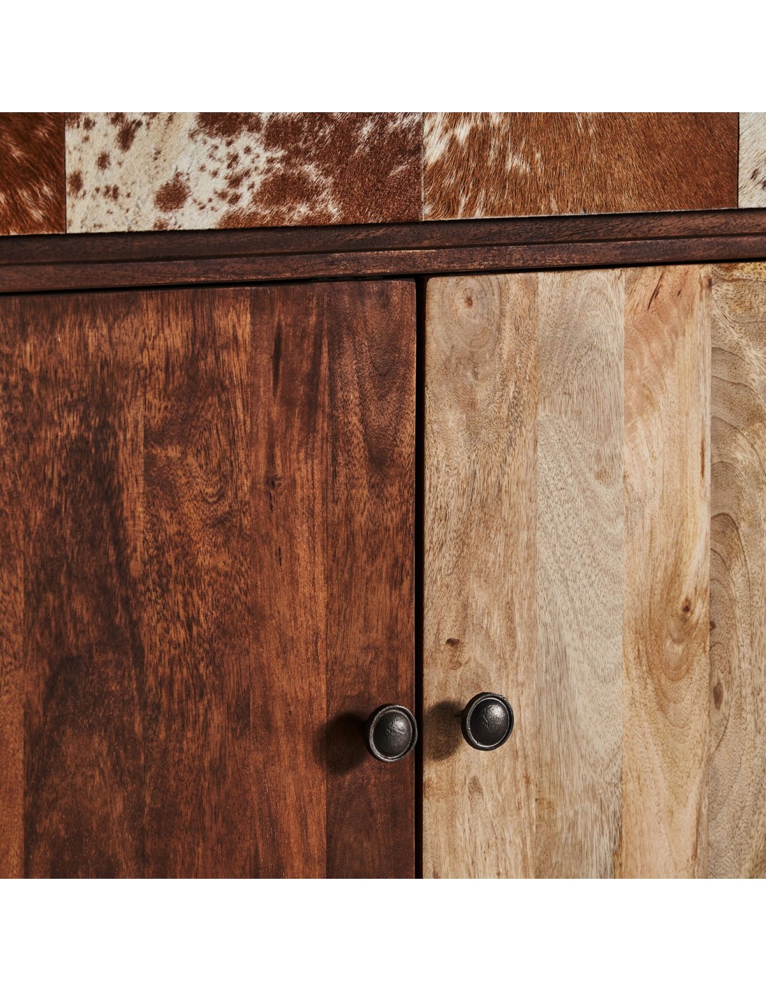 MUEBLE BAR TEXAS, EN COLOR MARRÓN, DE ESTILO NÓRDICO. FABRICADO EN MADERA DE MANGO RECICLADA, COMBINADO CON FORJA Y PIEL DE VACA.