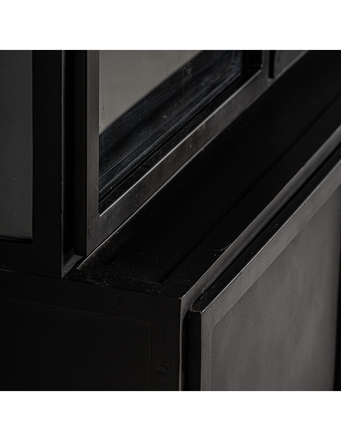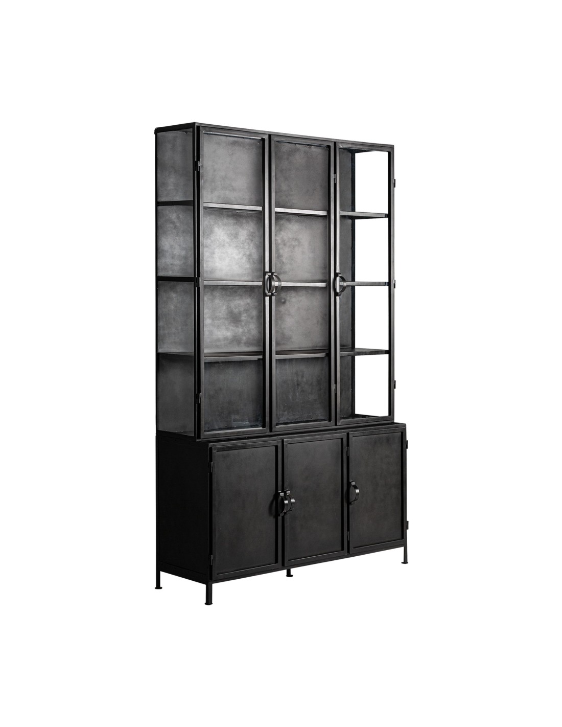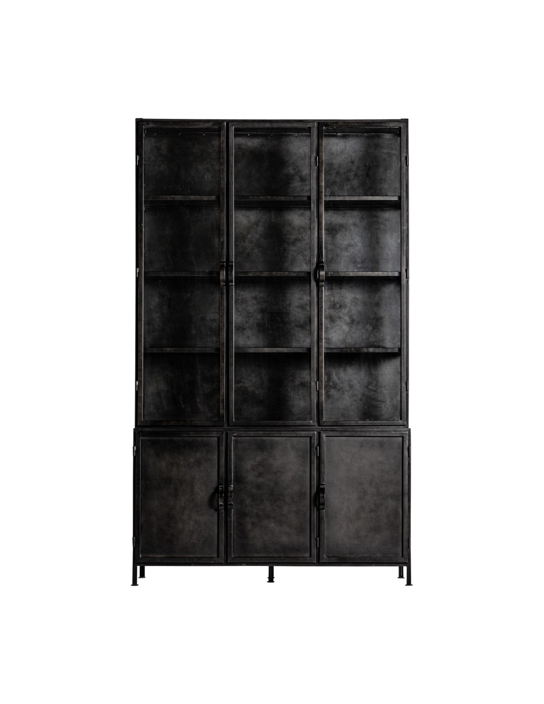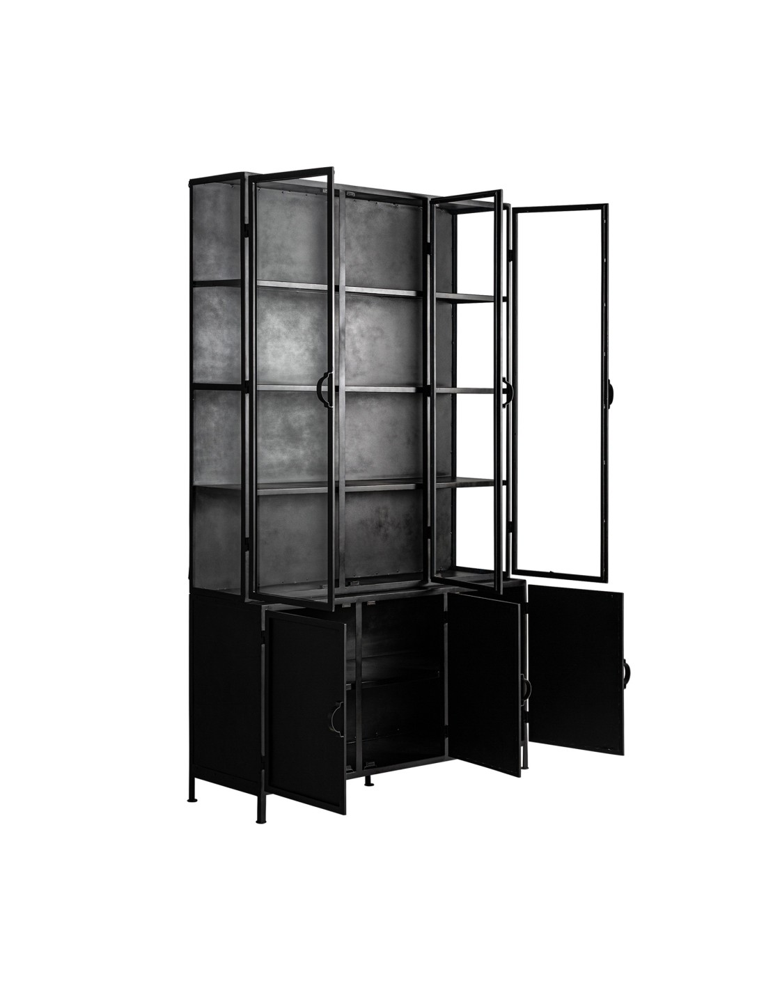 VITRINA LEVEN, EN COLOR NEGRA, DE ESTILO INDUSTRIAL. FABRICADO EN HIERRO, COMBINADO CON CRISTAL. PRODUCTO DESMONTABLE.