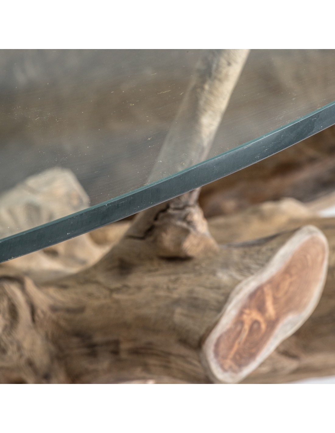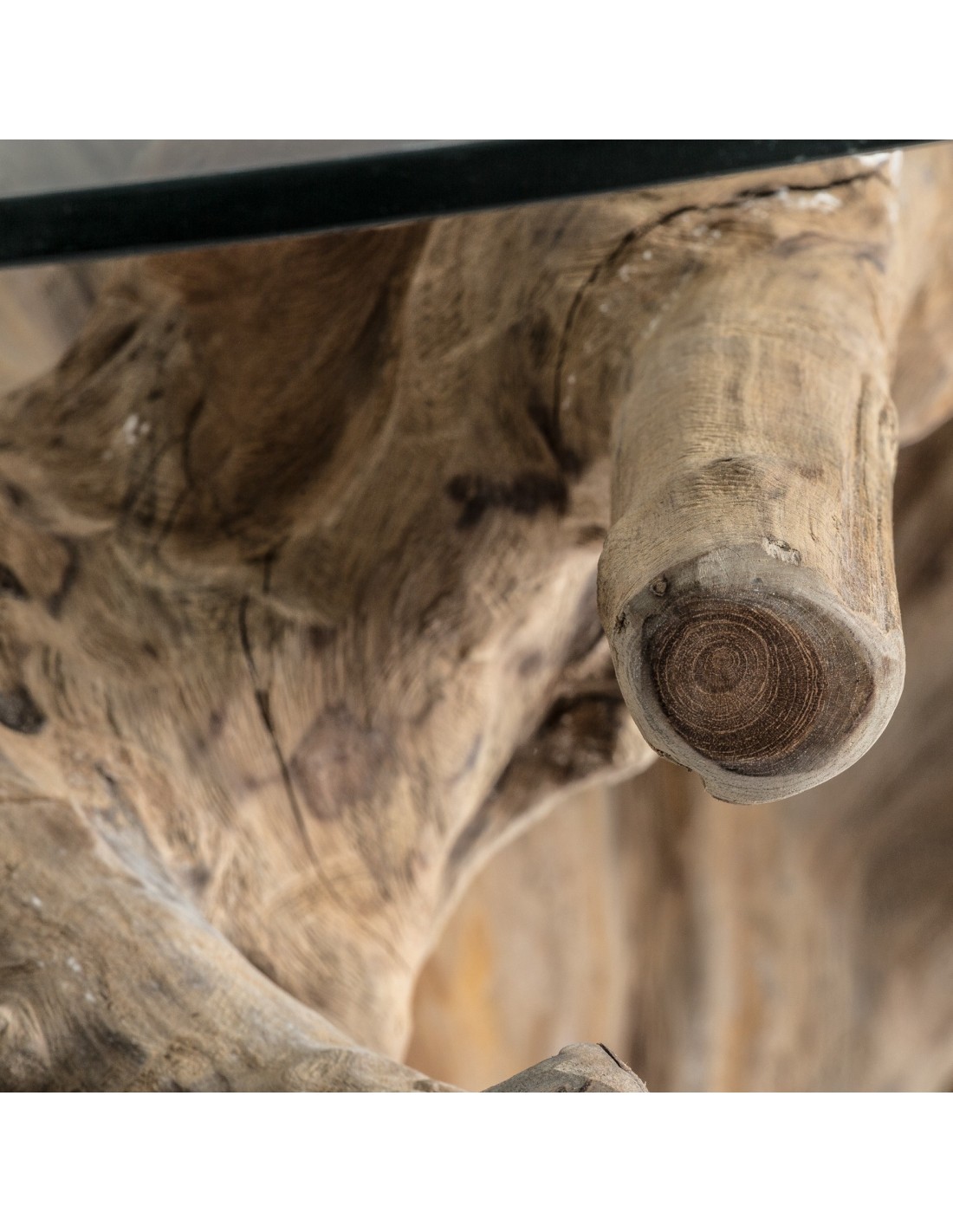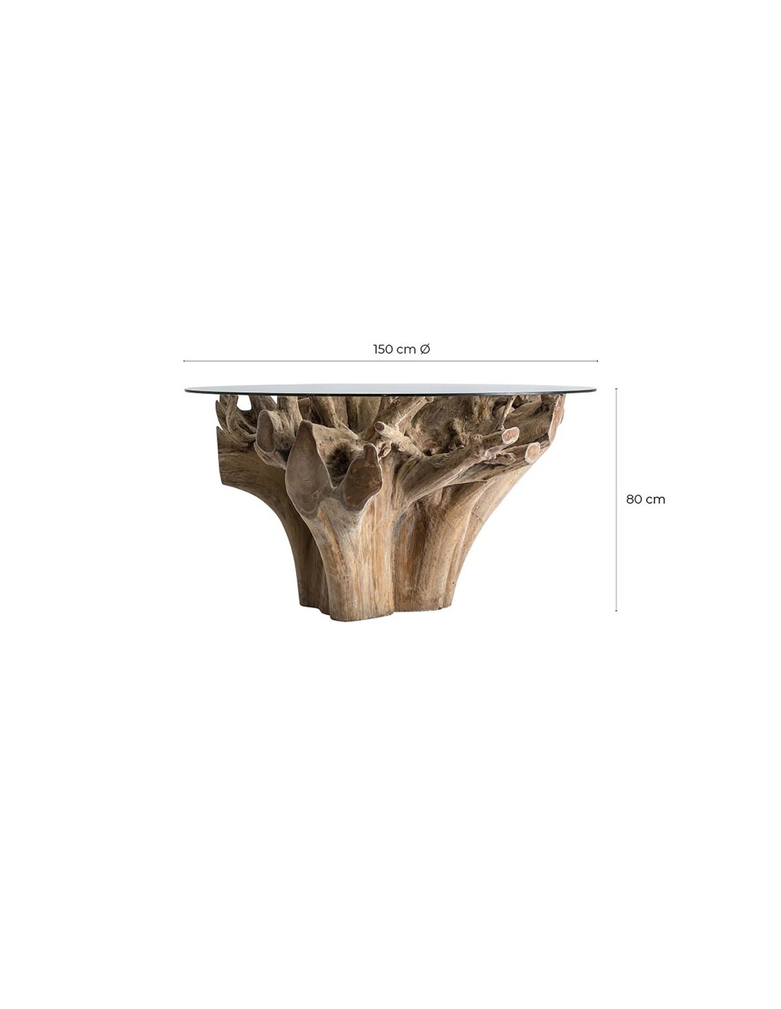 MESA COMEDOR WARRI, EN COLOR MARRÓN ARTESANAL, DE ESTILO ÉTNICO. FABRICADO EN RAÍZ TEKA, COMBINADO CON VIDRIO.