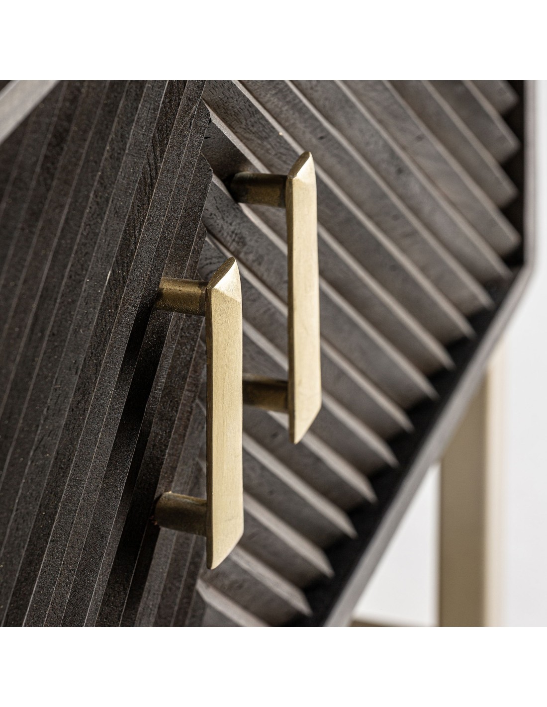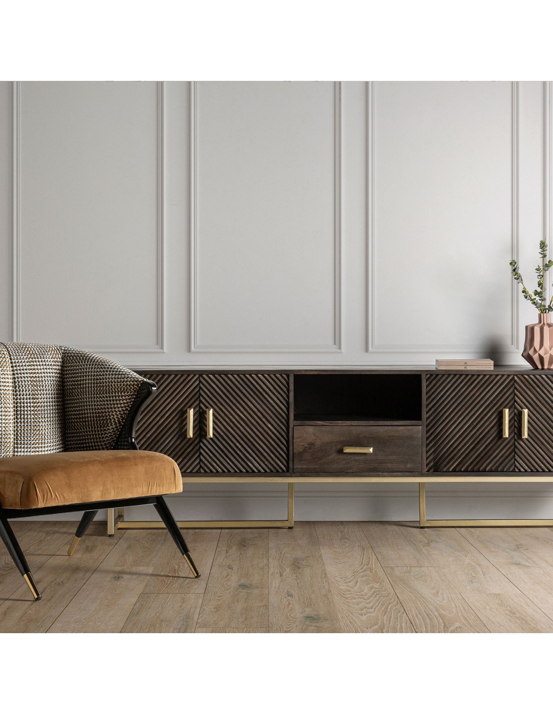 MUEBLE TV KRAJ, DE ESTILO ART DECO. FABRICADO EN HIERRO, EN COLOR MARRÓN, COMBINADO CON MADERA DE MANGO, EN COLOR ORO.