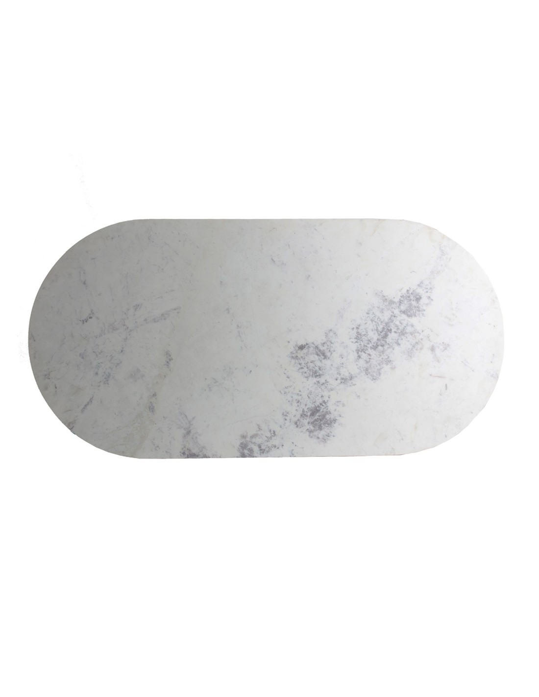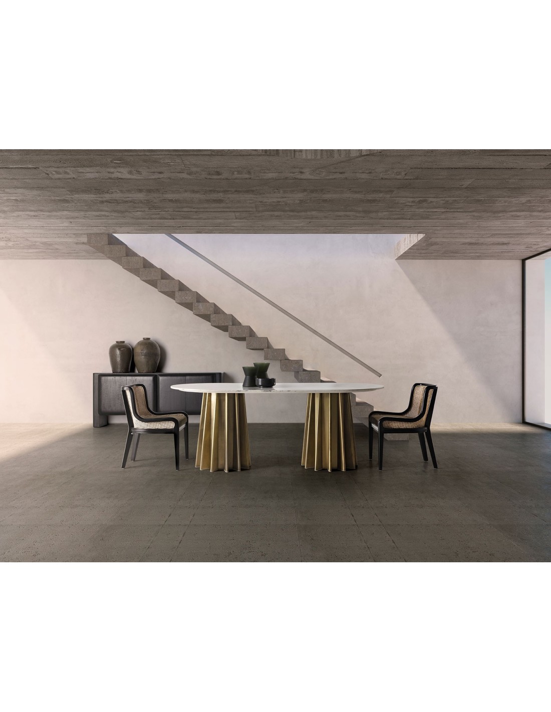 MESA COMEDOR OVAL LEZEY, DE ESTILO ART DECO. FABRICADO EN MÁRMOL, EN COLOR BLANCO, COMBINADO CON ACERO, EN COLOR ORO. PRODUCTO DESMONTABLE.