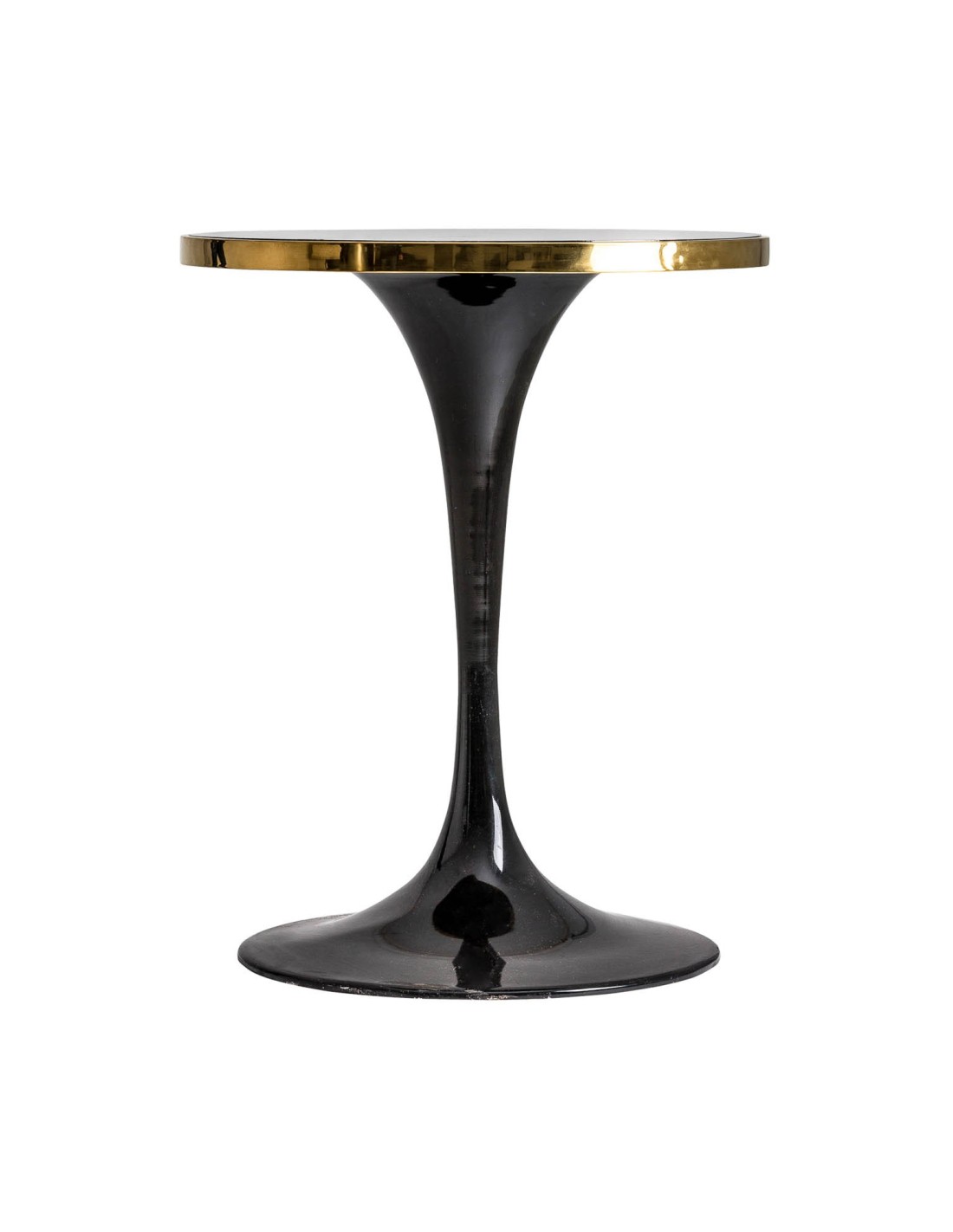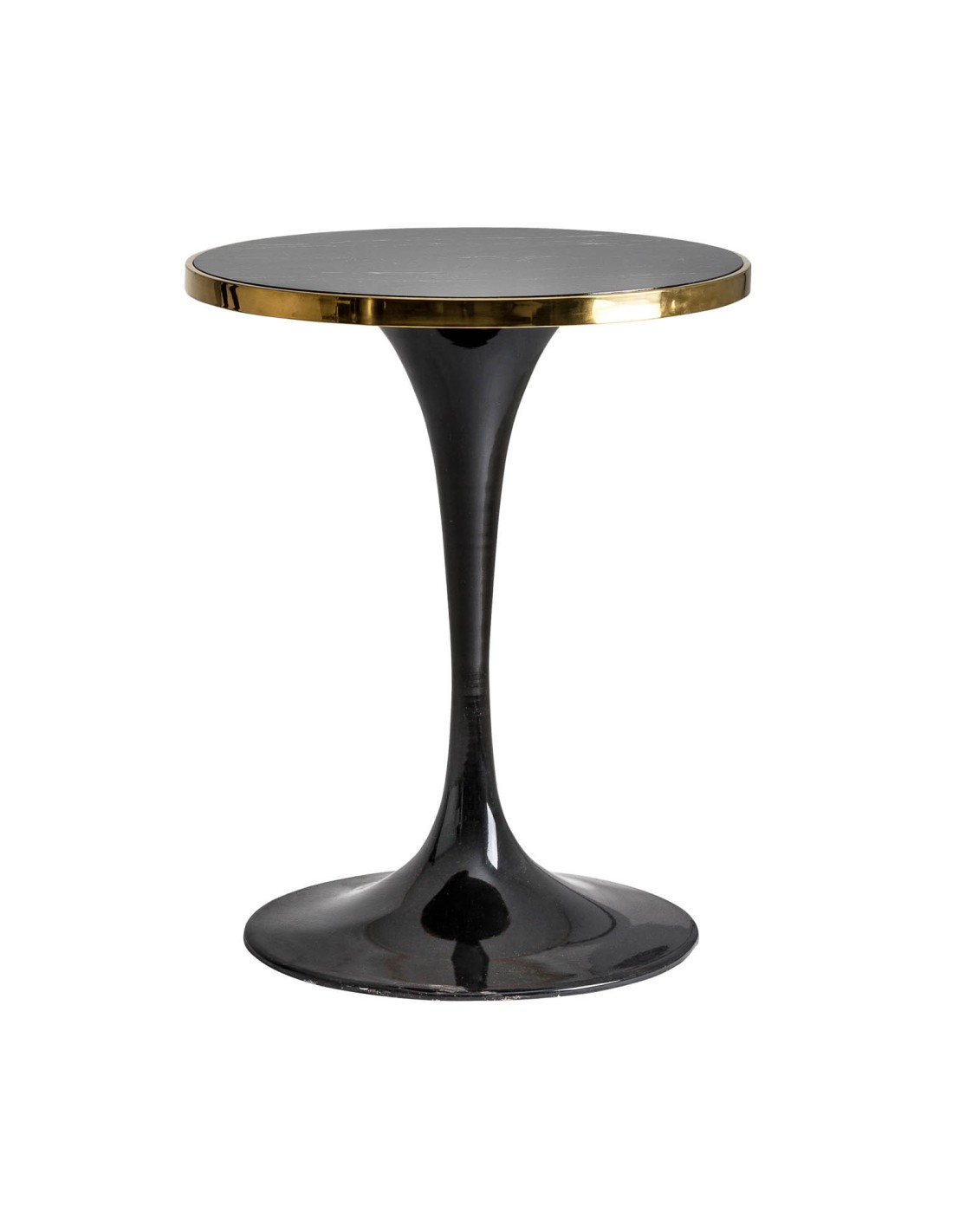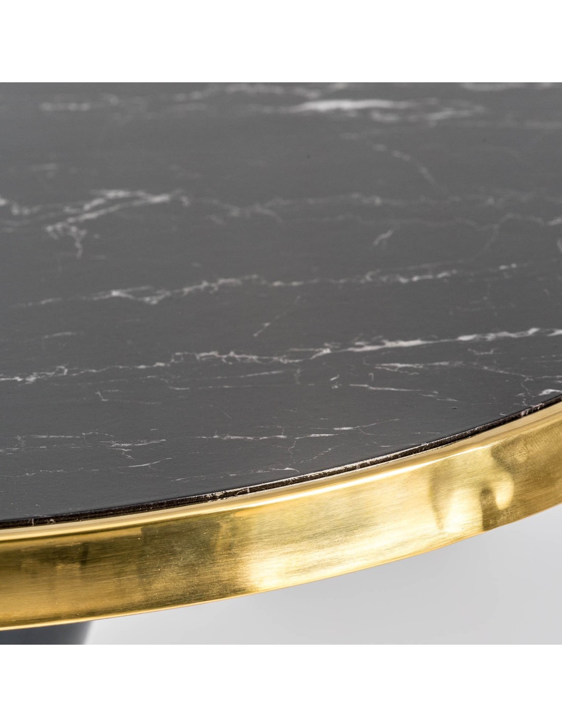 MESA BAR THAN, EN COLOR NEGRO/ORO BRILLO, DE ESTILO ART DECO. FABRICADO EN MÁRMOL SINTÉTICO, COMBINADO CON ACERO Y HIERRO. MÁRMOL SINTÉTICO: PIEDRA GRANITO CON ACABADO MÁRMOL. PRODUCTO DESMONTABLE.