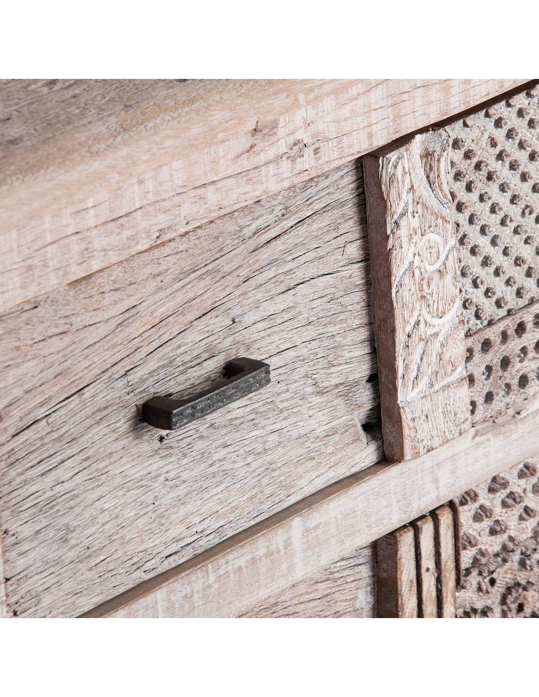 Lo que hace especial a este buffet de madera de mango es la presencia de los bloques de madera tallada. Estos bloques, de diferentes tamaños y diseños, eran usados para la realizar la impresión a mano en telas y papel. Tras la aparición de la impresión a máquina cayeron en desuso y ahora son utilizados para embellecer esta pieza única.