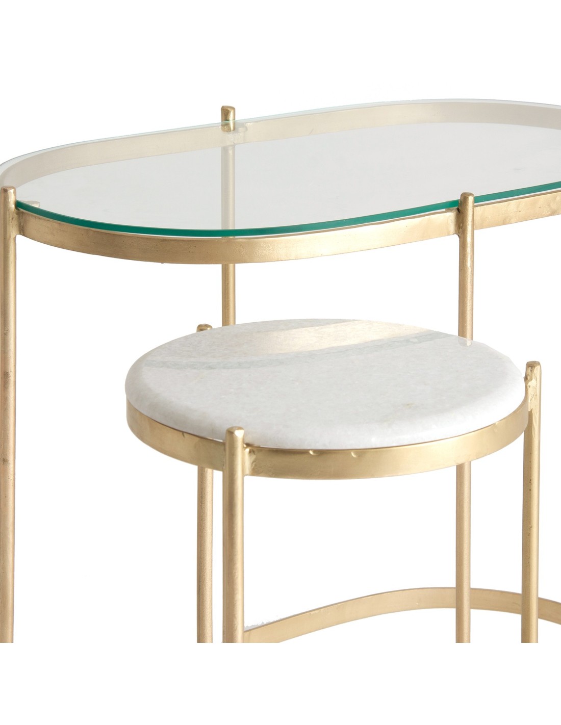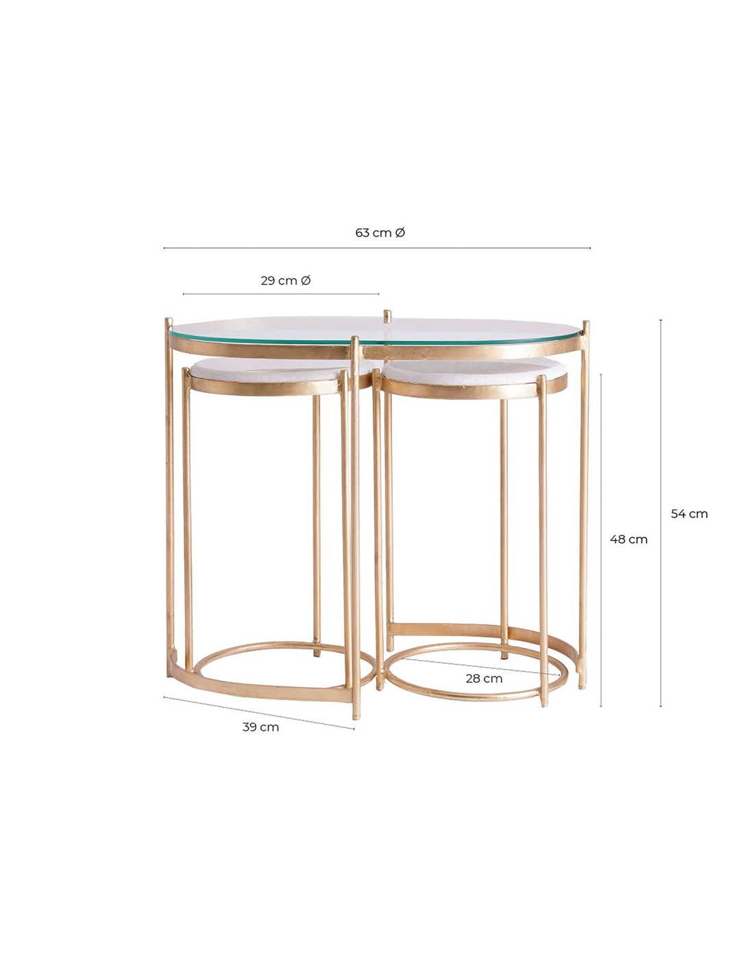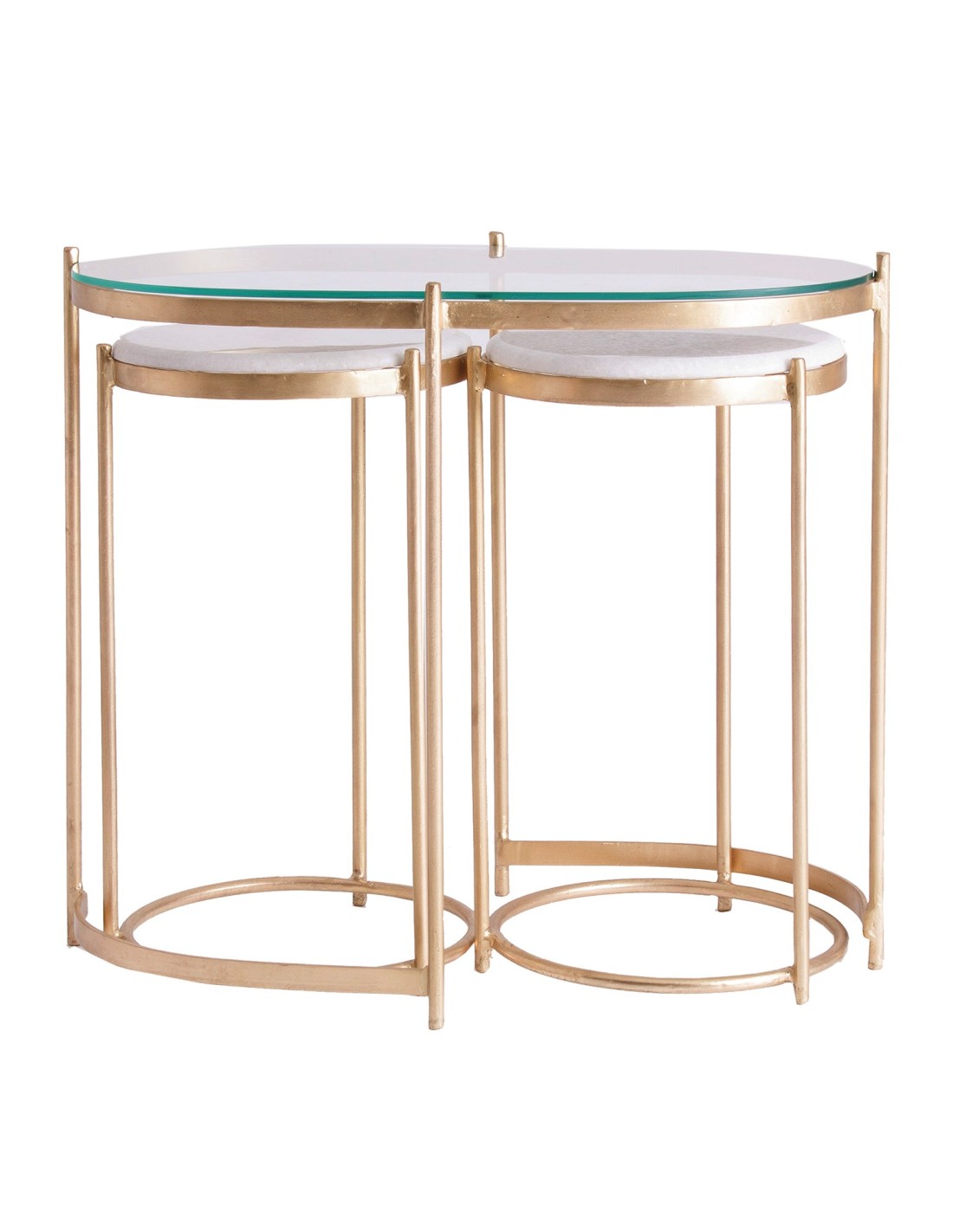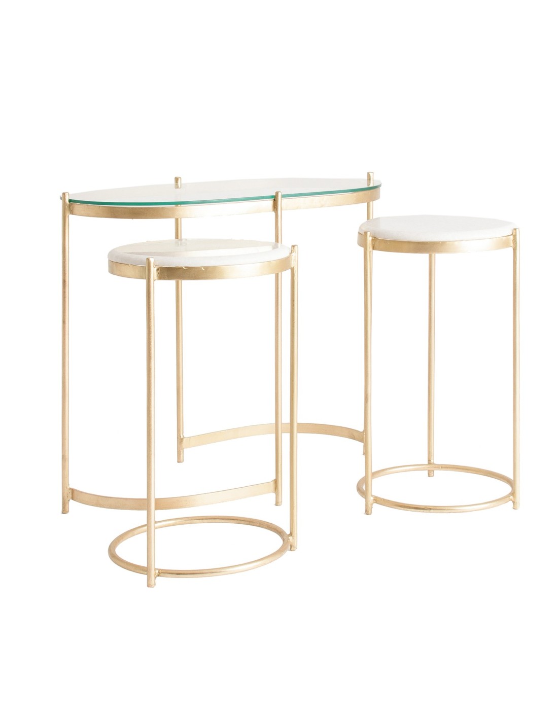 MESA AUXILIAR J/3 KRUTH, EN COLOR ORO VIEJO, DE ESTILO ART DECO. FABRICADO EN HIERRO, COMBINADO CON VIDRIO Y MÁRMOL. PRODUCTO DESMONTABLE.