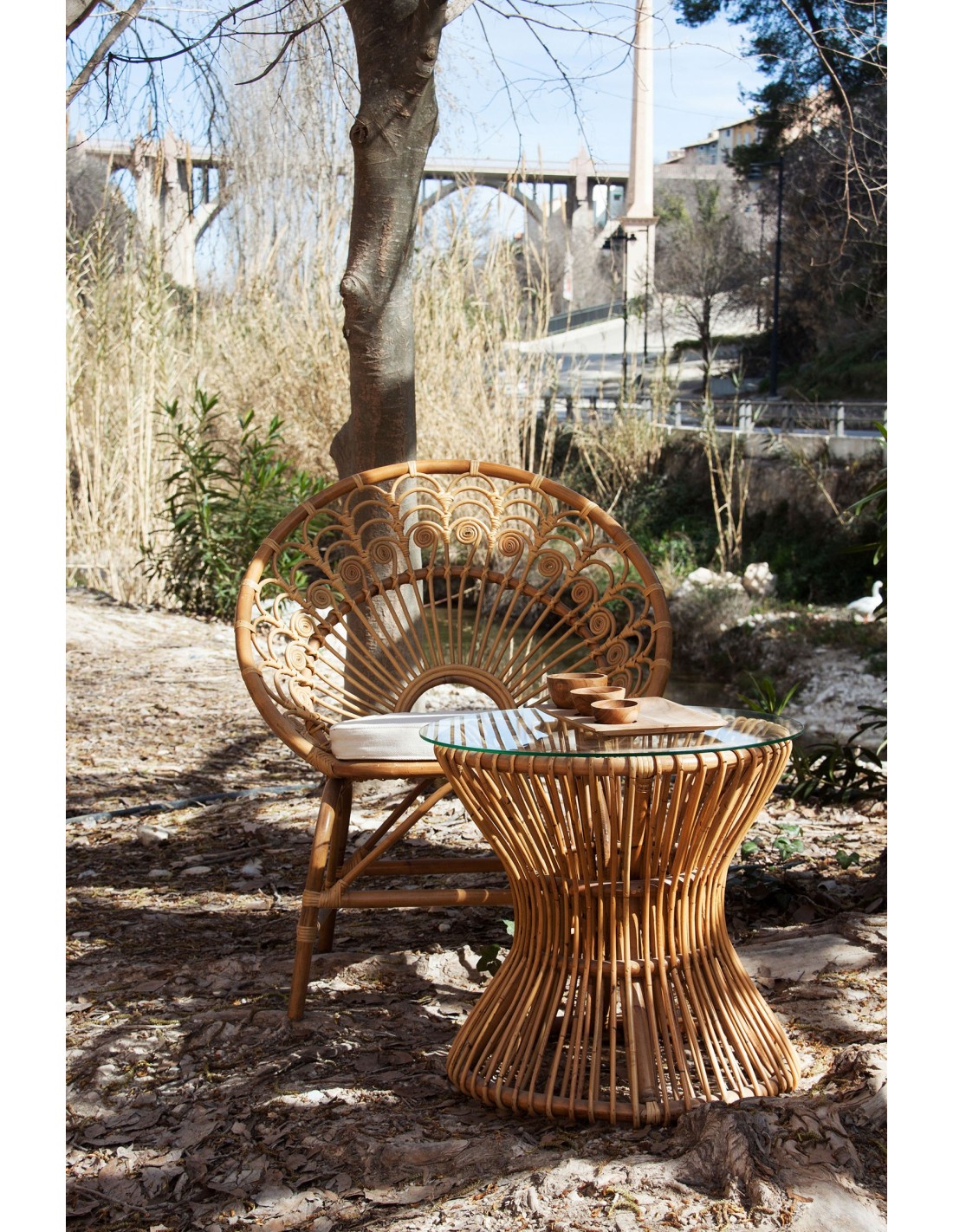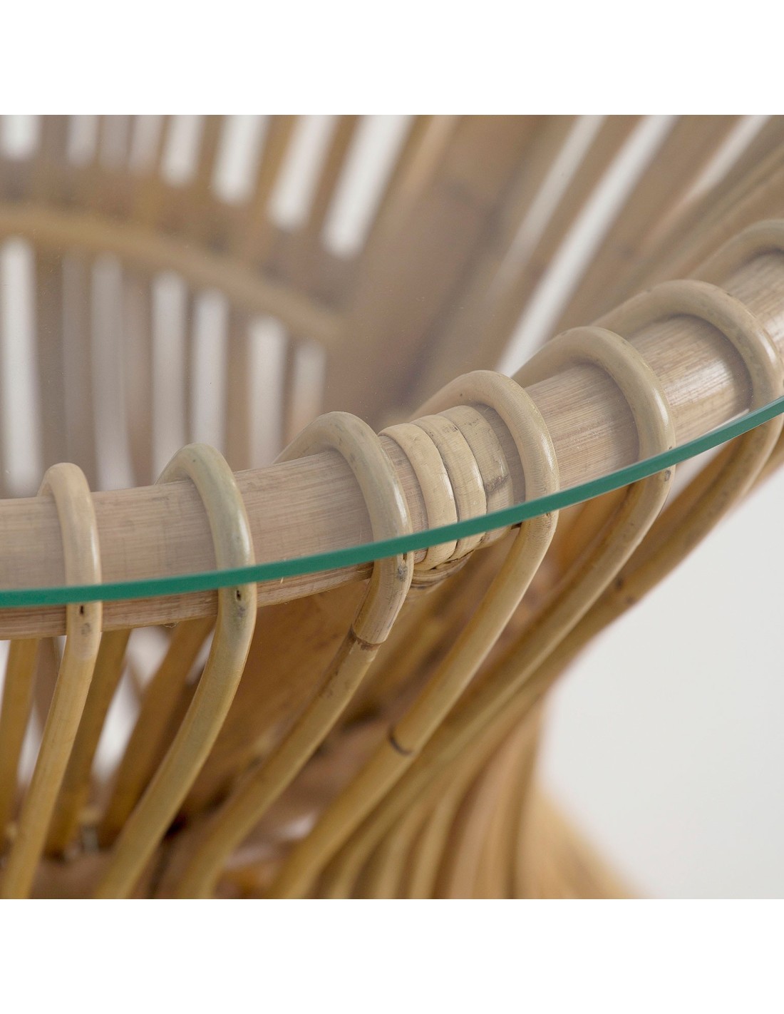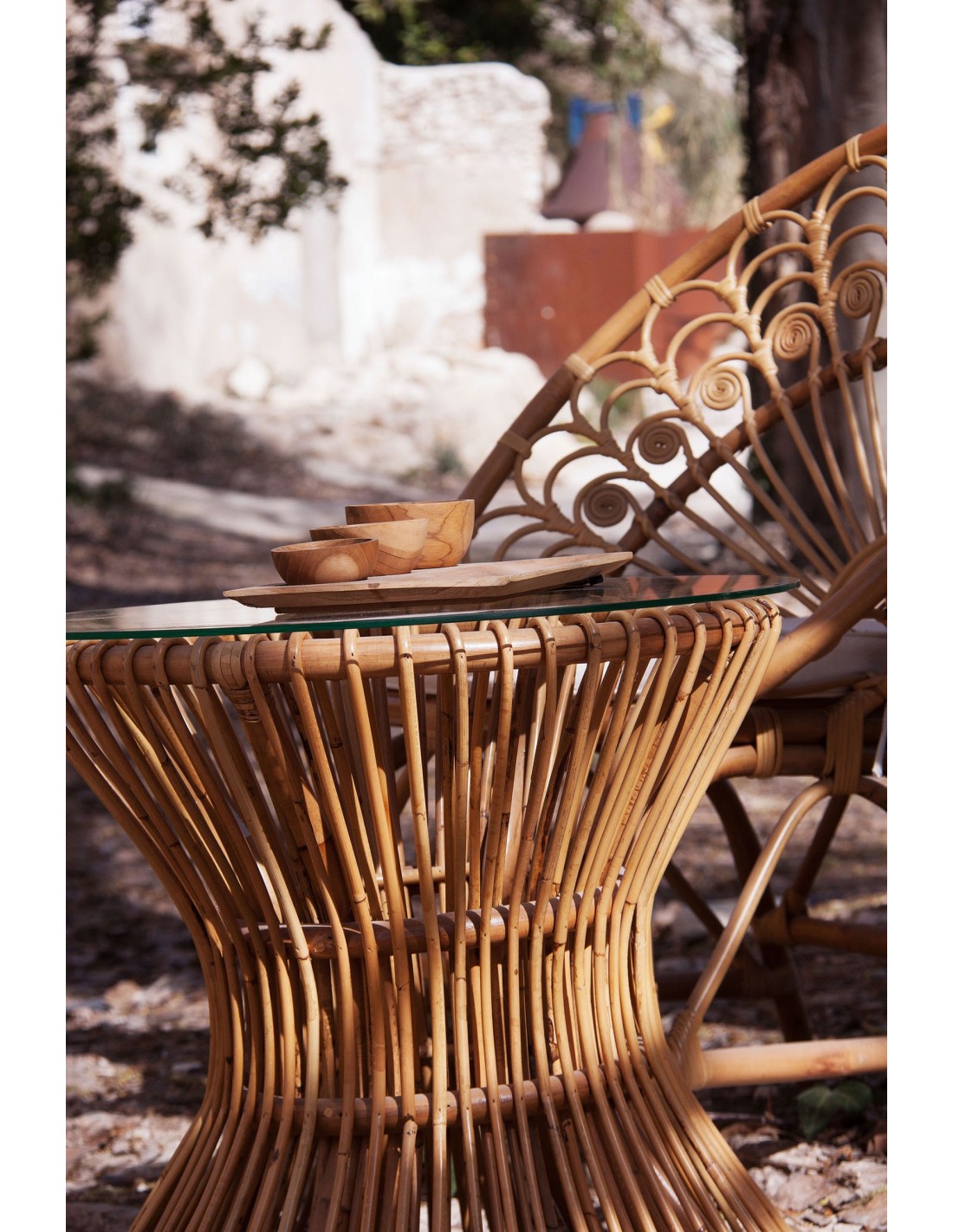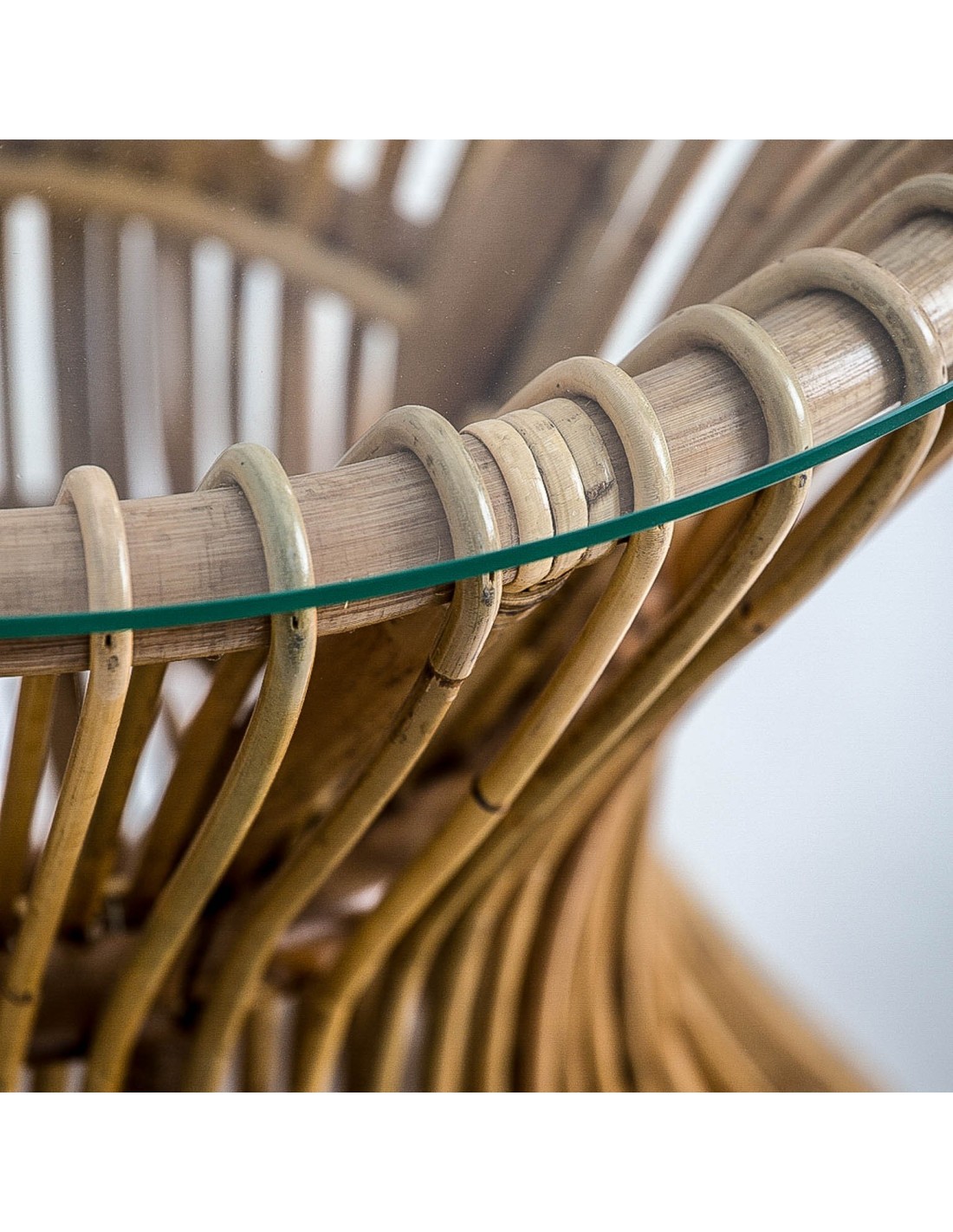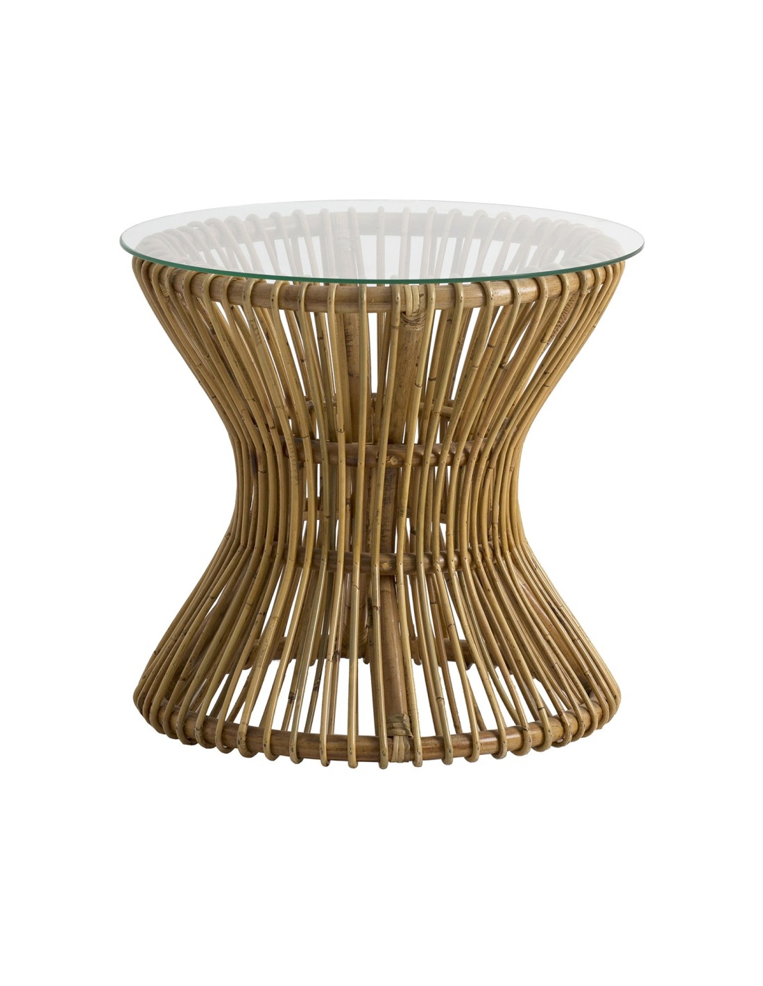 MESA AUXILIAR SURIA, EN COLOR NATURAL, DE ESTILO CONTEMPORÁNEO. FABRICADO EN RATÁN, COMBINADO CON VIDRIO. PRODUCTO DESMONTABLE.