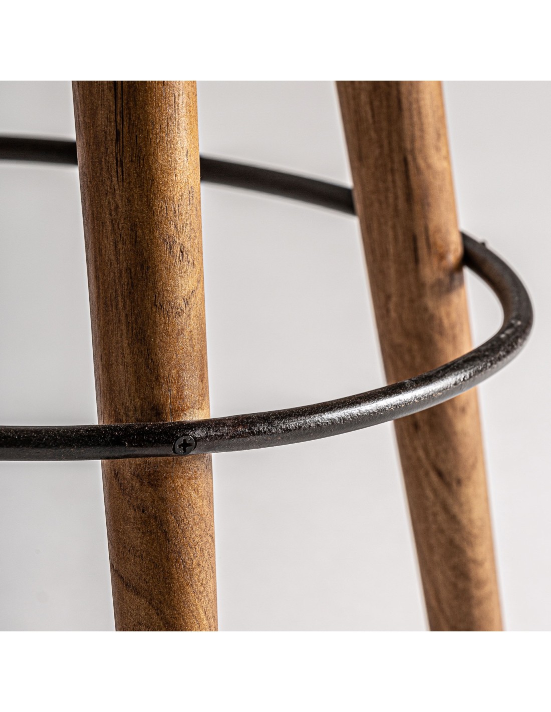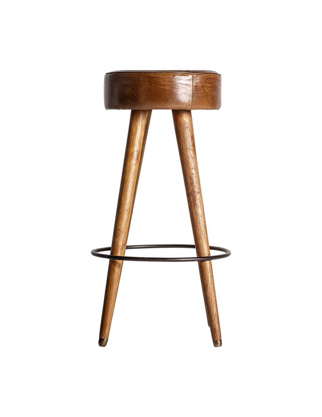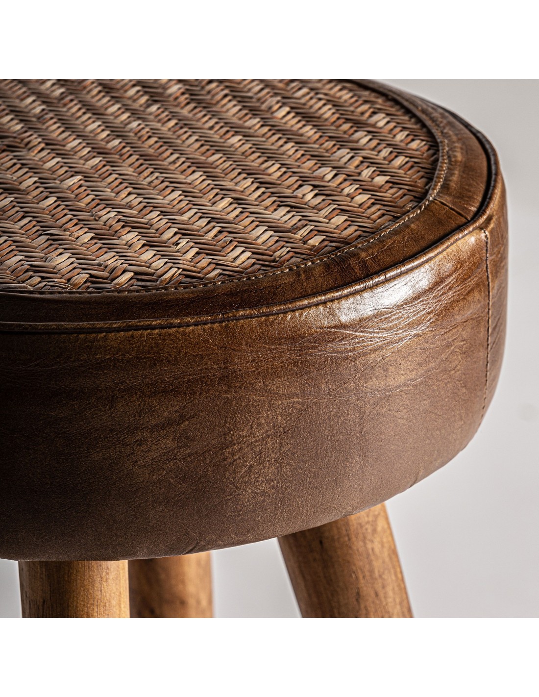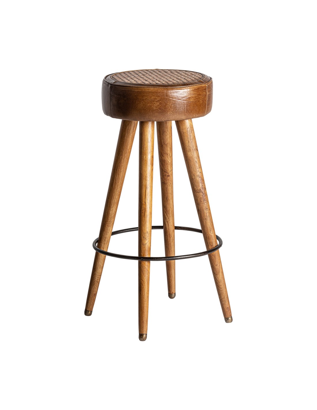 Taburete krokom, en color marrón, de estilo vintage. Fabricado en piel, combinado con ratán y madera.