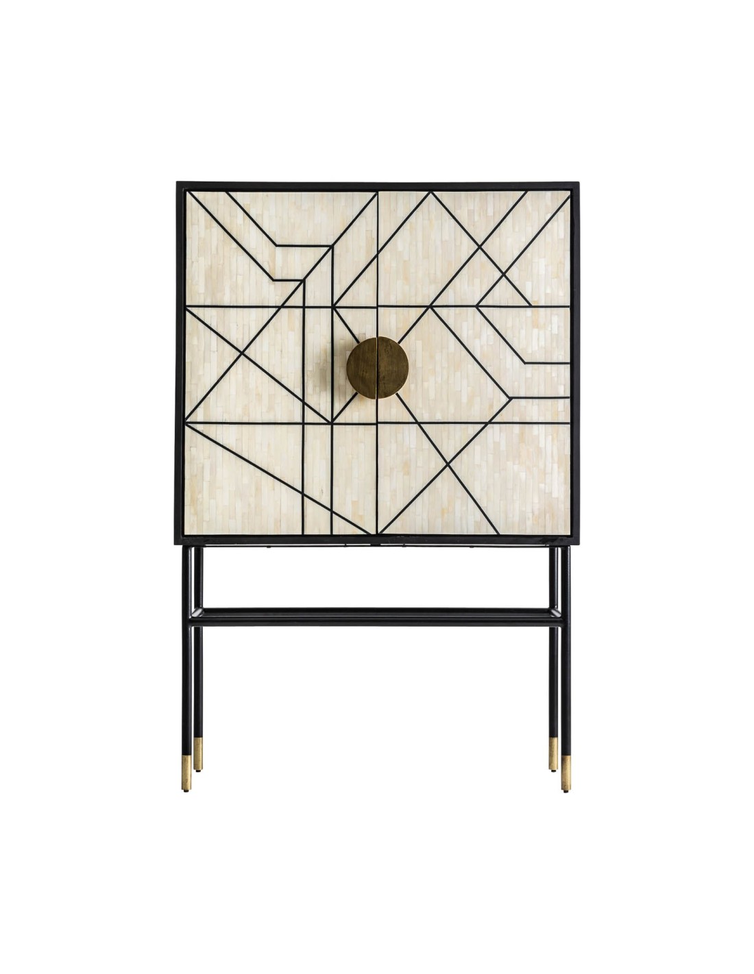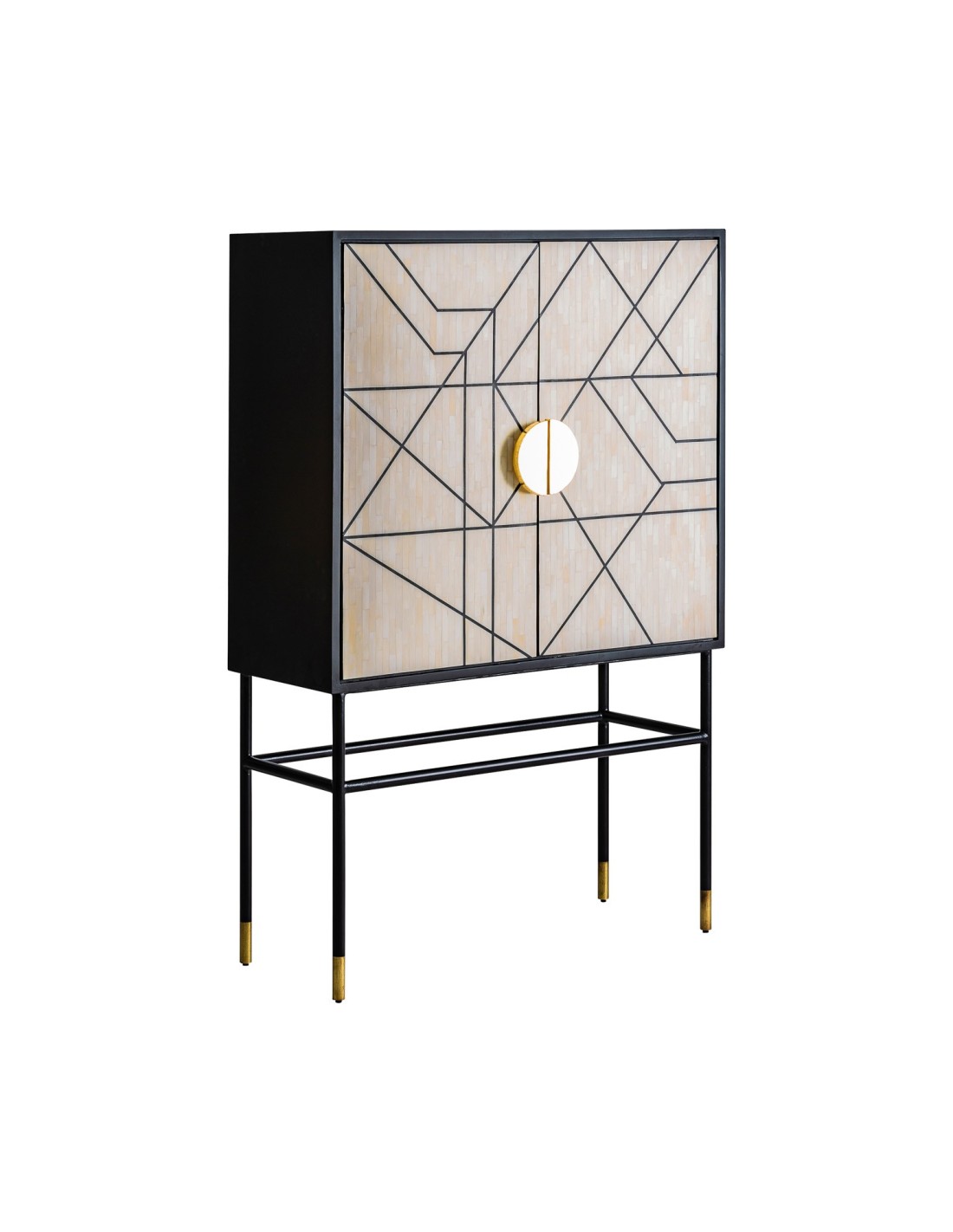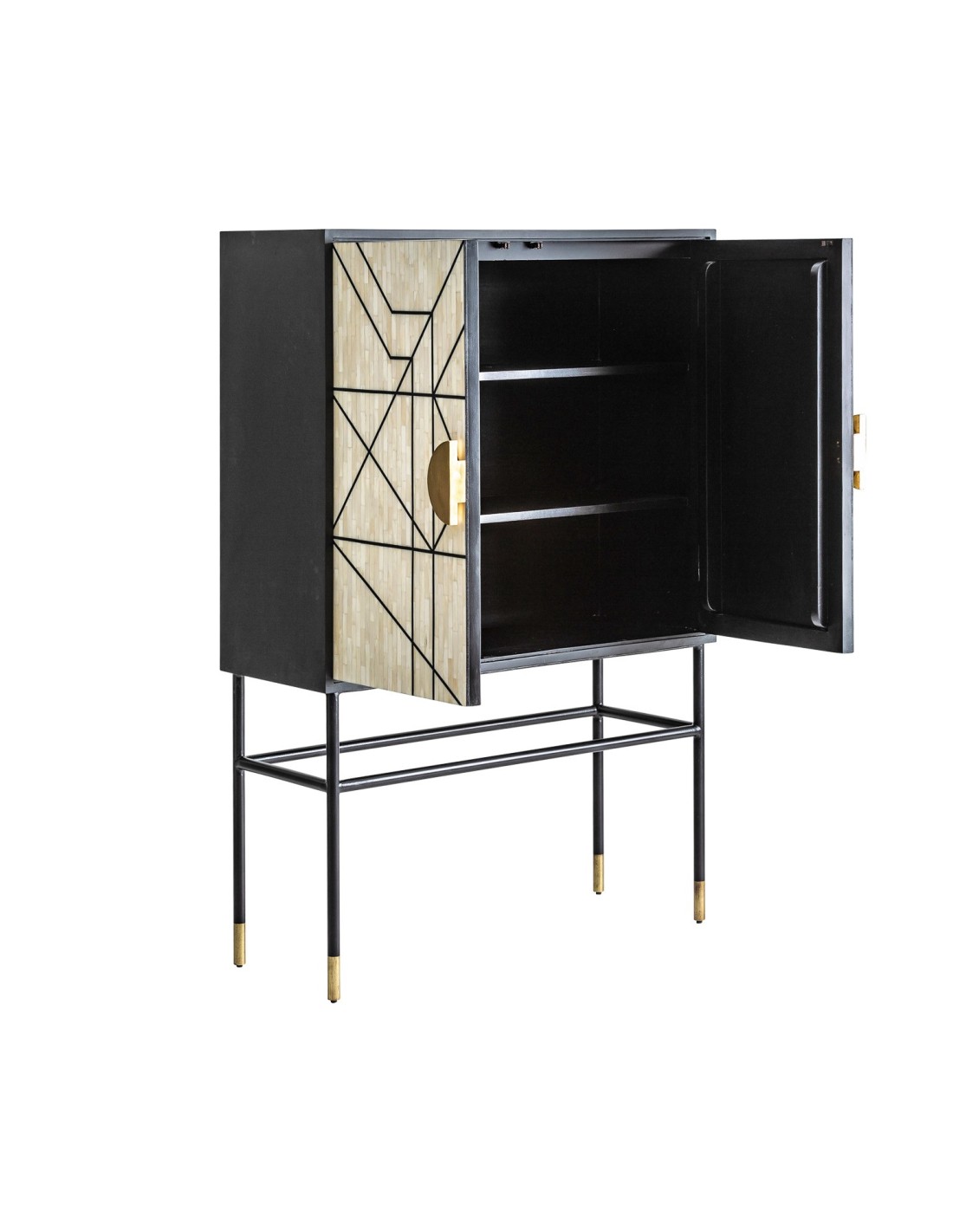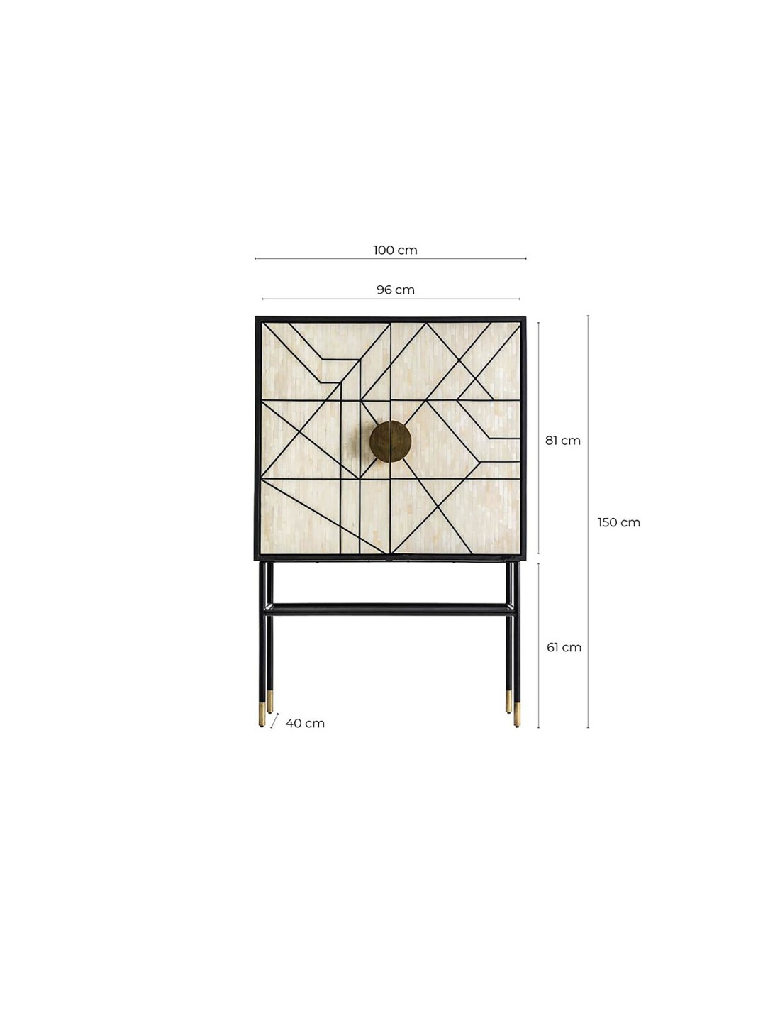 Sofisticado armario con un diseño ecléctico y contemporáneo que combina negro tonos naturales y dorados. Elaborado en madera y hierro el armario Delme es una pieza de última tendencia que aporta un nivel superior a cualquier estancia. Las formas geométricas están más presentes que nunca en la decoración de interiores y esta pieza cumple con esta premisa además de destacar por méritos propios: consigue convertirse en foco de atención y romper con la monotonía de cualquier espacio.