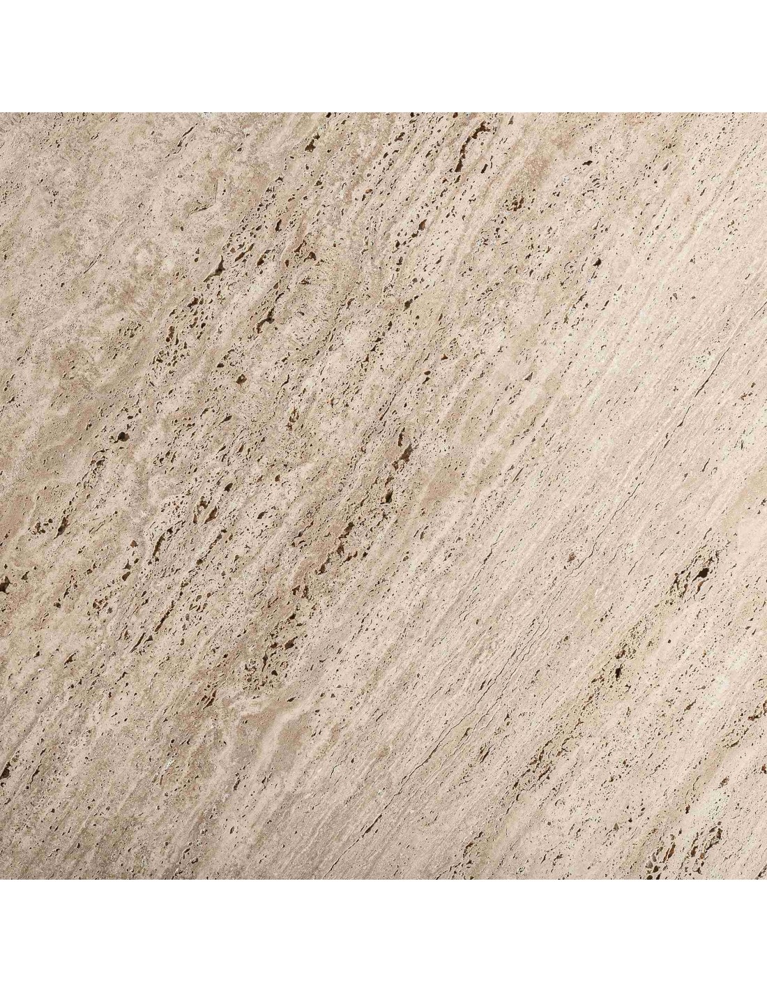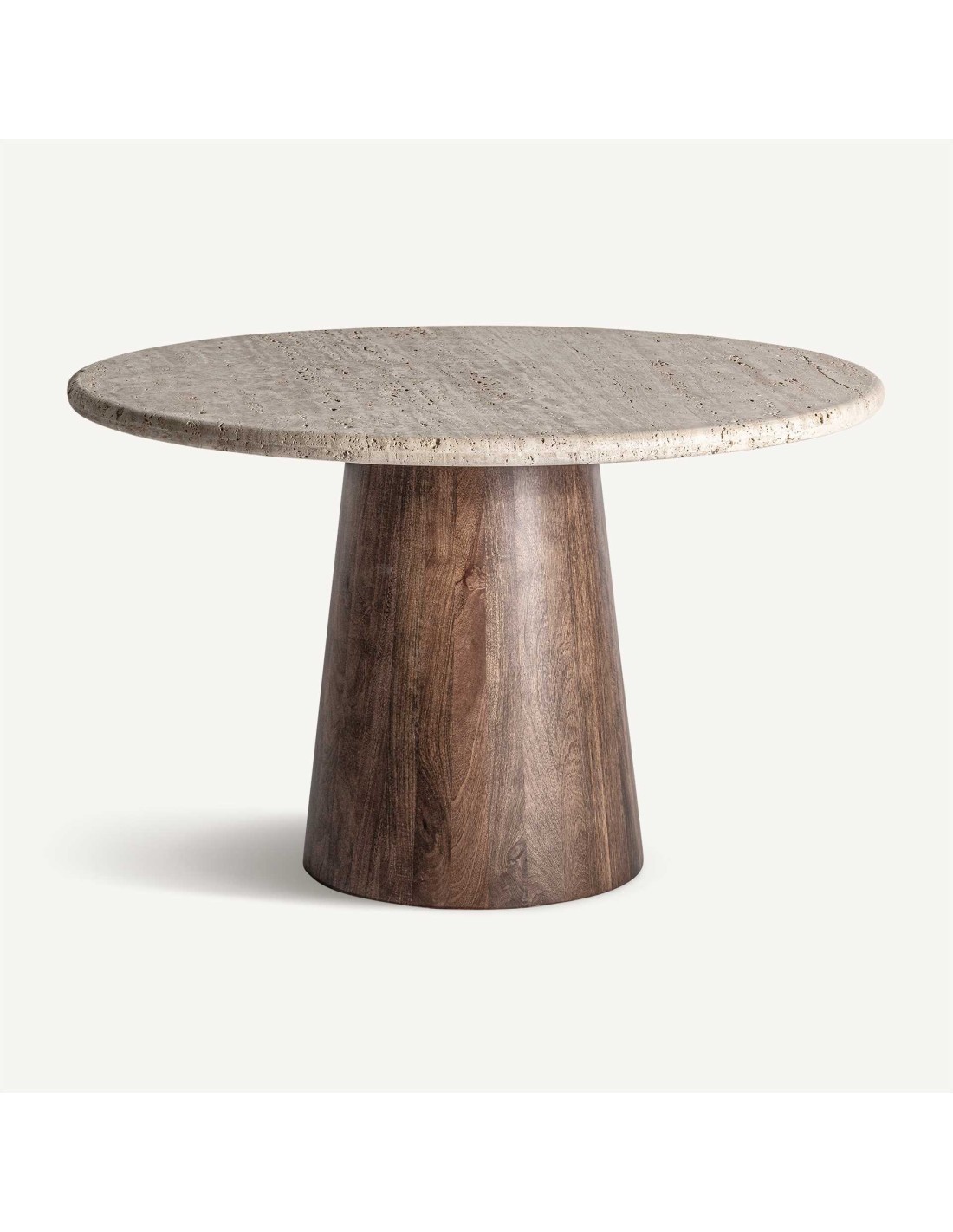 Mesa de comedor Varzi de Vical Home, una pieza sofisticada de diseño Art Decó, elaborada en piedra travertino beige y madera de mango color marrón. Una obra de arte funcional para interiores de lujo.