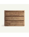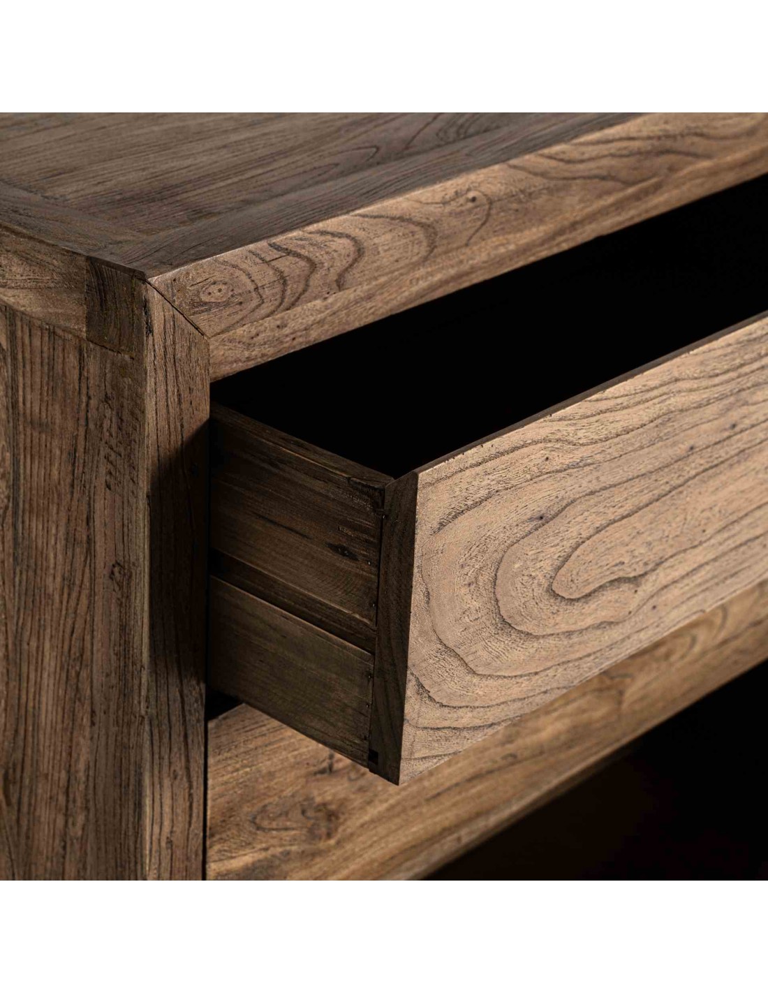 La Cómoda Norvik de 180 cm de Vical Home es una pieza de mobiliario contemporáneo que destaca por su gran capacidad de almacenaje y su diseño cálido y minimalista. Fabricada en madera de olmo natural en acabado marrón, esta cómoda se convierte en una solución práctica y elegante para dormitorios modernos, suites de hotel o espacios residenciales de alto nivel.