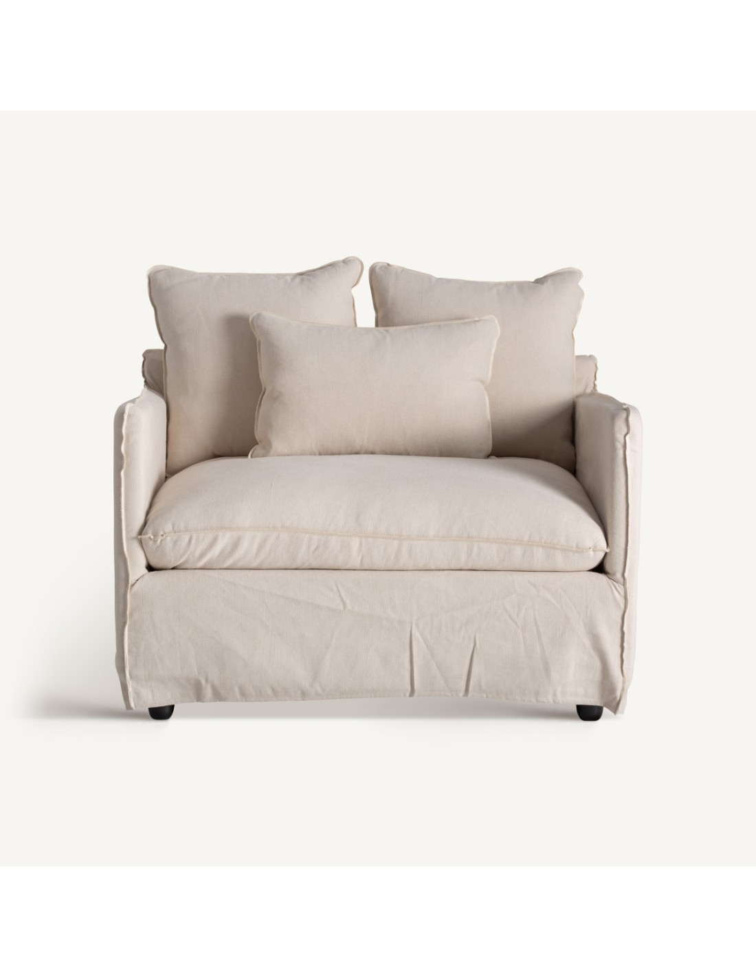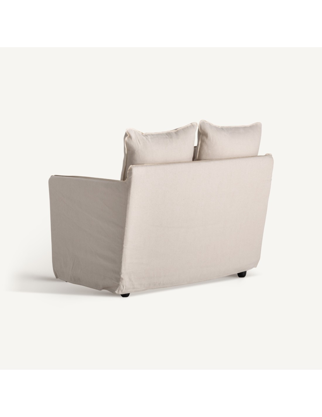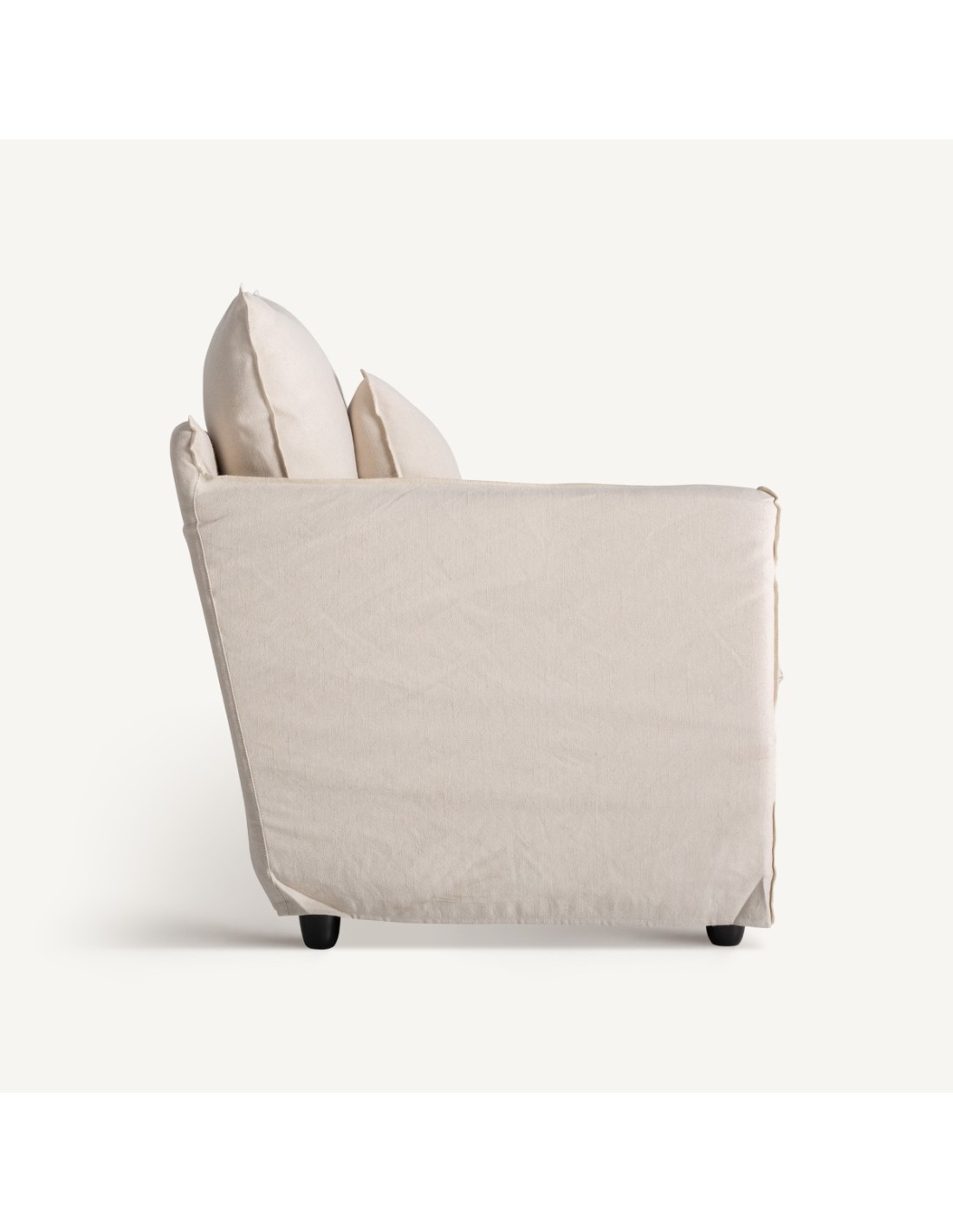 Tapizado en una mezcla de lino y algodón en color beige natural, aporta luminosidad, textura y una sensación de frescura. El asiento, relleno de espuma de alta densidad, garantiza una sentada envolvente y duradera. Además, es un modelo desenfundable, lo que facilita su limpieza y mantenimiento, siendo perfecto para hogares con niños o mascotas.