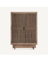 Sus puertas correderas de listones no solo aportan un acabado estético elegante y natural, sino que también ocultan lo superfluo, manteniendo el orden visual y realzando lo esencial en tu espacio. Este mueble crea una presencia serena que suaviza el impacto visual de las pantallas, generando un entorno acogedor y armonioso en tu salón o sala de estar.