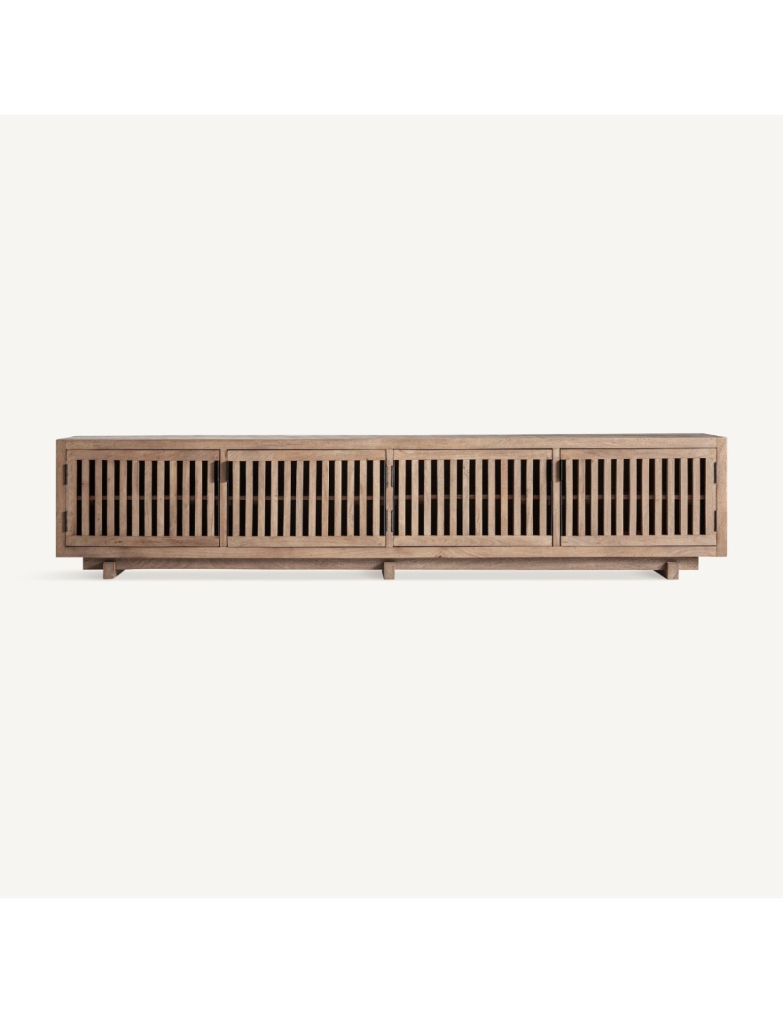 El Mueble TV GABIA de VICALDESIGN equilibra tecnología y sensibilidad. Con su generosa longitud y puertas correderas de listones ofrece un soporte estable y cálido que oculta lo superfluo y realza lo esencial. Su presencia serena acompaña la vida cotidiana suavizando incluso el impacto visual de las pantallas para crear un entorno acogedor y armónico.