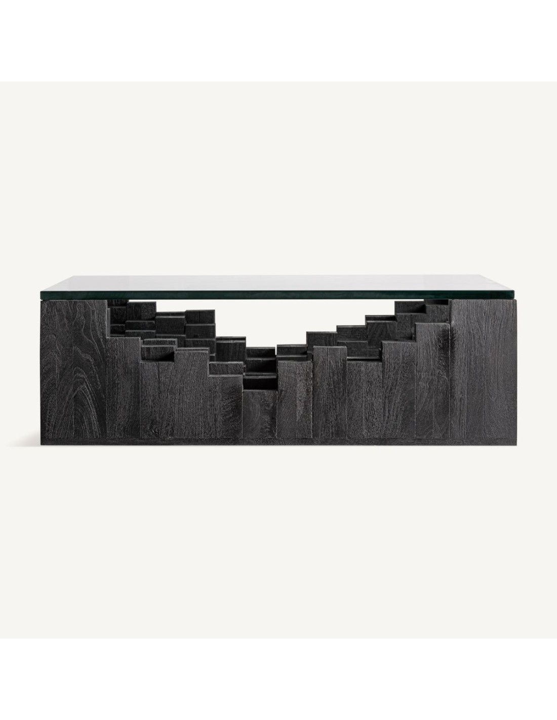 La Mesa de Centro PÈTRIA de VICALDESIGN es una pieza escultural que establece un diálogo visual y táctil entre dos elementos opuestos: la solidez de la piedra y la ligereza del vidrio. Su base geométrica, con formas que recuerdan a formaciones de basalto, sostiene un sobre de cristal que permite contemplar la estructura como si fueran estratos de historia geológica.