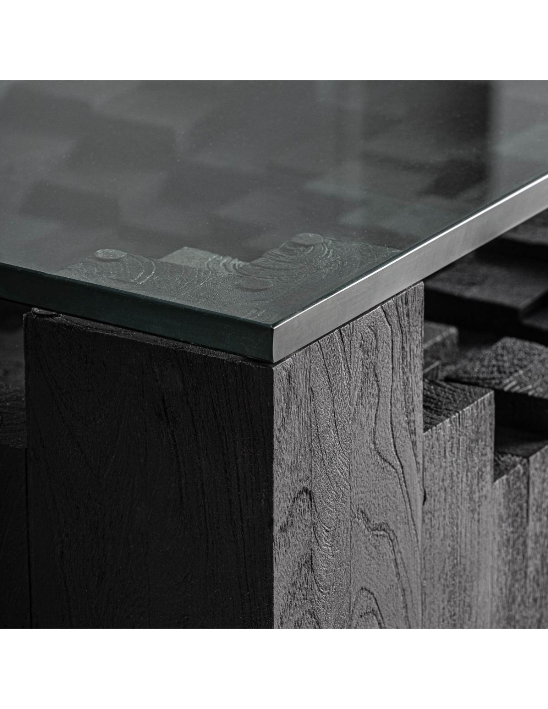 Con unas dimensiones de 98 cm de ancho y fondo, y 32 cm de altura, esta mesa de centro es perfecta para salones modernos que buscan un equilibrio entre la expresión material y la transparencia visual. El contraste entre lo mineral y lo etéreo genera una sensación de ligereza arquitectónica, sin renunciar a la contundencia estética del diseño brutalista.