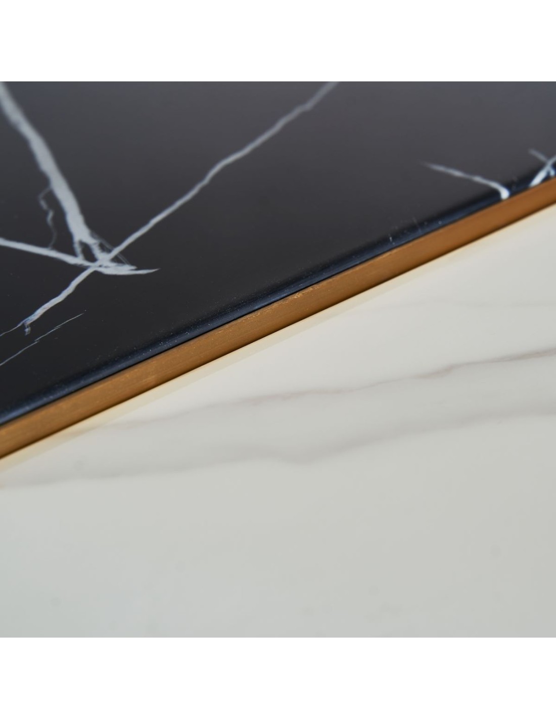 Su estructura robusta de acero y su sobre cerámico crean un juego de contrastes entre lo industrial y lo artístico, con un acabado en negro, blanco y dorado que añade dinamismo visual y un toque de lujo contemporáneo. Esta mesa no es solo funcional, sino también un elemento decorativo que transforma el espacio con su presencia gráfica y elegante.