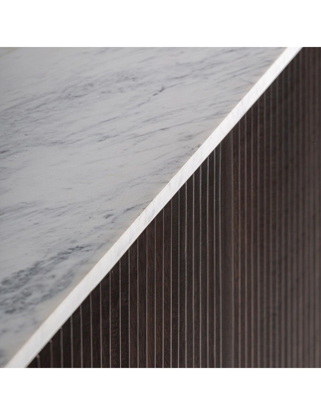 Combinación de texturas: madera cálida + mármol sofisticado.