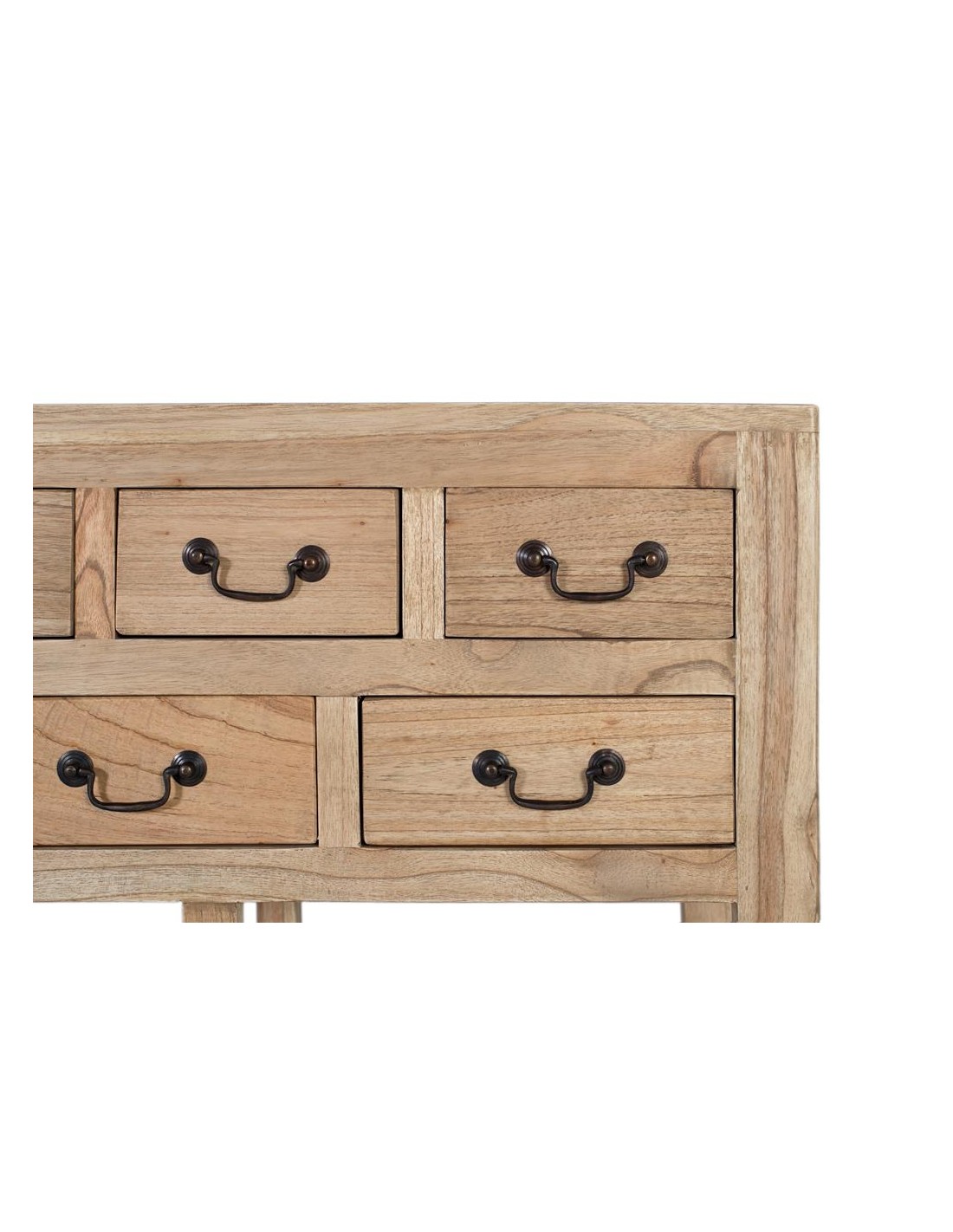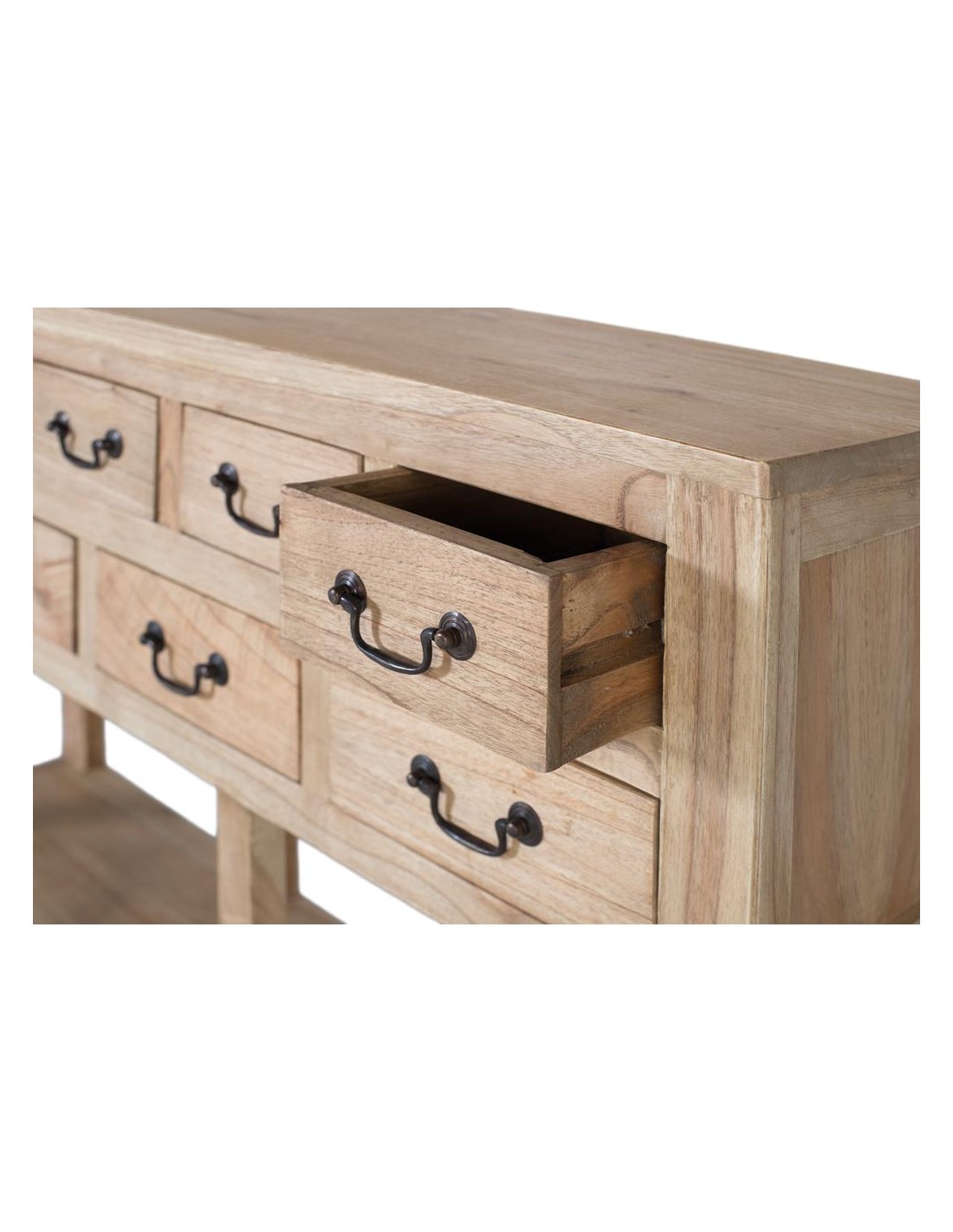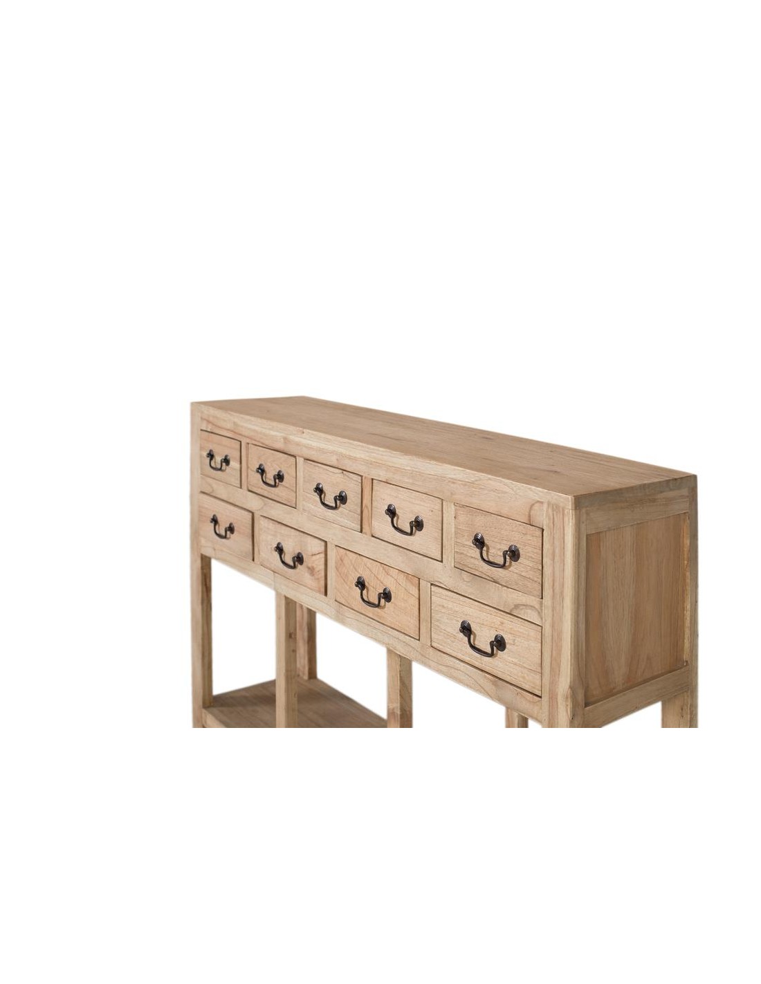 Añade calidez y funcionalidad a tu hogar con la consola de madera maciza de Giner y Colomer. Con 9 cajones, tiradores metálicos y balda inferior abierta, es perfecta para espacios naturales, campestres o coloniales.
