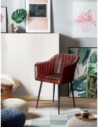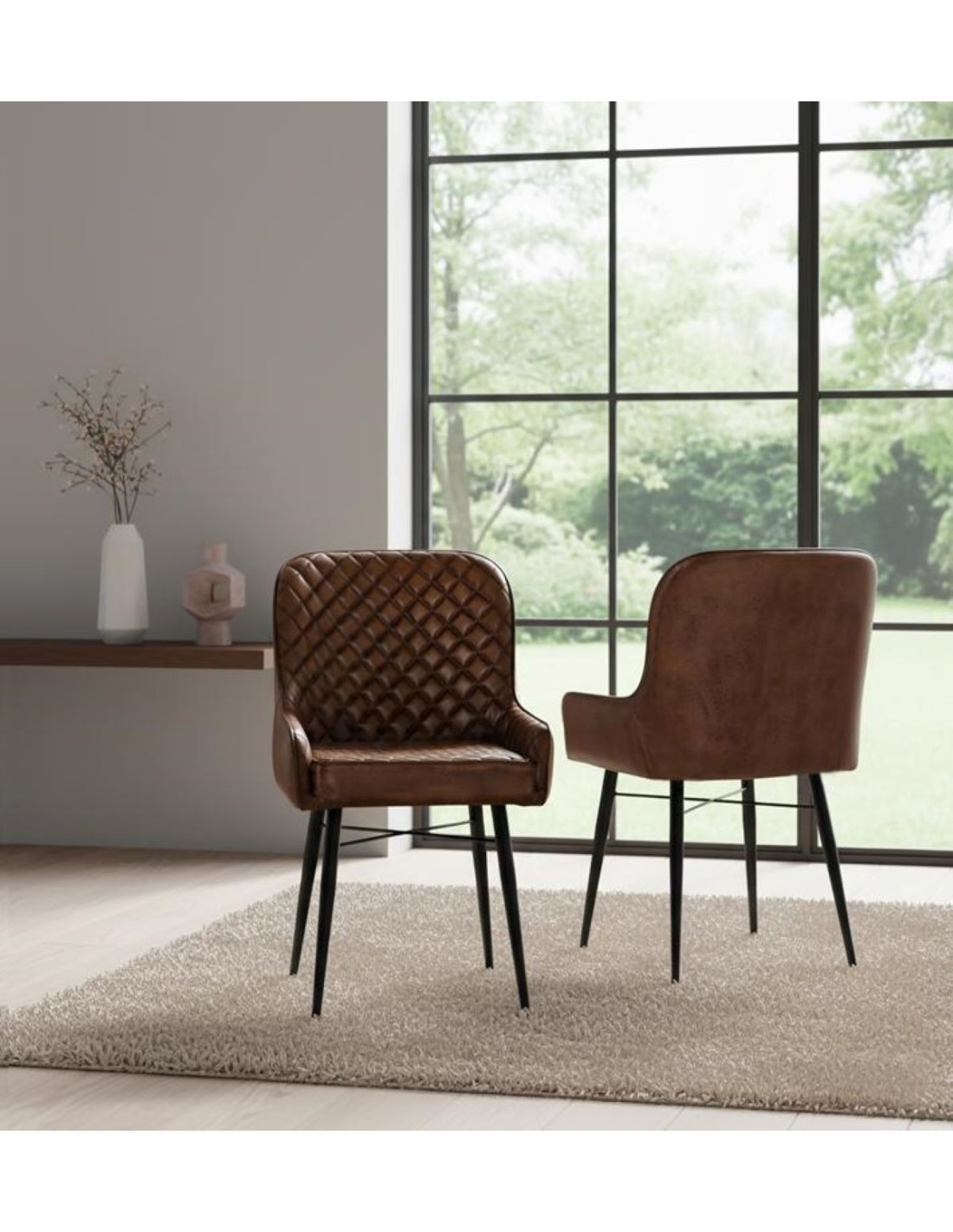 La silla de piel marrón envejecido de Giner y Colomer destaca por su diseño elegante y su tapizado capitoné en rombos. Con patas de hierro negro mate y forma envolvente, combina confort y sofisticación para comedores, despachos o espacios modernos.