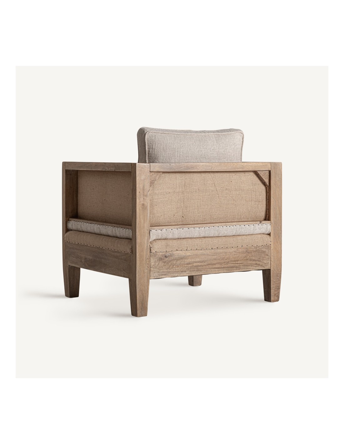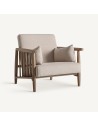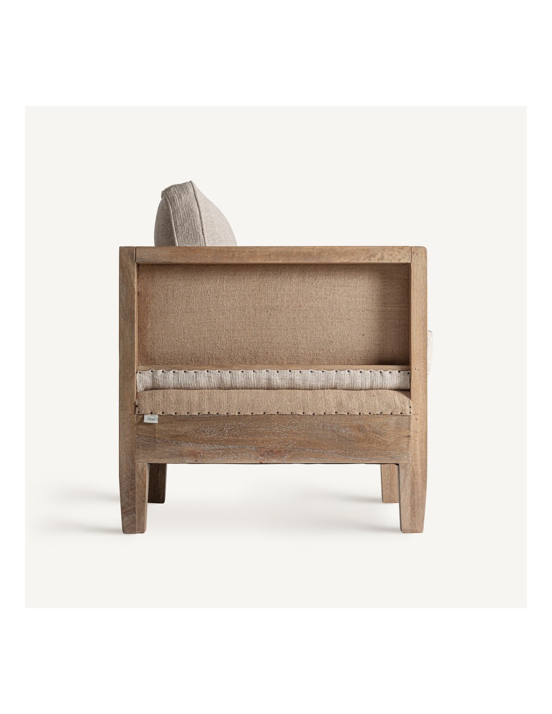 Está fabricado en madera de abedul marrón, con tapizado en lino beige y detalles en yute, combinando confort y estilo natural.