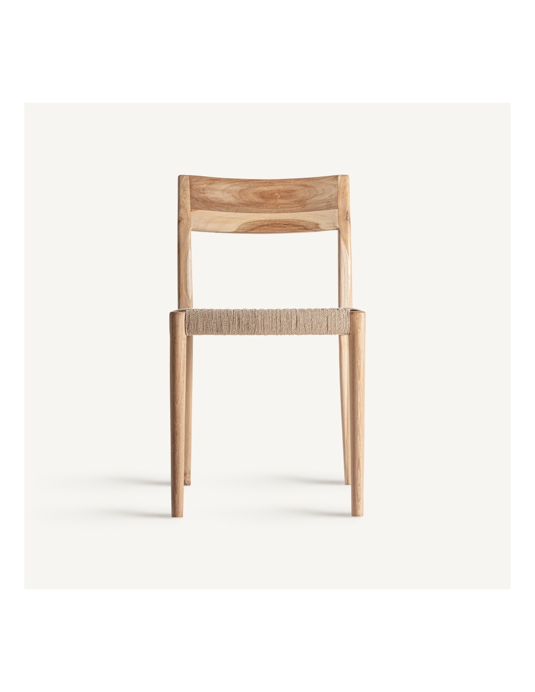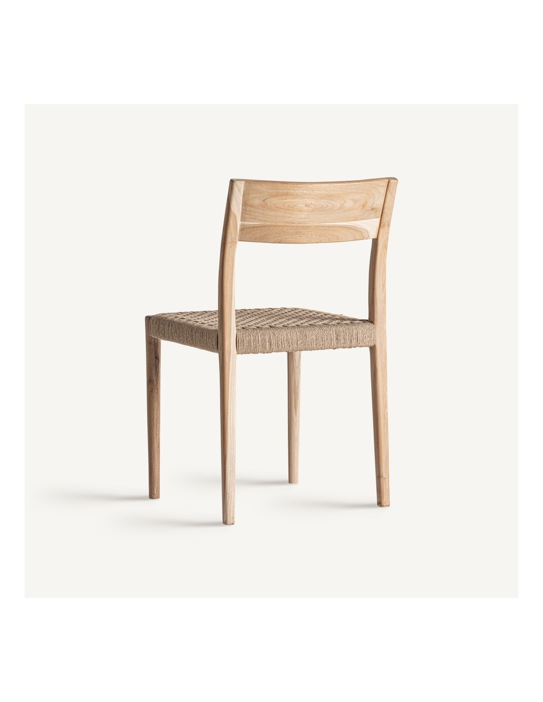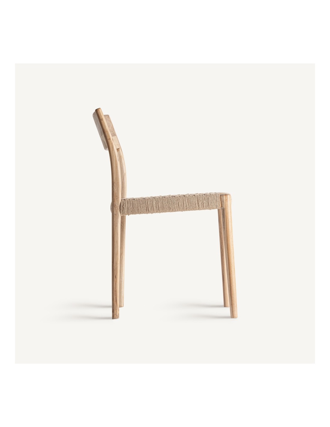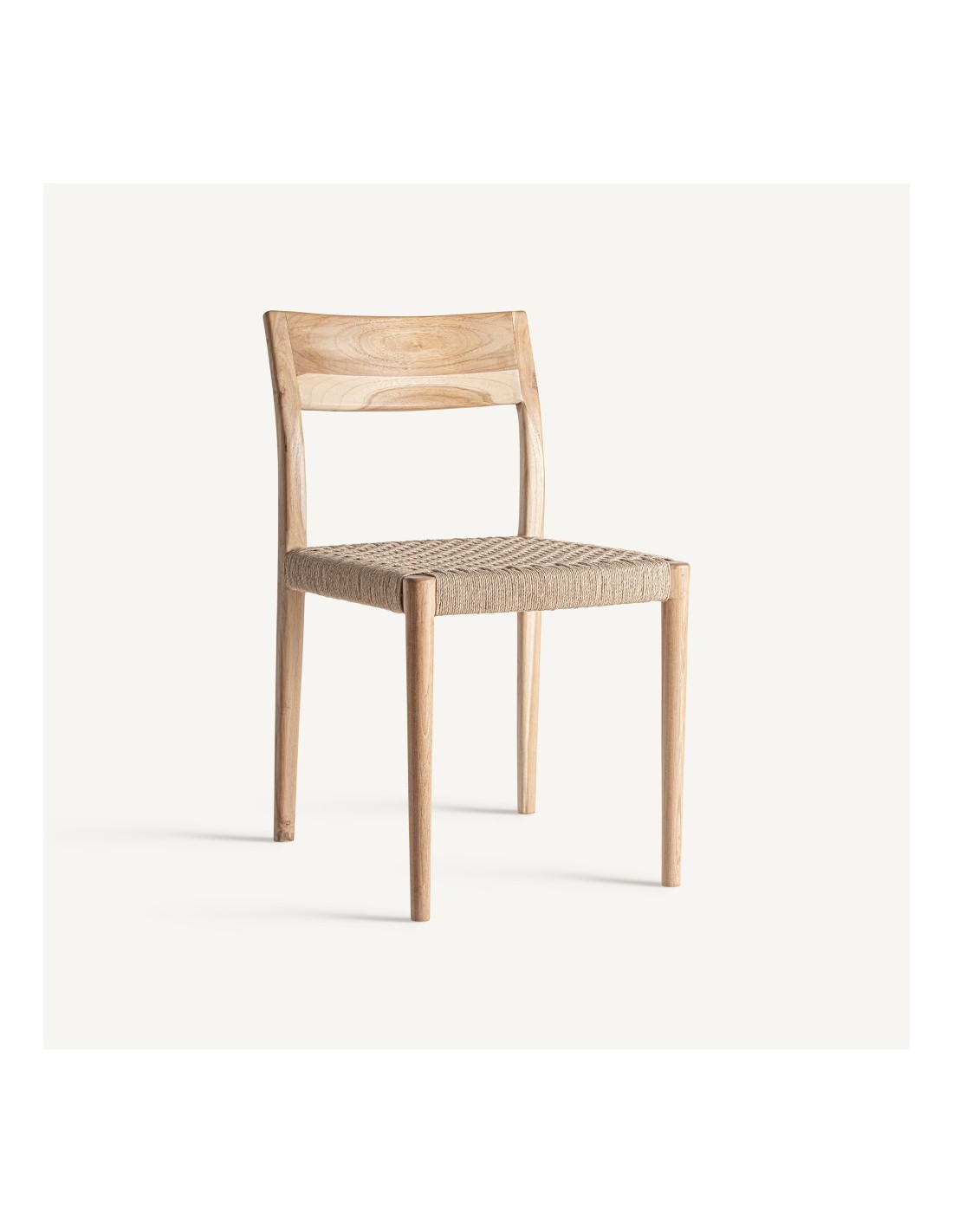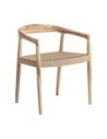 Fabricada en madera de teka maciza, su estructura robusta y refinada se complementa con un asiento trenzado en fibra natural, que aporta textura, confort y autenticidad. Su ligereza visual y capacidad de apilado la convierten en una silla versátil, perfecta tanto para espacios residenciales como proyectos contract (restaurantes, hoteles o zonas comunes).
