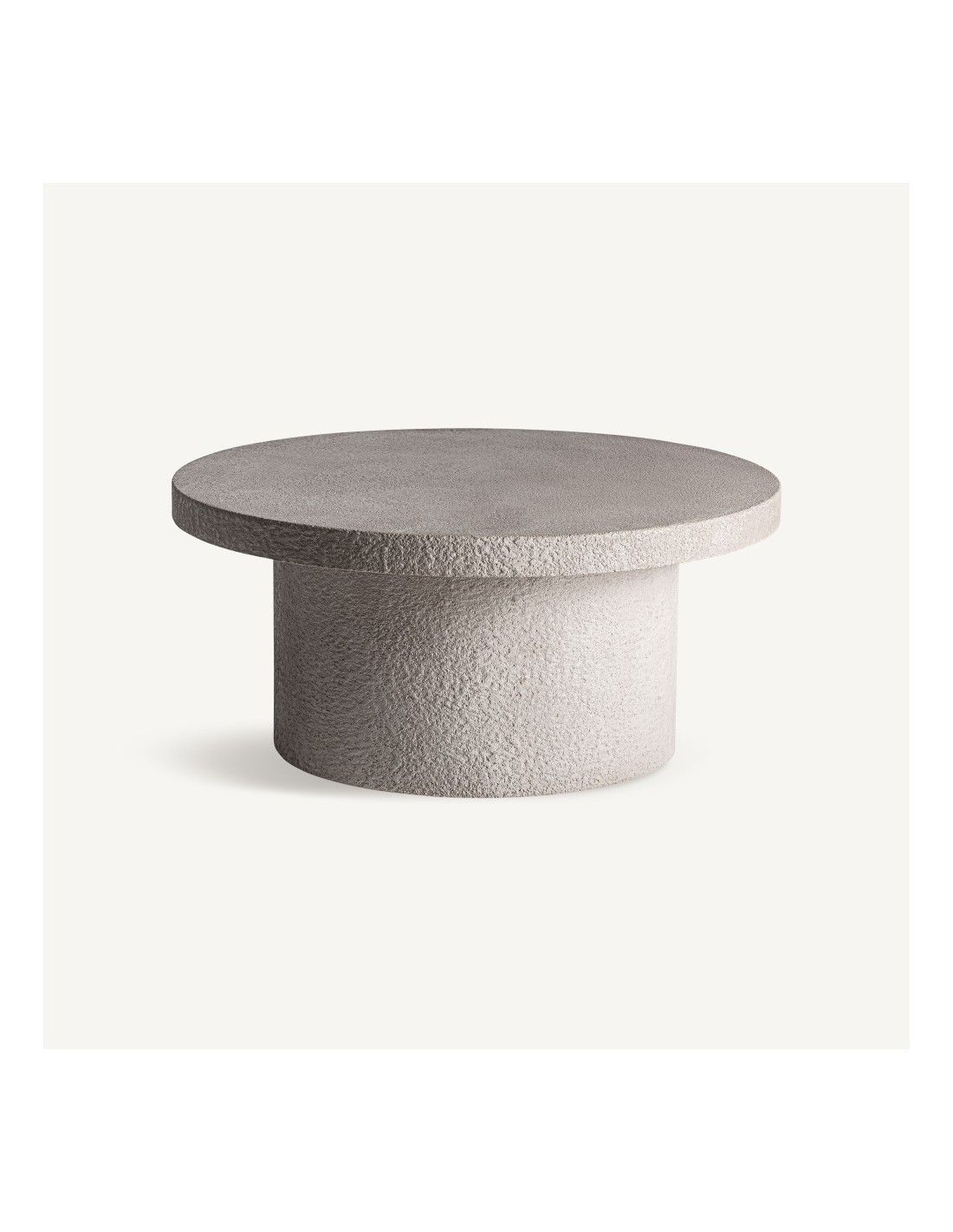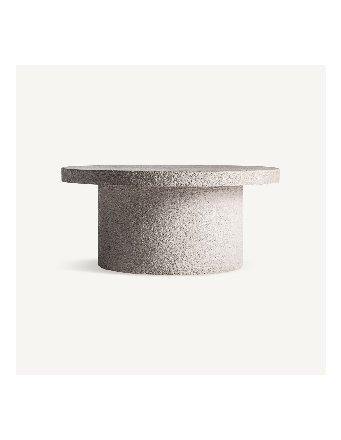 Mesa de centro Banfe de estilo contemporáneo, fabricada en cemento color blanco roto y base en madera DM. Una pieza robusta, moderna y minimalista diseñada por Vical Home, ideal para salones actuales y espacios de decoración exclusiva.