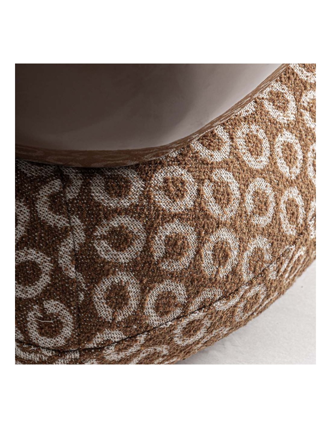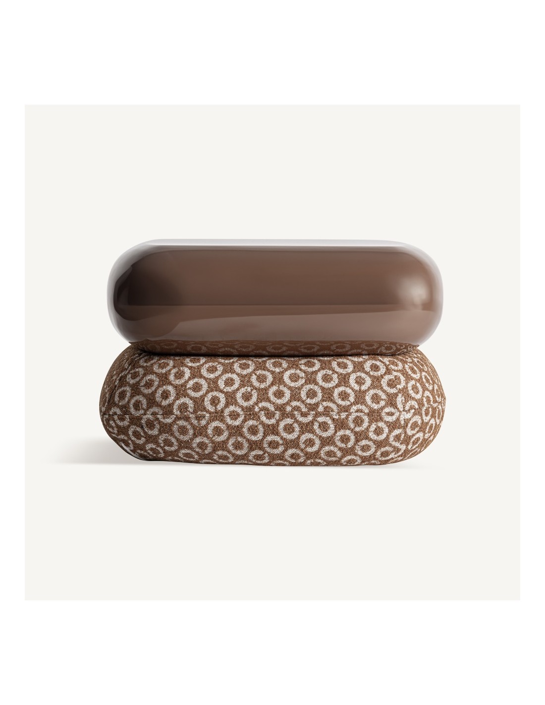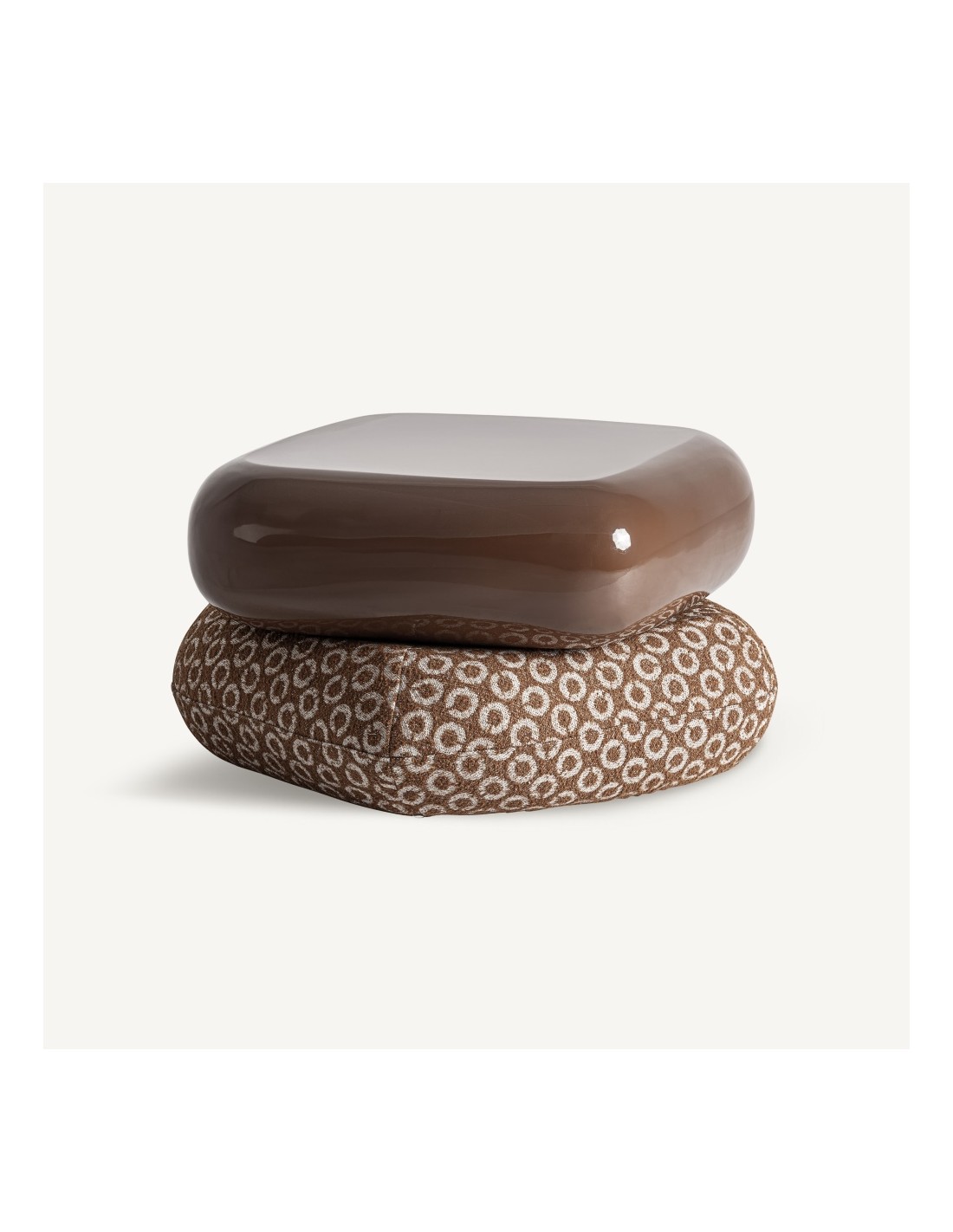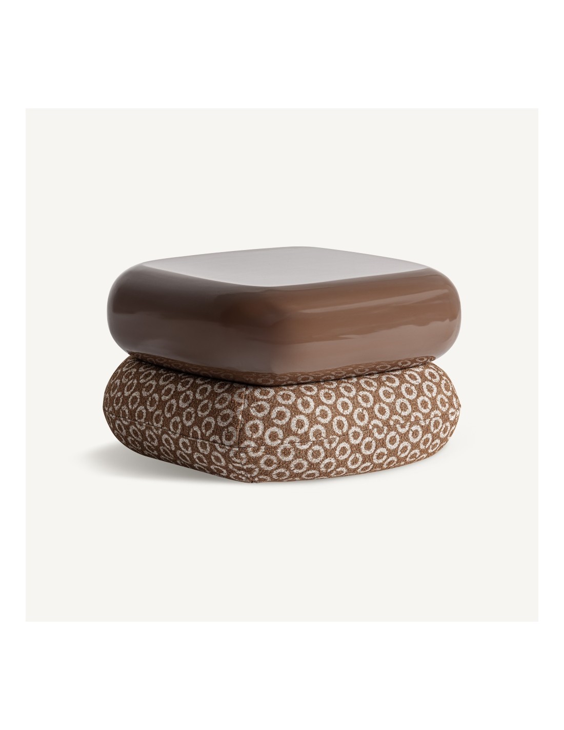 Reposapiés Wallau de estilo contemporáneo, acabado en madera DM brillo y tapizado en poliéster marrón estampado con espuma de alta densidad. Una pieza decorativa y funcional de Vical Home, perfecta para ambientes modernos y elegantes.