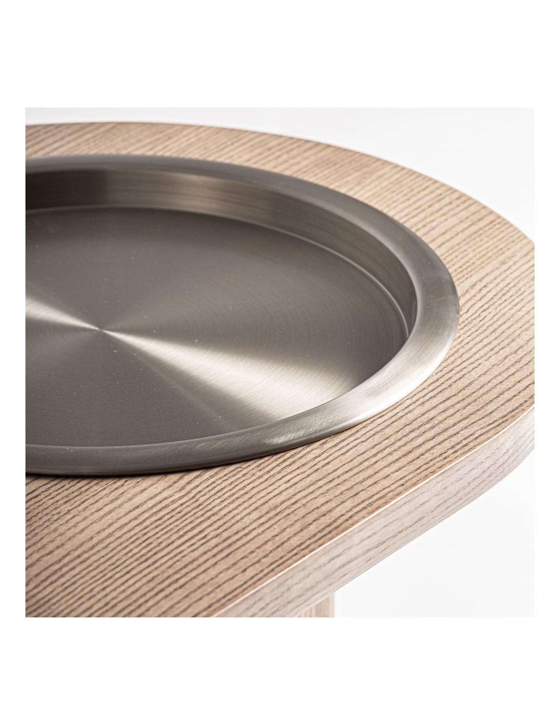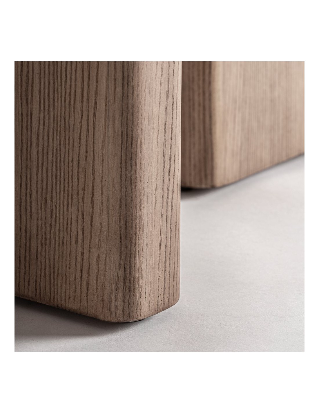 La base en madera DM asegura resistencia y firmeza, además de un contraste elegante con el acero y el poliéster.