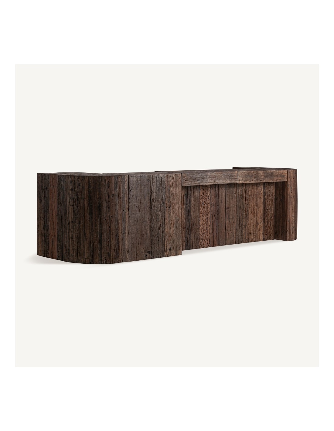 El Módulo Barra de Bar Landshut de Vical Home es una pieza de mobiliario que une funcionalidad, diseño y sostenibilidad. Fabricado en madera recuperada, cada módulo conserva la textura y el carácter único de la madera natural, aportando autenticidad y calidez al espacio.