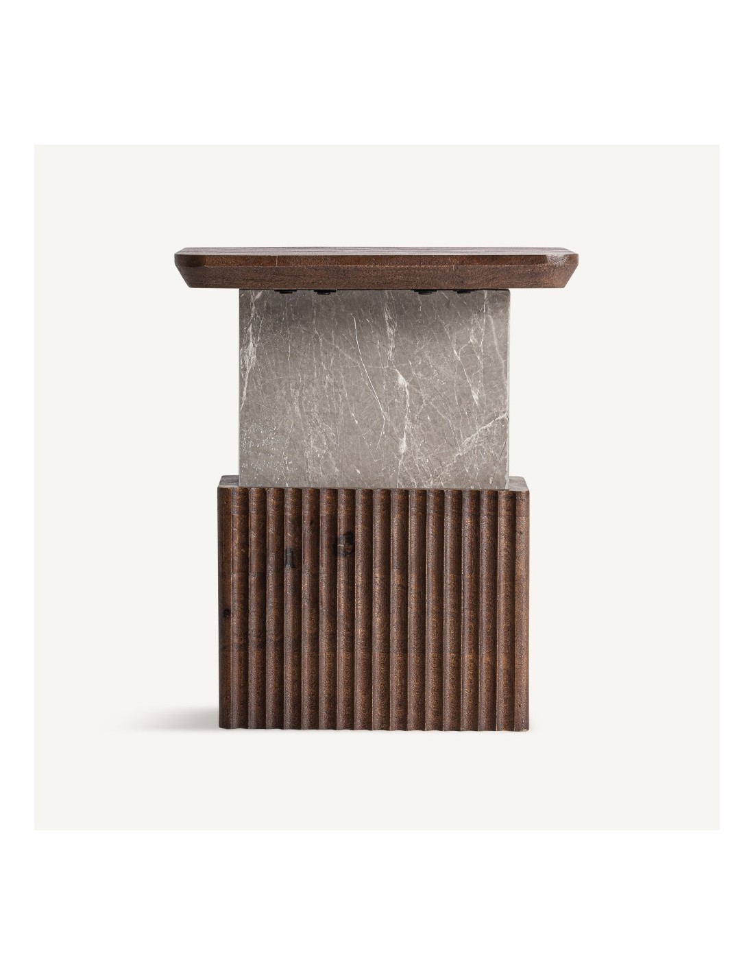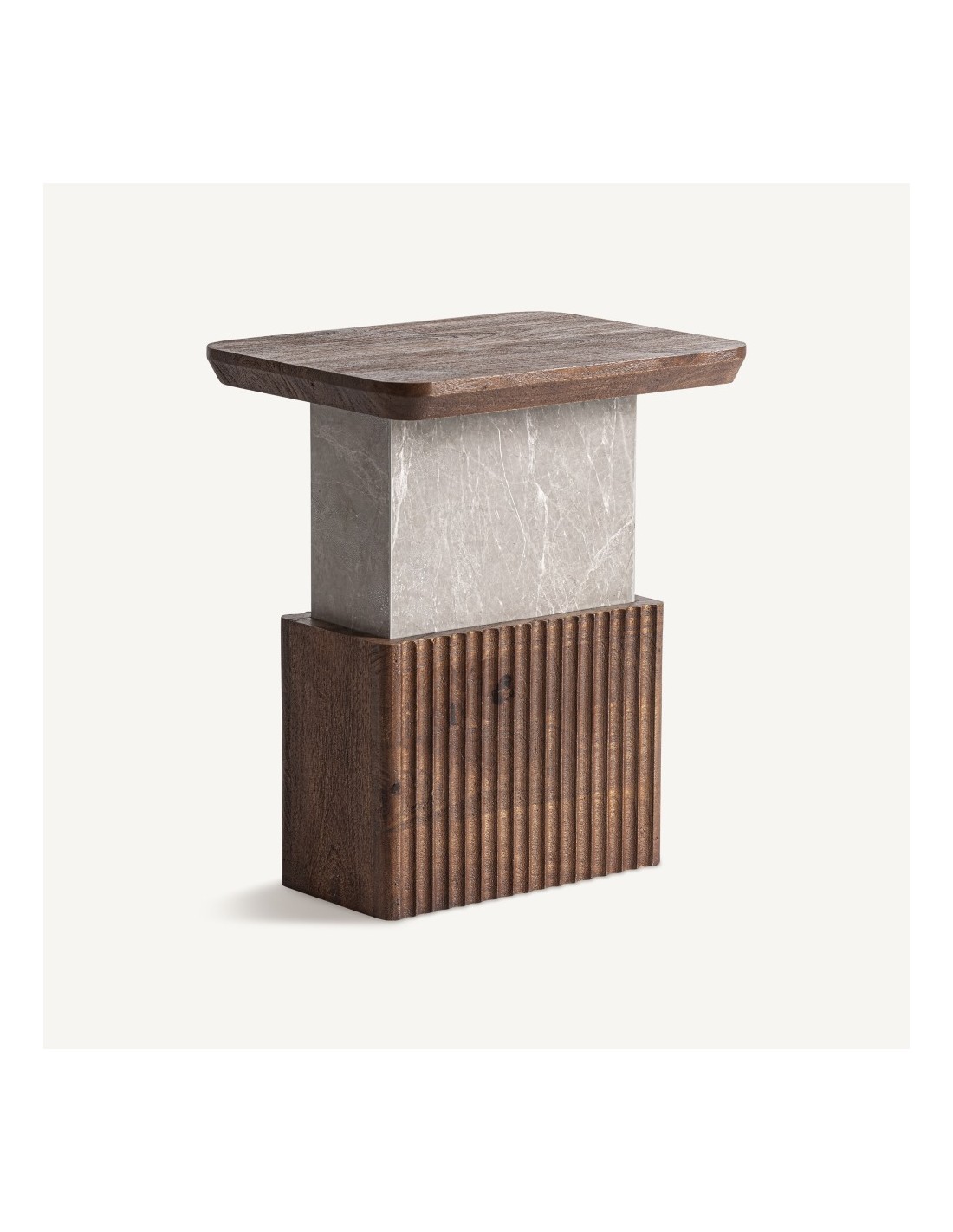 La mesa auxiliar Anzex de Vical Home combina la calidez de la madera maciza de mango en tono marrón con la elegancia del mármol gris veteado, creando una pieza de estilo contemporáneo sofisticada y funcional. Ideal para aportar diseño y carácter a salones modernos y espacios cuidados al detalle.