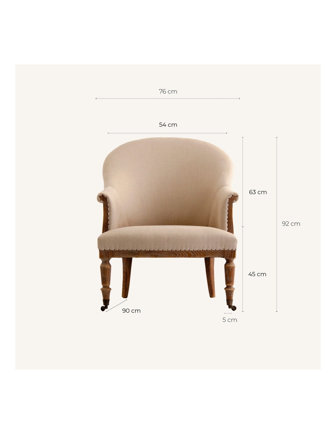 Con unas dimensiones de 76 cm de ancho, 90 cm de fondo y 92 cm de alto, proporciona una sentada cómoda y envolvente, ideal para salones, rincones de lectura o zonas de descanso. Su diseño transmite una sensación de bienestar y naturalidad, convirtiéndolo en una pieza funcional y decorativa a partes iguales.