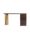Fabricado en chapa de nogal en color nogal con acabado satinado, este escritorio transmite calidez y elegancia natural. Se complementa con madera DM en color marrón con acabado mate, aportando estabilidad y durabilidad, y con acero inoxidable en color cobre con acabado cepillado, un detalle distintivo que refuerza su carácter sofisticado y contemporáneo.