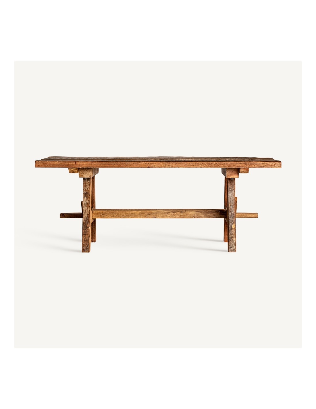 Su acabado envejecido y su estructura sólida aportan una sensación de robustez y autenticidad, ideal para proyectos de decoración que buscan sostenibilidad, personalidad y materiales nobles. Es un banco perfecto tanto como asiento auxiliar como elemento decorativo en entradas, salones, dormitorios o espacios comerciales.