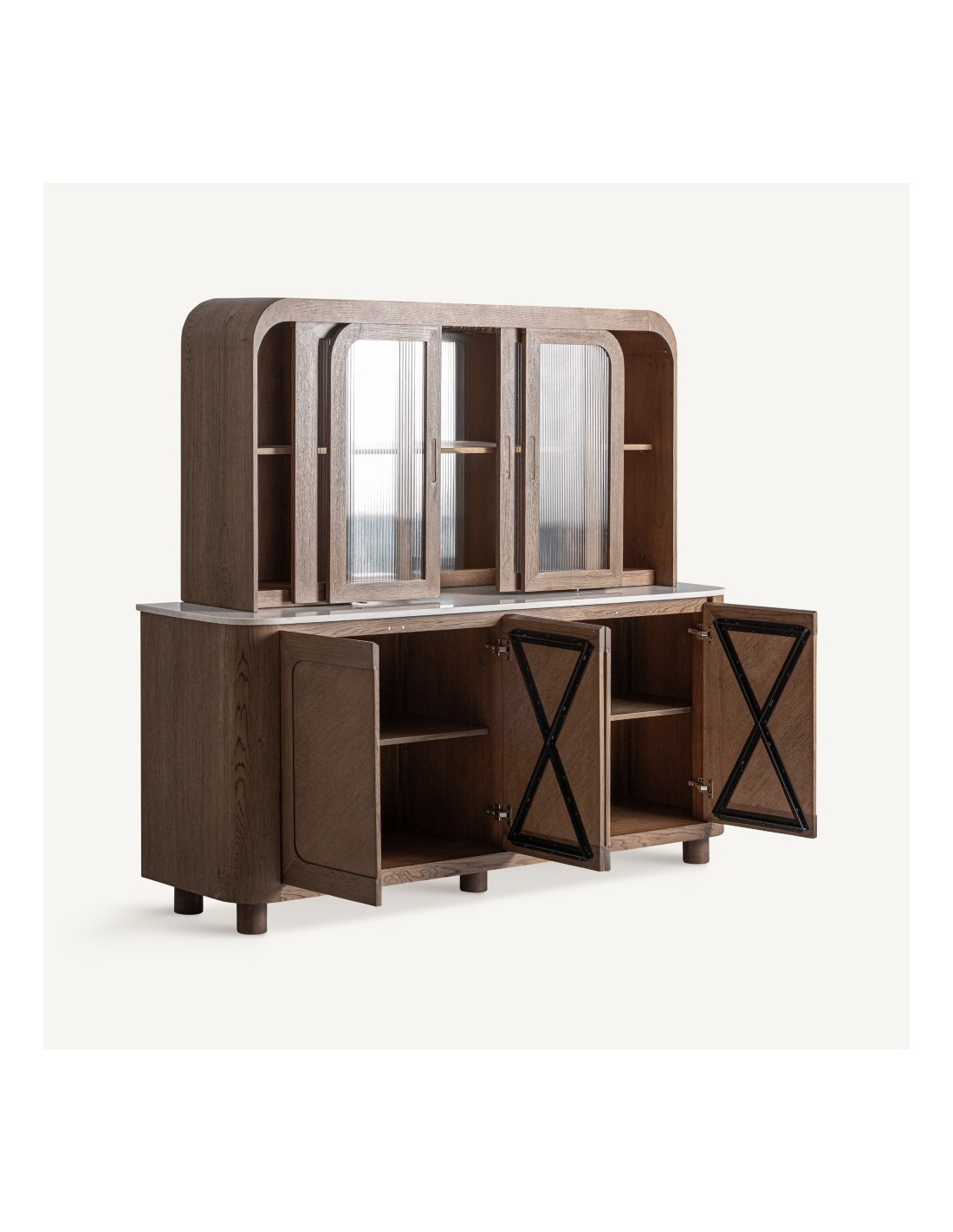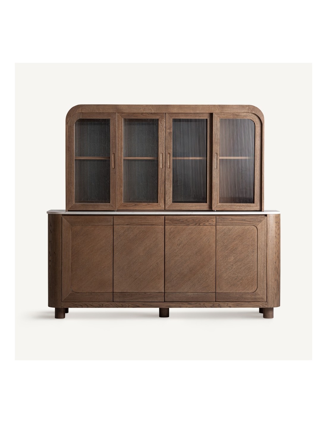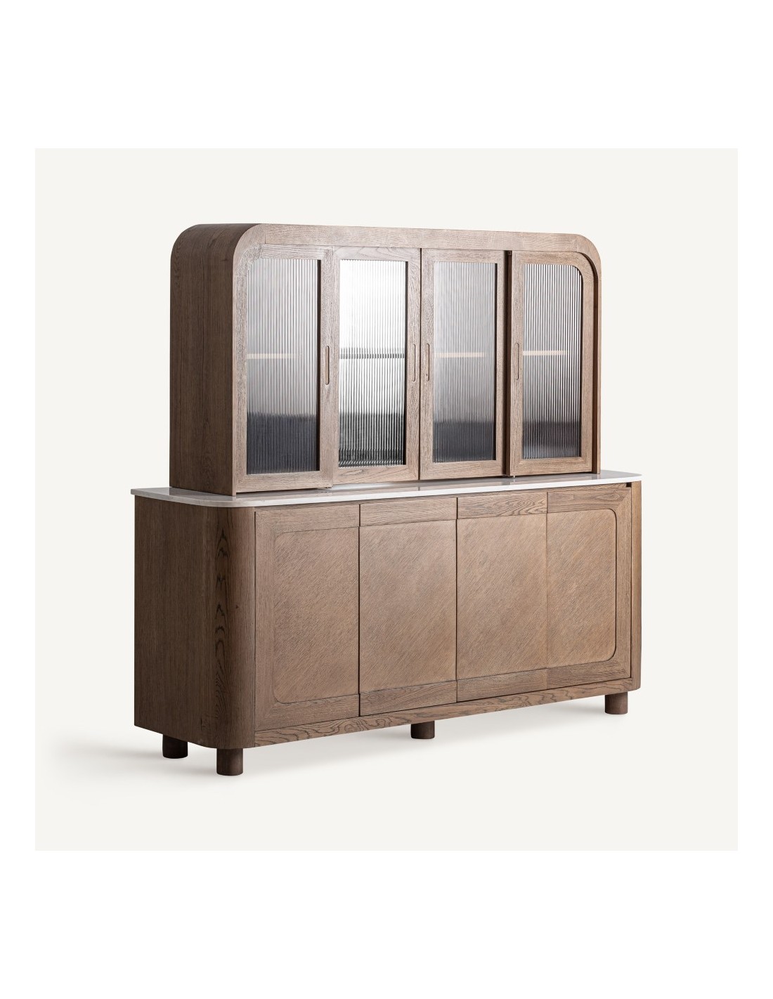 Conjunto de mueble bar, vitrina y aparador de VICAL Home en madera de roble marrón, combinado con mármol blanco y cristal transparente. Diseño elegante y funcional ideal para salones y comedores modernos.