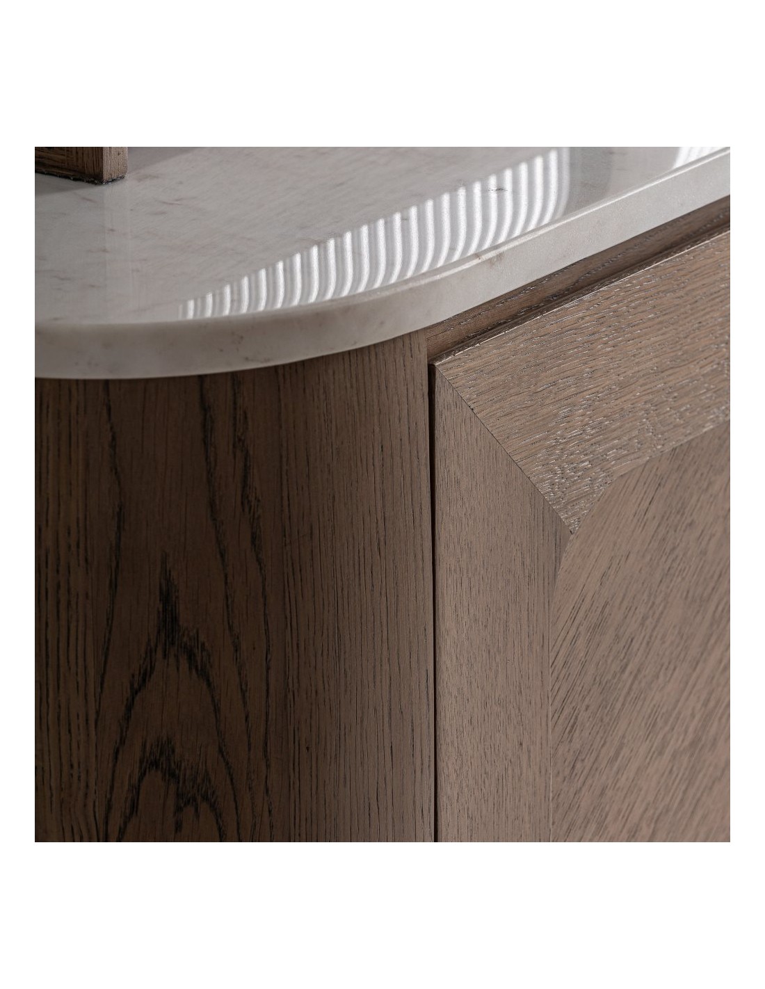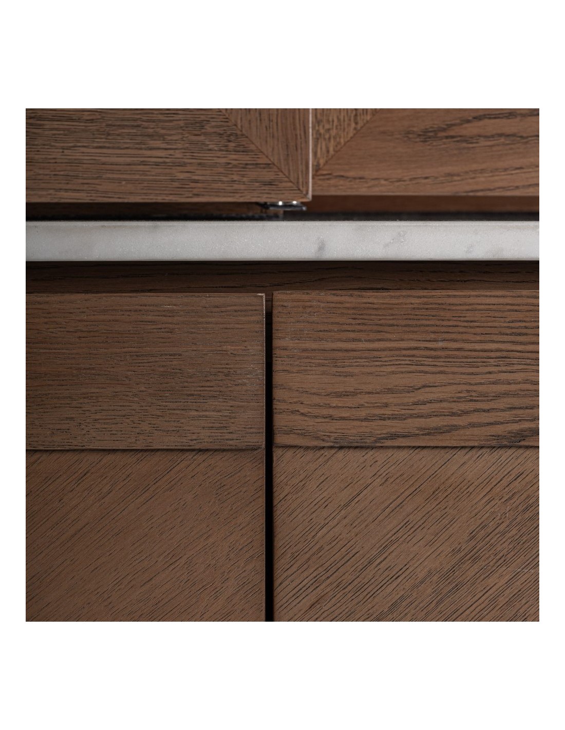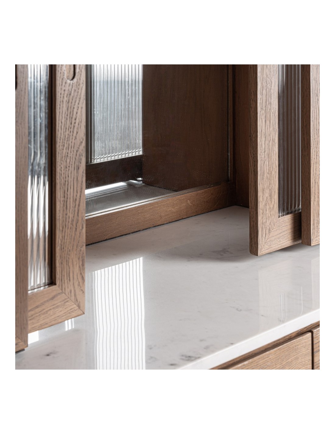 La combinación de roble con mármol blanco aporta un equilibrio perfecto entre calidez y lujo discreto, mientras que el cristal transparente añade ligereza visual y un toque contemporáneo. Es una solución ideal para crear un espacio de bar en casa, organizar vajillas y cristalería o decorar un comedor con un estilo elegante y moderno.