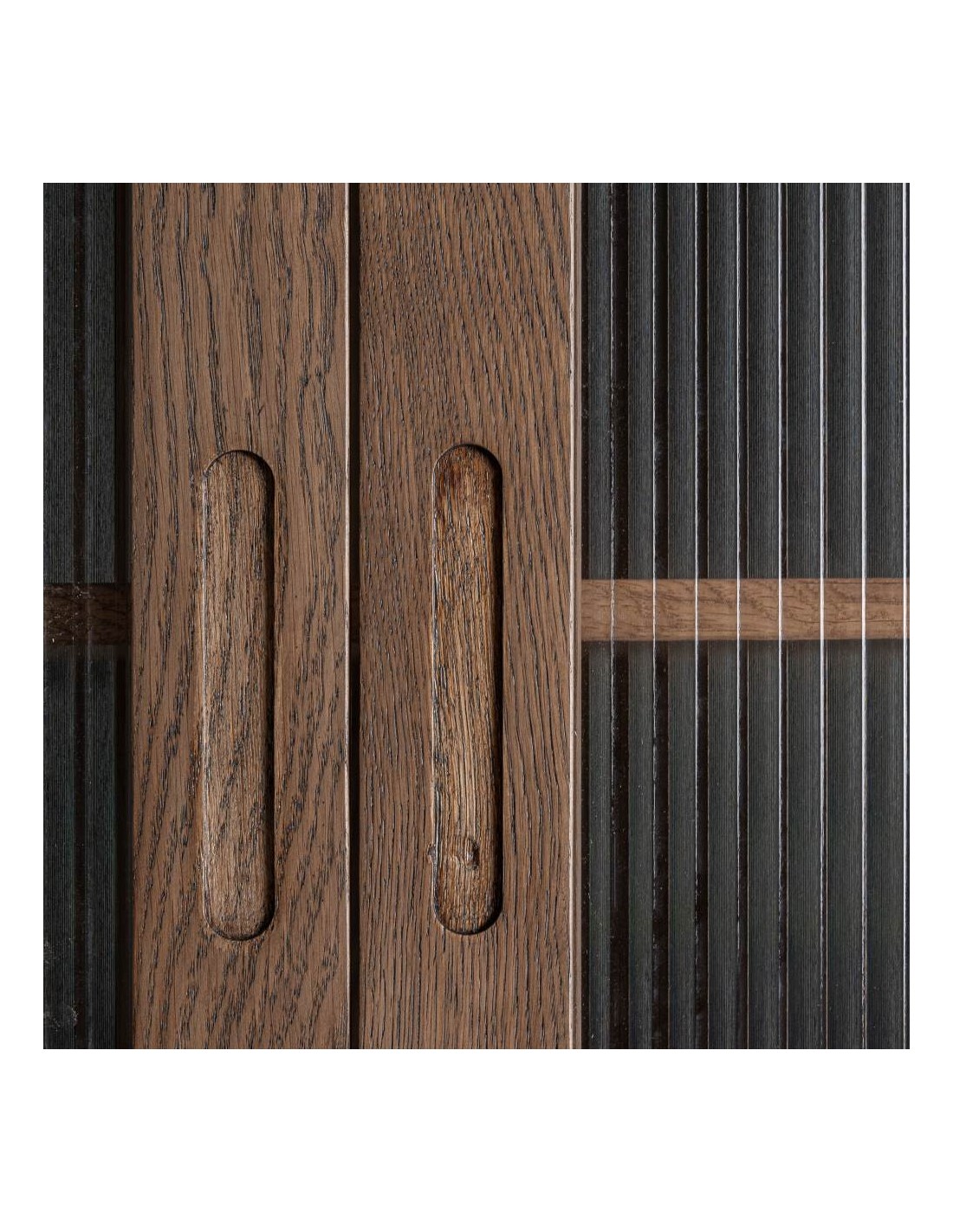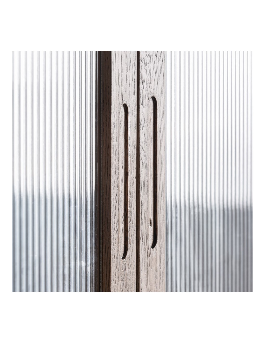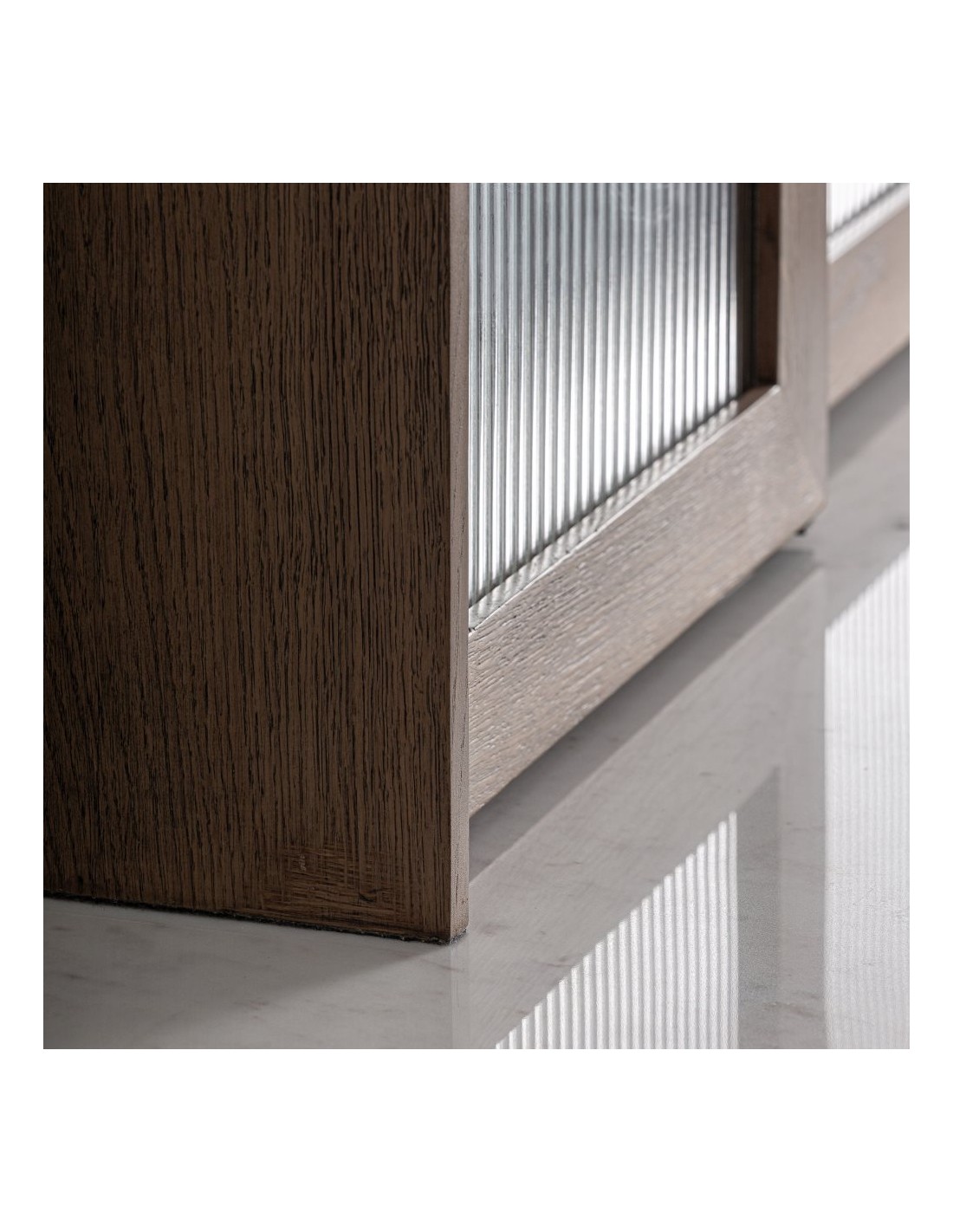 La combinación de roble con mármol blanco aporta un equilibrio perfecto entre calidez y lujo discreto, mientras que el cristal transparente añade ligereza visual y un toque contemporáneo. Es una solución ideal para crear un espacio de bar en casa, organizar vajillas y cristalería o decorar un comedor con un estilo elegante y moderno.