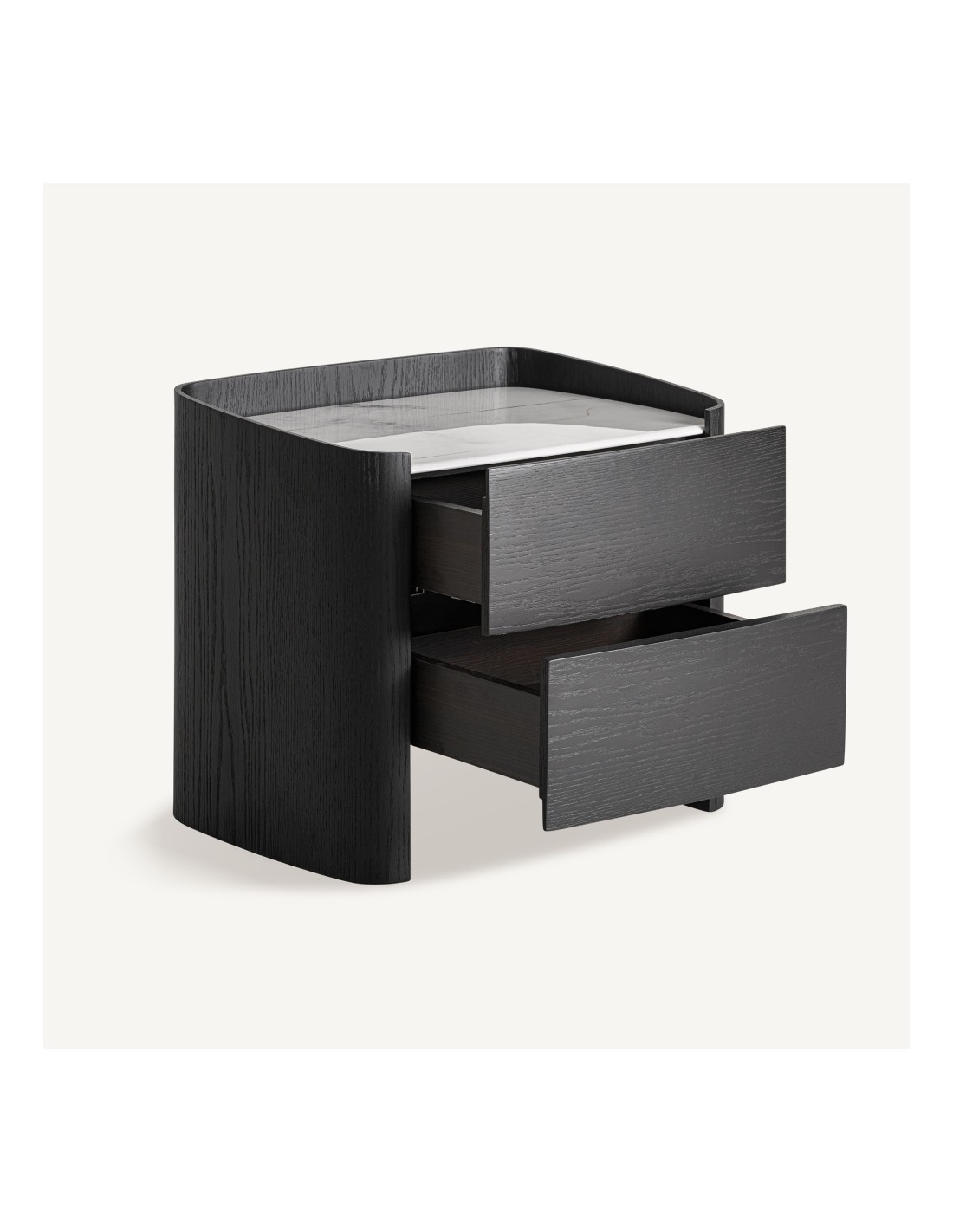 La mesita de noche Haesa de VICAL Home combina líneas contemporáneas con materiales de alta calidad para crear una pieza elegante y funcional. Fabricada en madera contrachapada negra con chapa de roble en el mismo tono y un sobre de piedra sinterizada, esta mesita ofrece una estética equilibrada, duradera y atemporal.