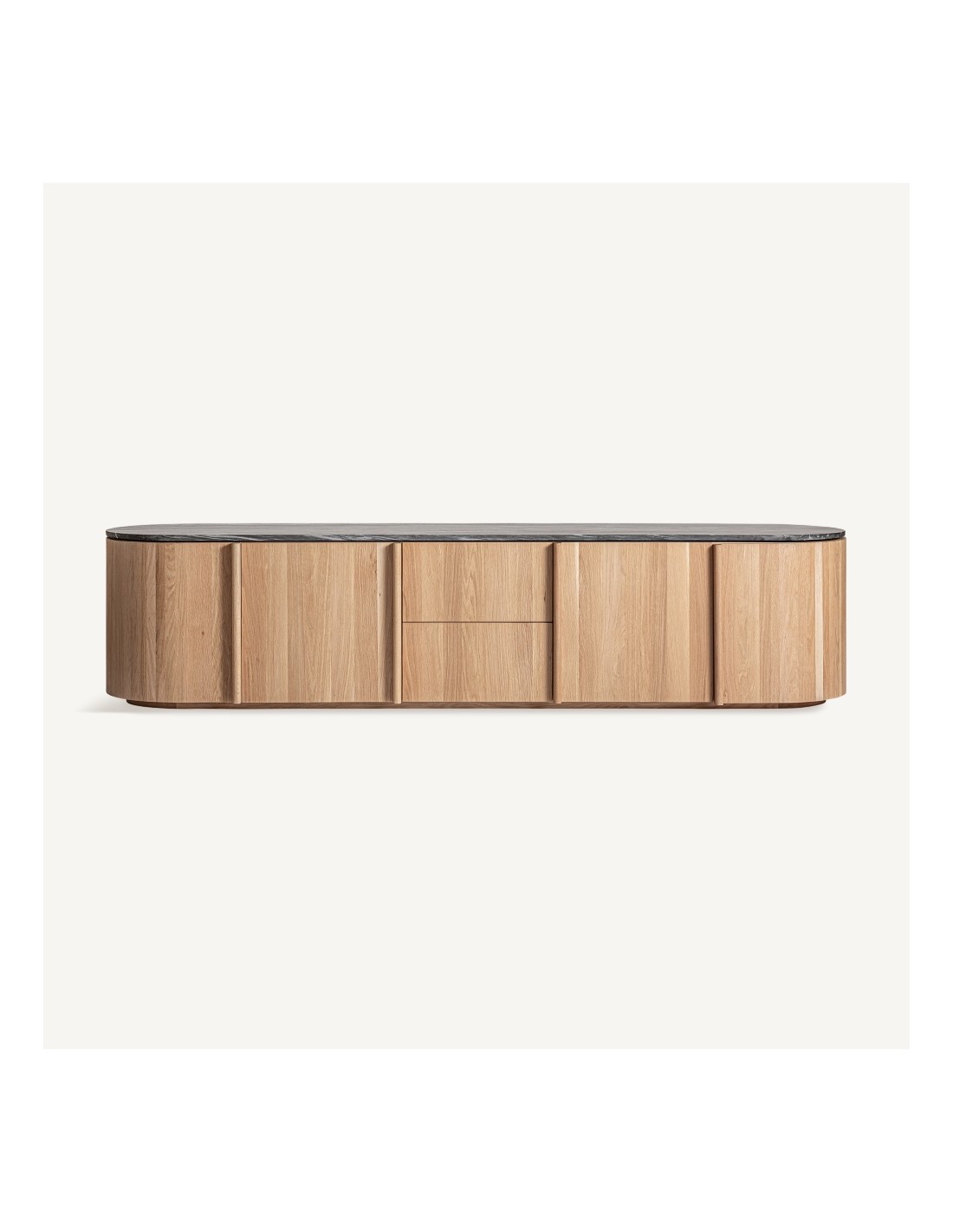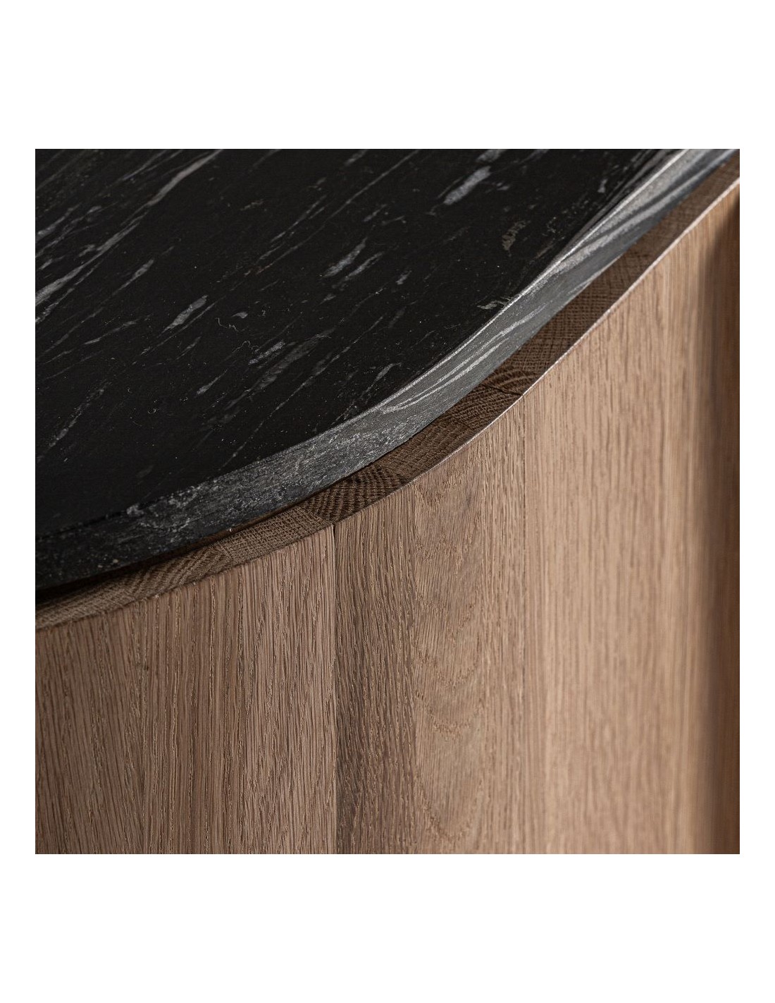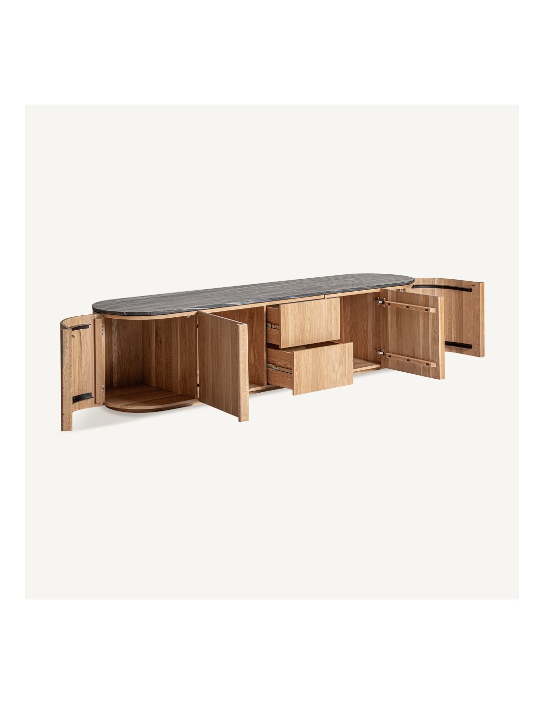 Aparador Nara de Vical Home fabricado en madera de roble en color marrón claro y combinado con mármol negro. Un mueble contemporáneo, elegante y funcional, ideal para salones y comedores modernos.