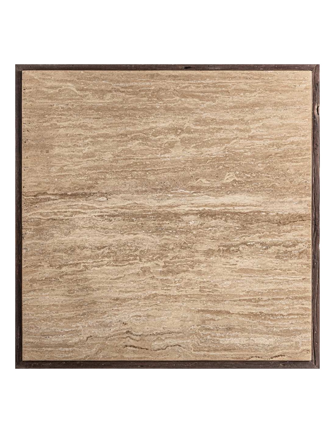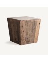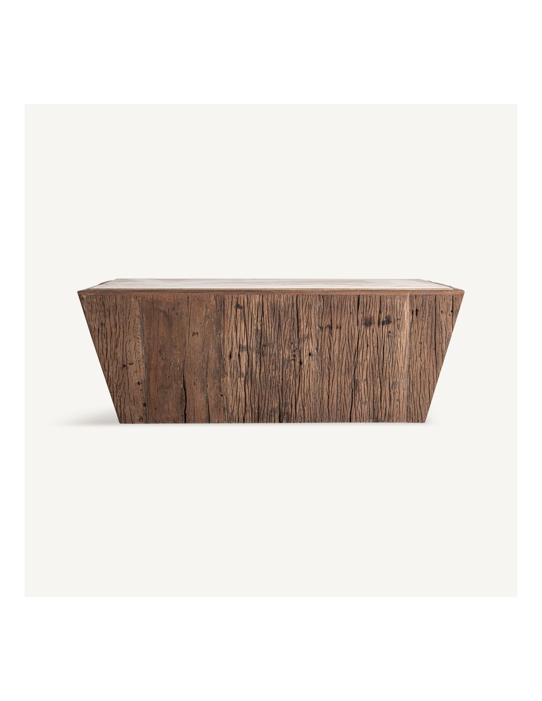 Mesa de centro de diseño Vical Home que combina madera recuperada en tono marrón envejecido con travertino beige satinado. Una pieza elegante y con carácter, perfecta para salones sofisticados que buscan un estilo natural y atemporal.