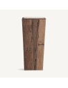 La estructura en madera recuperada con acabado envejecido aporta calidez y autenticidad, mientras que el sobre en travertino beige satinado introduce un contraste natural que eleva el nivel decorativo del ambiente.