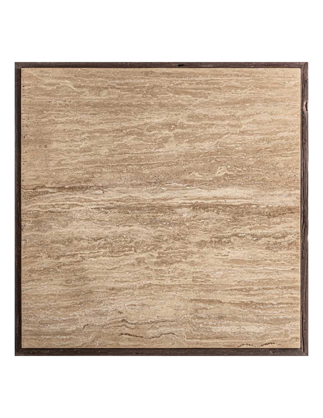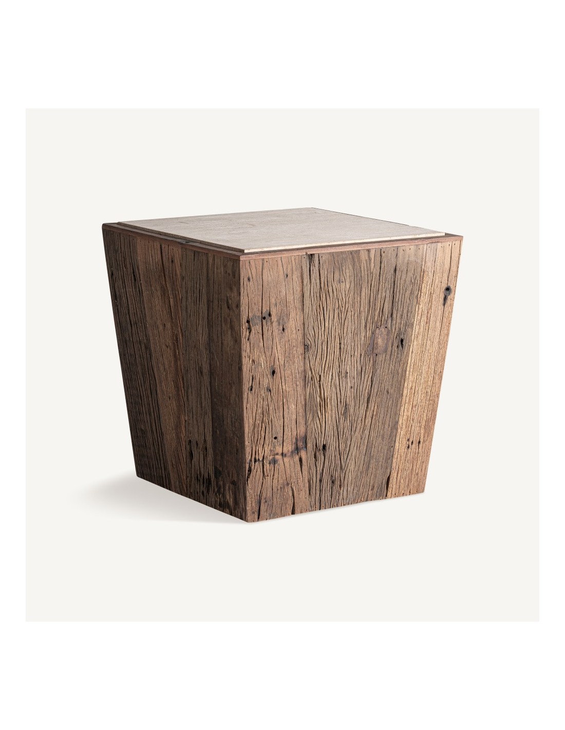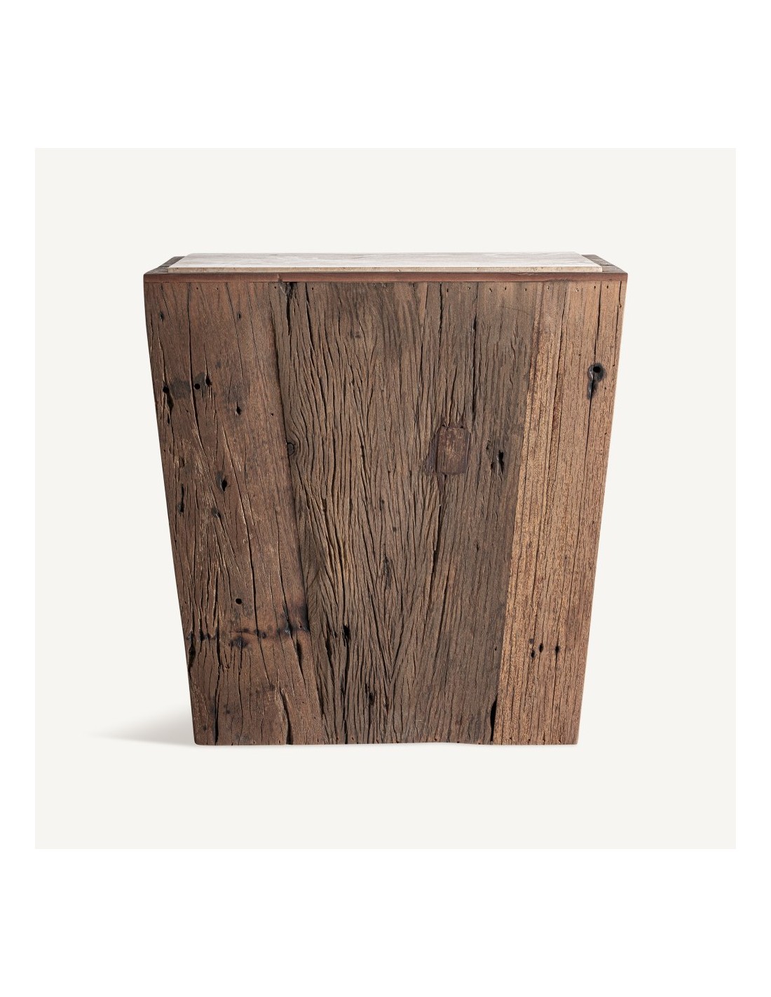 Mesa auxiliar de diseño Vical Home fabricada en madera recuperada con acabado marrón envejecido y sobre de travertino beige satinado. Una pieza elegante y versátil que aporta carácter natural y equilibrio visual al salón o zona de estar.